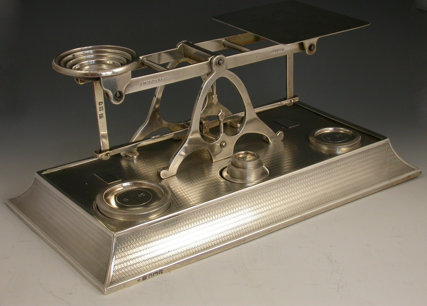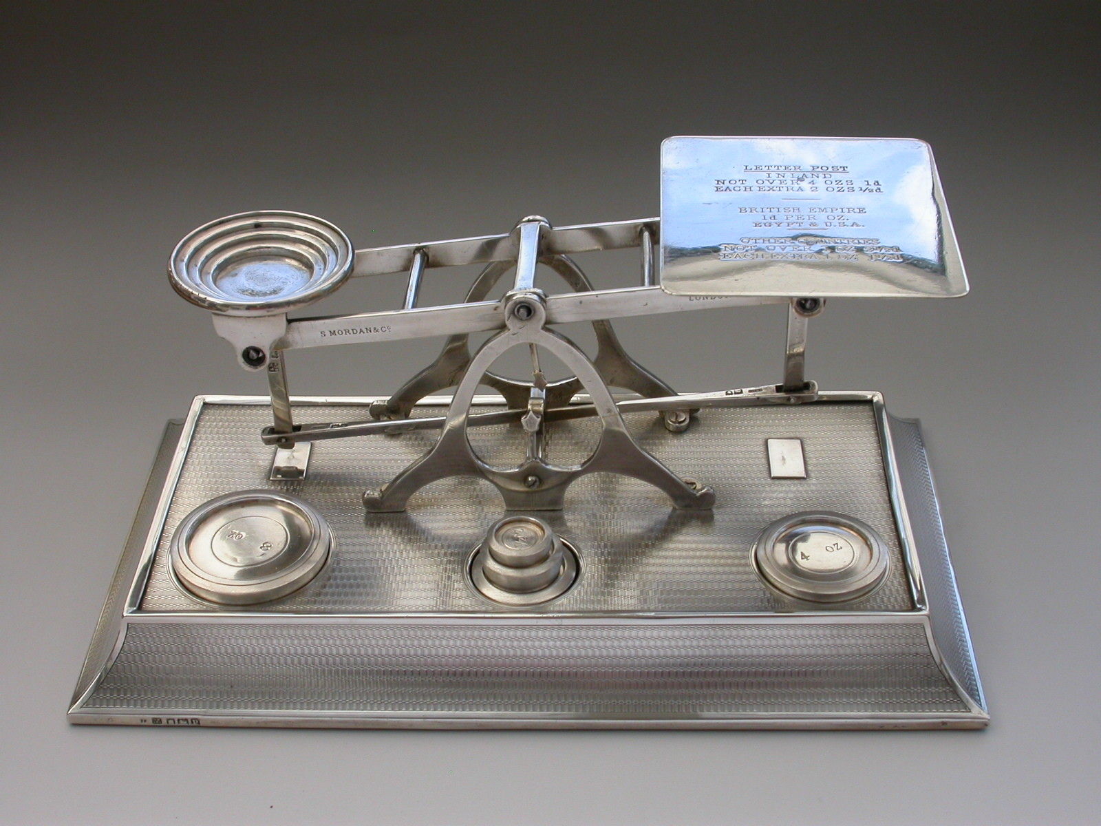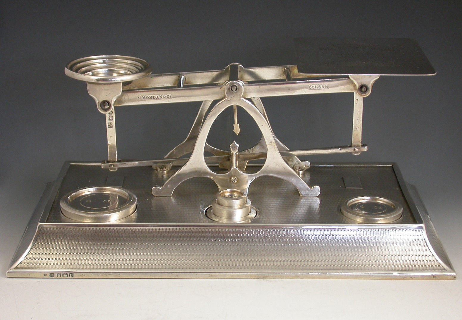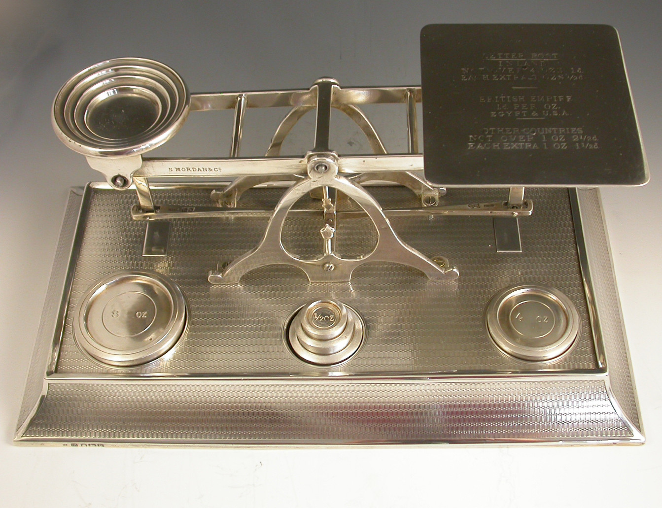 A rare set of Edwardian solid silver Postal Scales, the beam stamped 'S Mordan & Co, London', having a circular stepped pan at one end and square plate to the other, upon a pierced 'A' frame, all upon an engine turned silver pedestal base. Complete with set of five graduated weights. The plate engraved with postage rates for Inland, British Empire and Other Countries Letter Post rates.