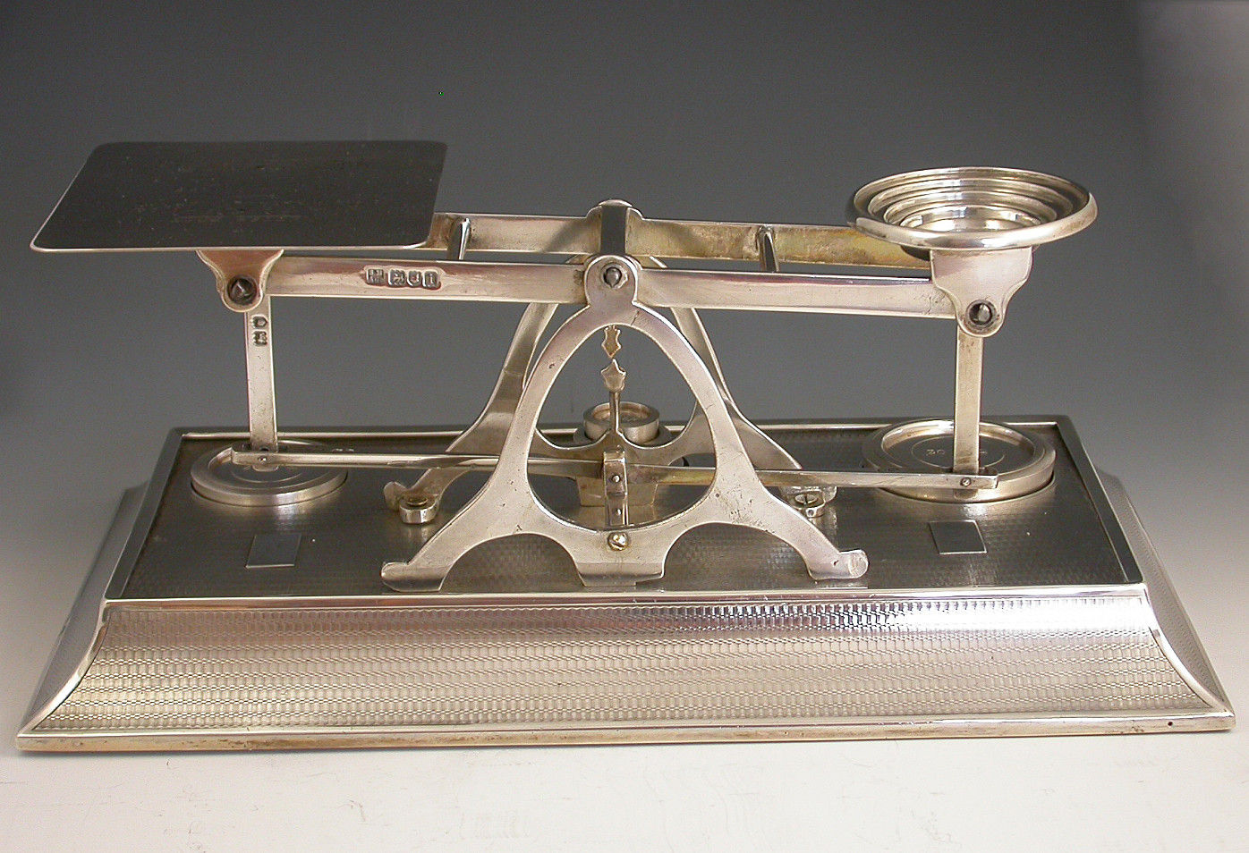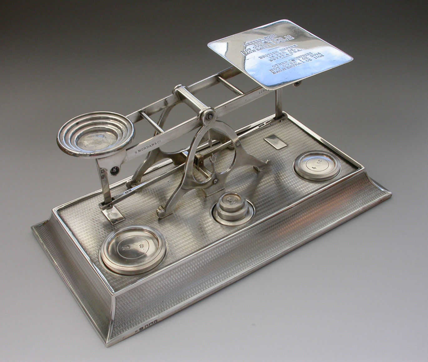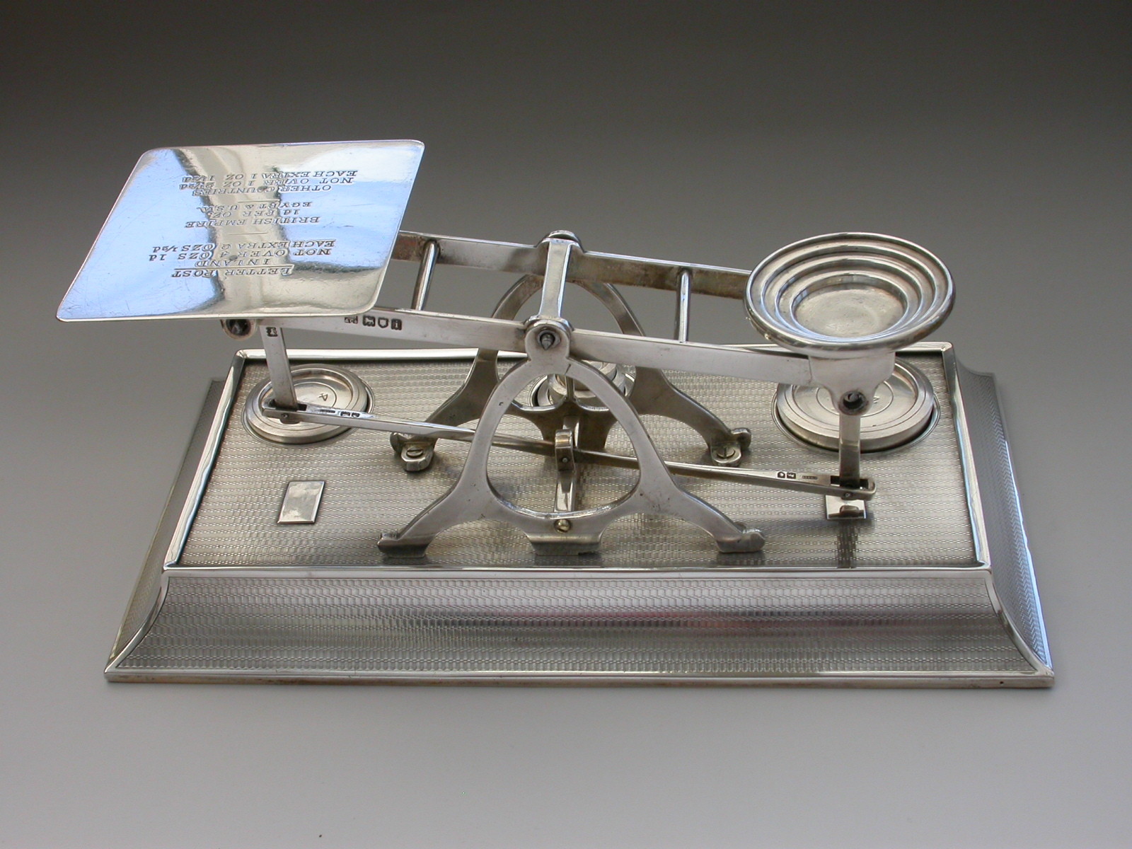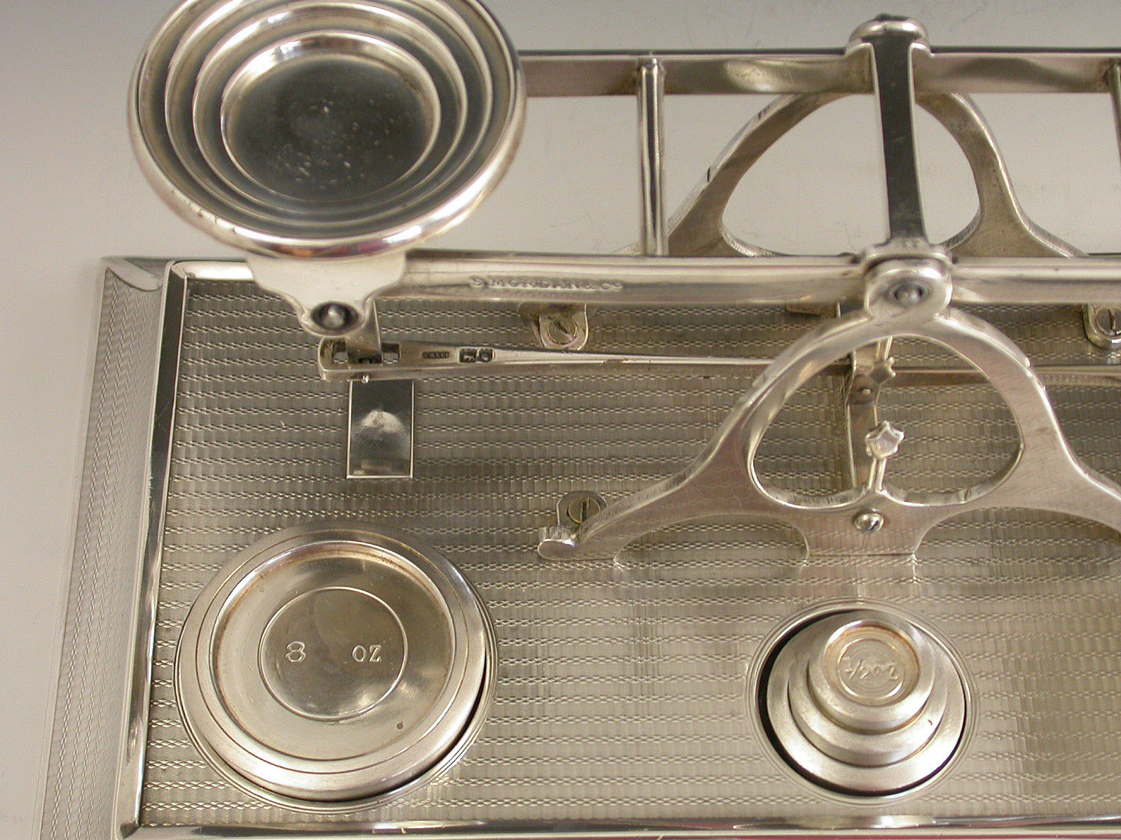 A rare set of Edwardian solid silver Postal Scales, the beam stamped 'S Mordan & Co, London', having a circular stepped pan at one end and square plate to the other, upon a pierced 'A' frame, all upon an engine turned silver pedestal base. Complete with set of five graduated weights. The plate engraved with postage rates for Inland, British Empire and Other Countries Letter Post rates.