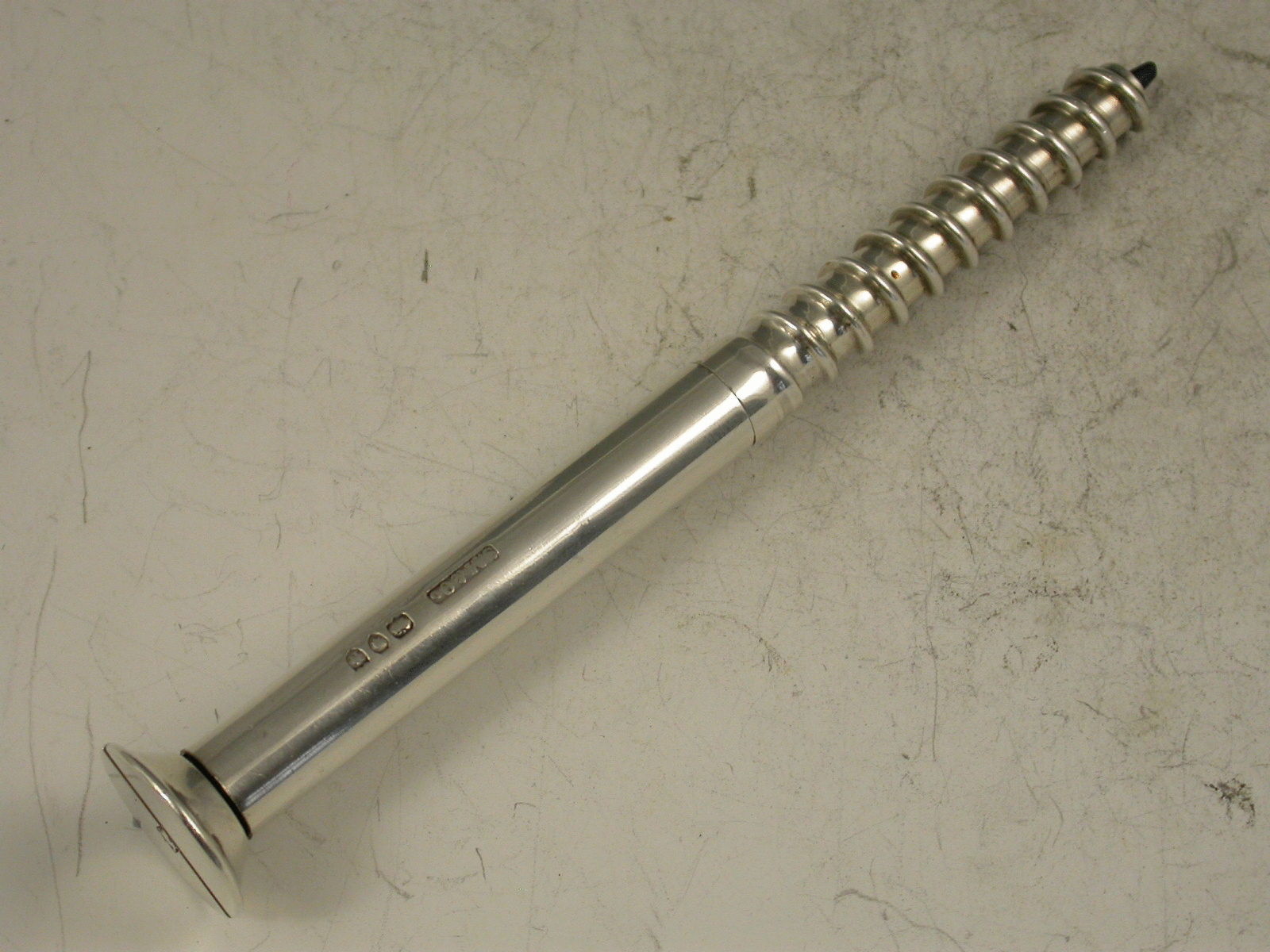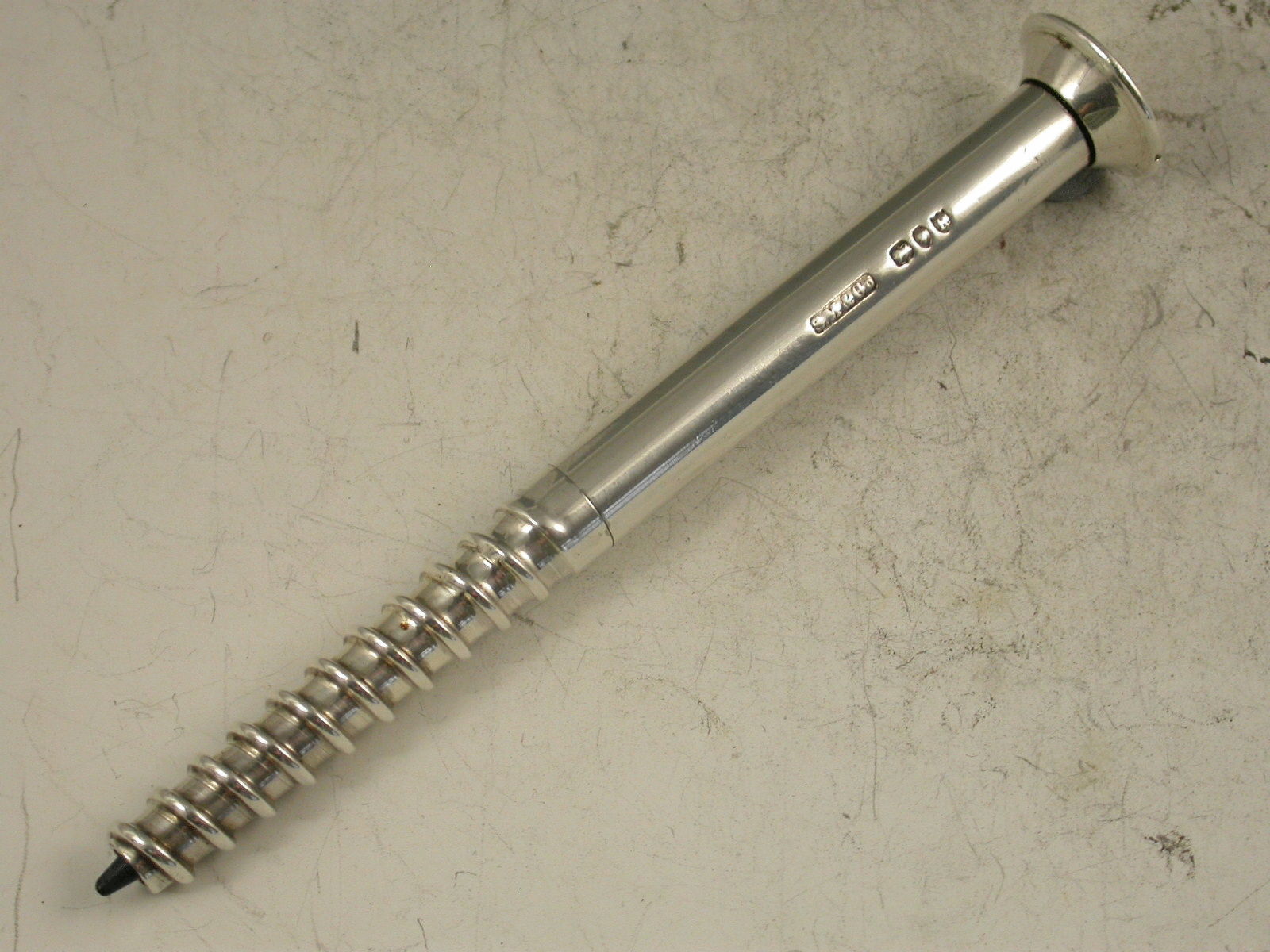 An extremely rare Victorian novelty silver Propelling Pencil in the form of a large size wood screw. The large diameter lead propelling and (unusually) repelling by turning the head of the screw.