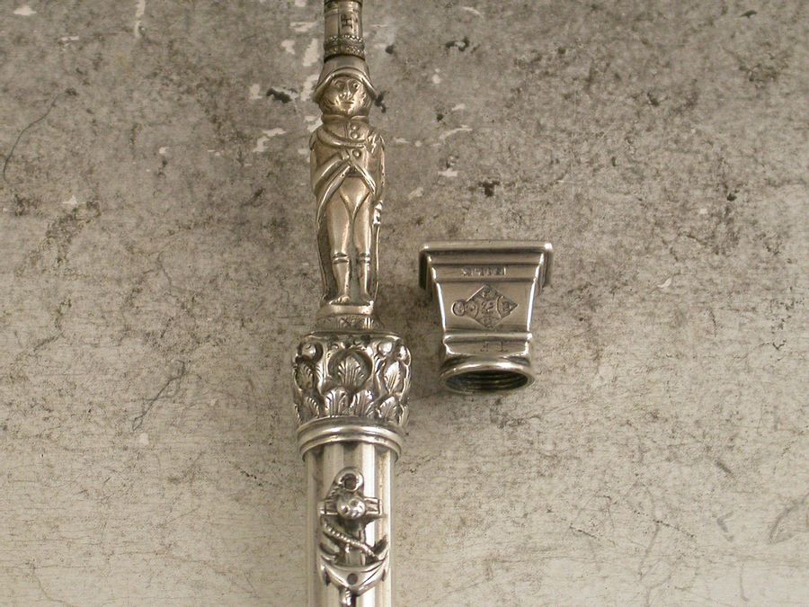 An extremely rare early Victorian silver Propelling Pencil made in the form of Nelson’s Column. The slider button formed as a fouled anchor. The screw-off top revealing a lead reserve and set with a citrine seal stone. The plinth stamped with the owners name: 'Jos Wood' and engraved with a diamond registration mark for the 30th January 1844. Also stamped with four of Nelson’s most famous Victories – Trafalgar, Nile, St Vincent and Copenhagen.