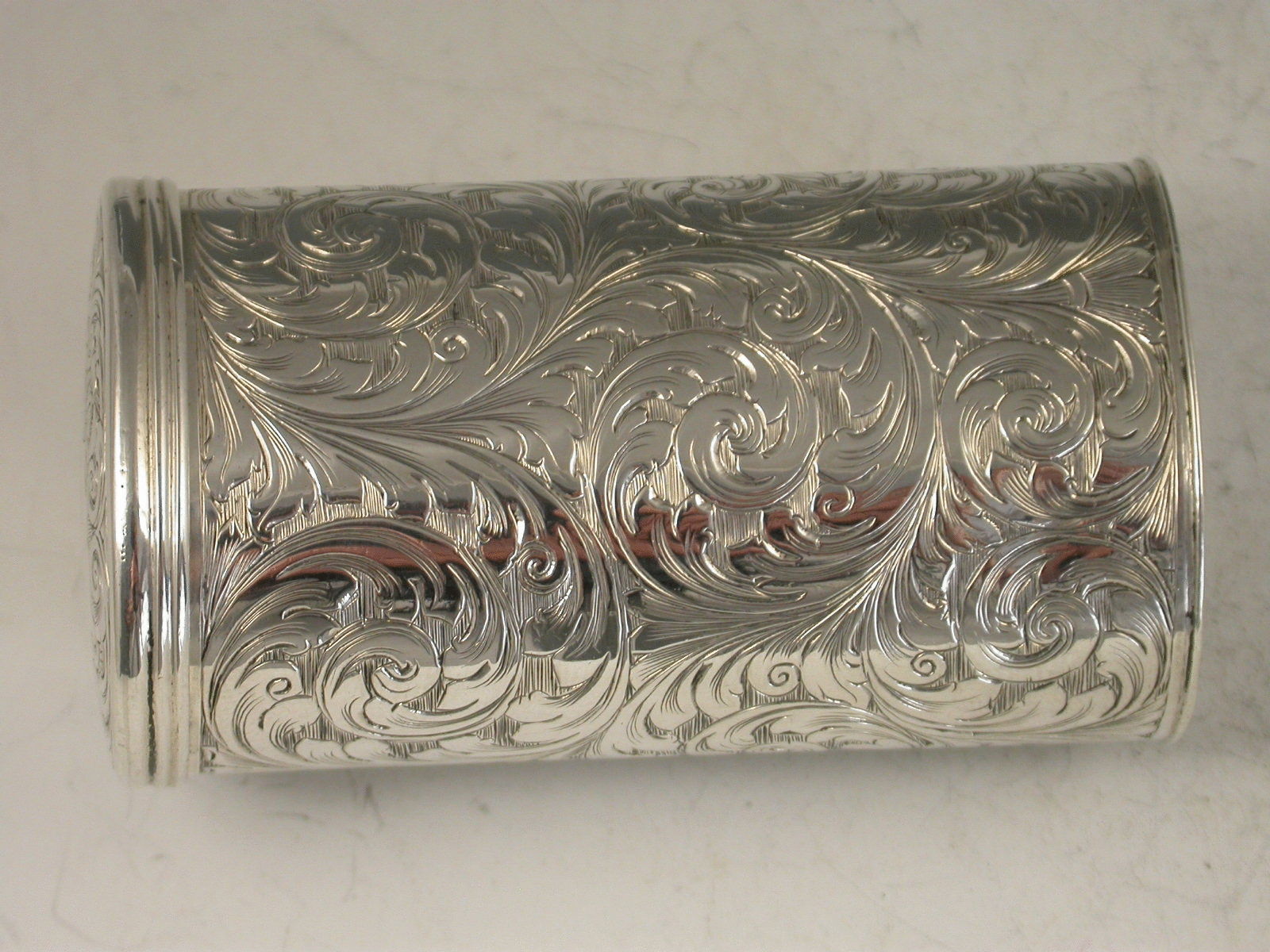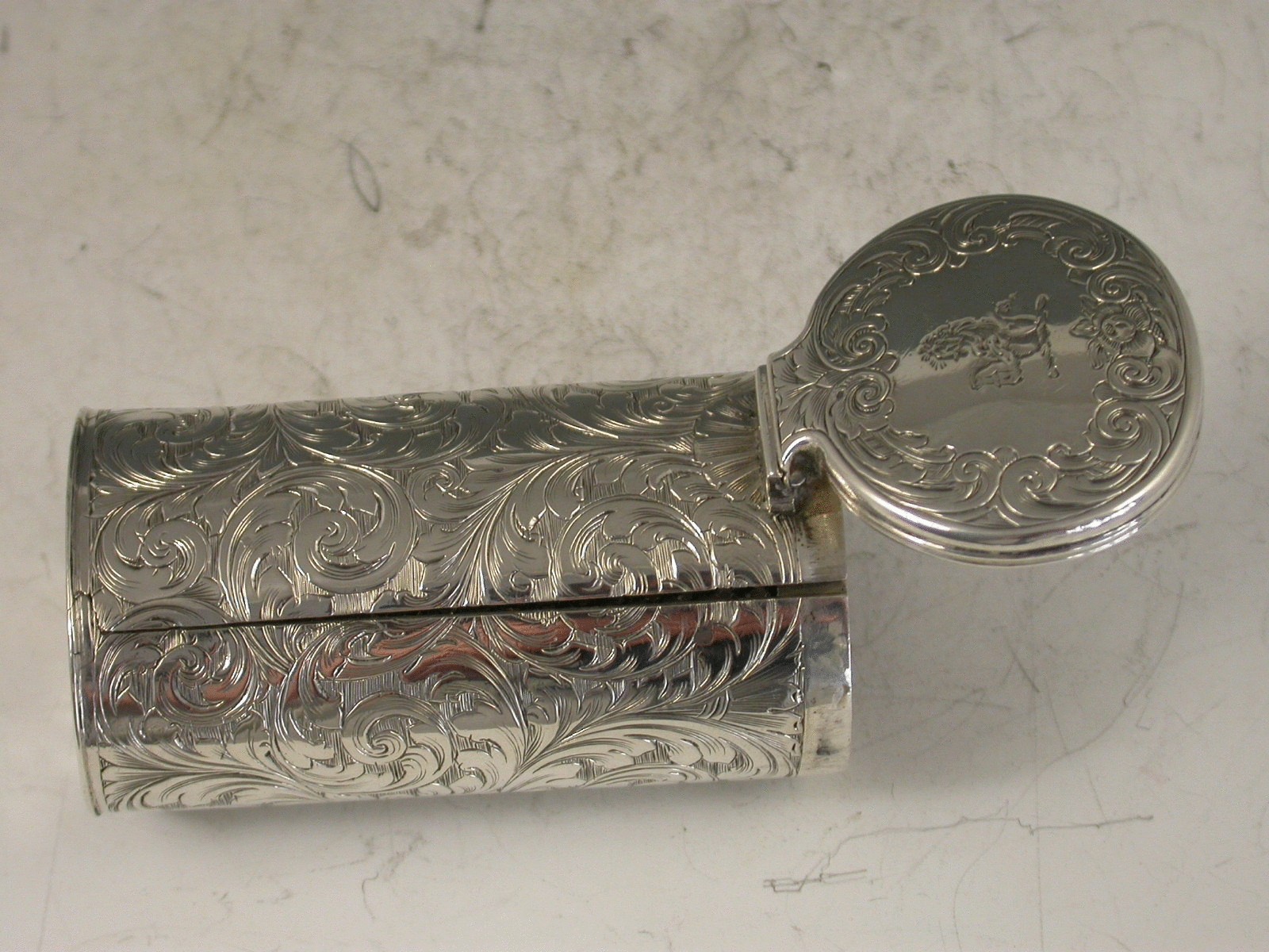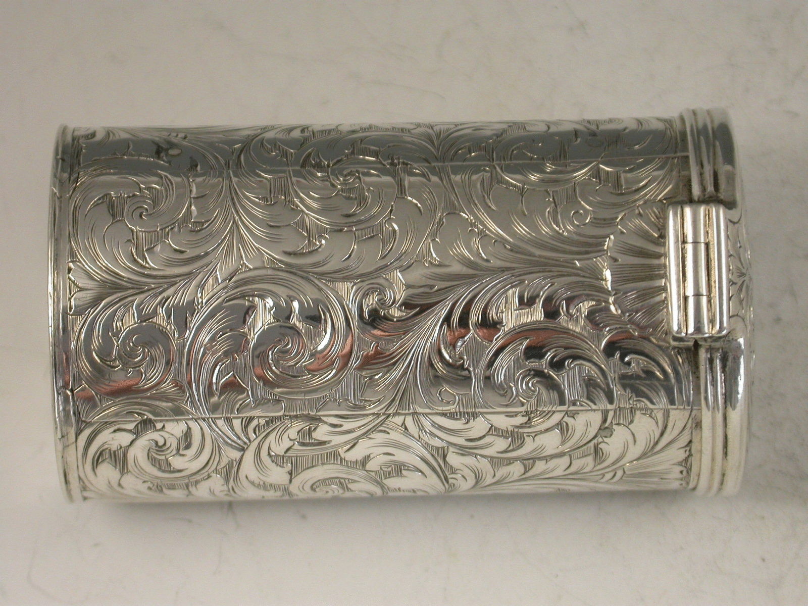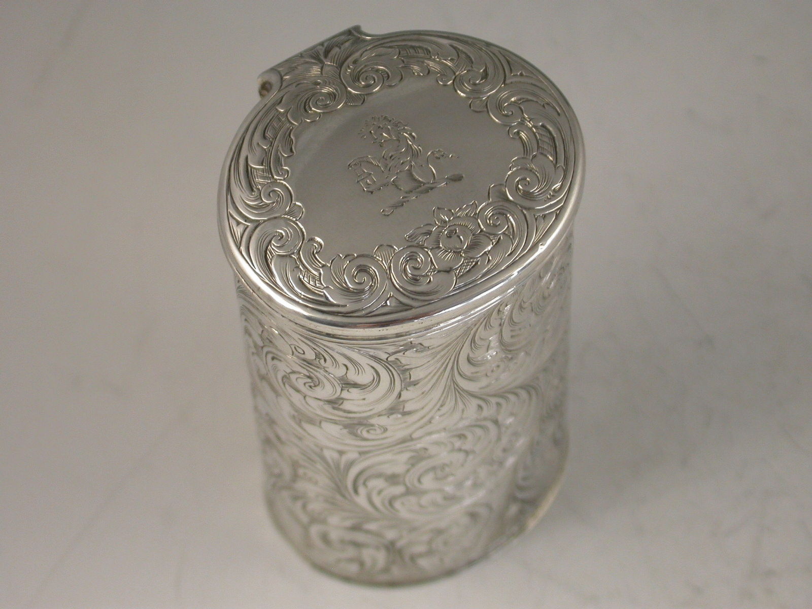 An extremely fine and rare Victorian silver Table Nutmeg Grater of oval cylindrical form, allover engraved with foliate scroll decoration, the hinged front opens to reveal the steel grater, the hinged cover engraved with a crest.