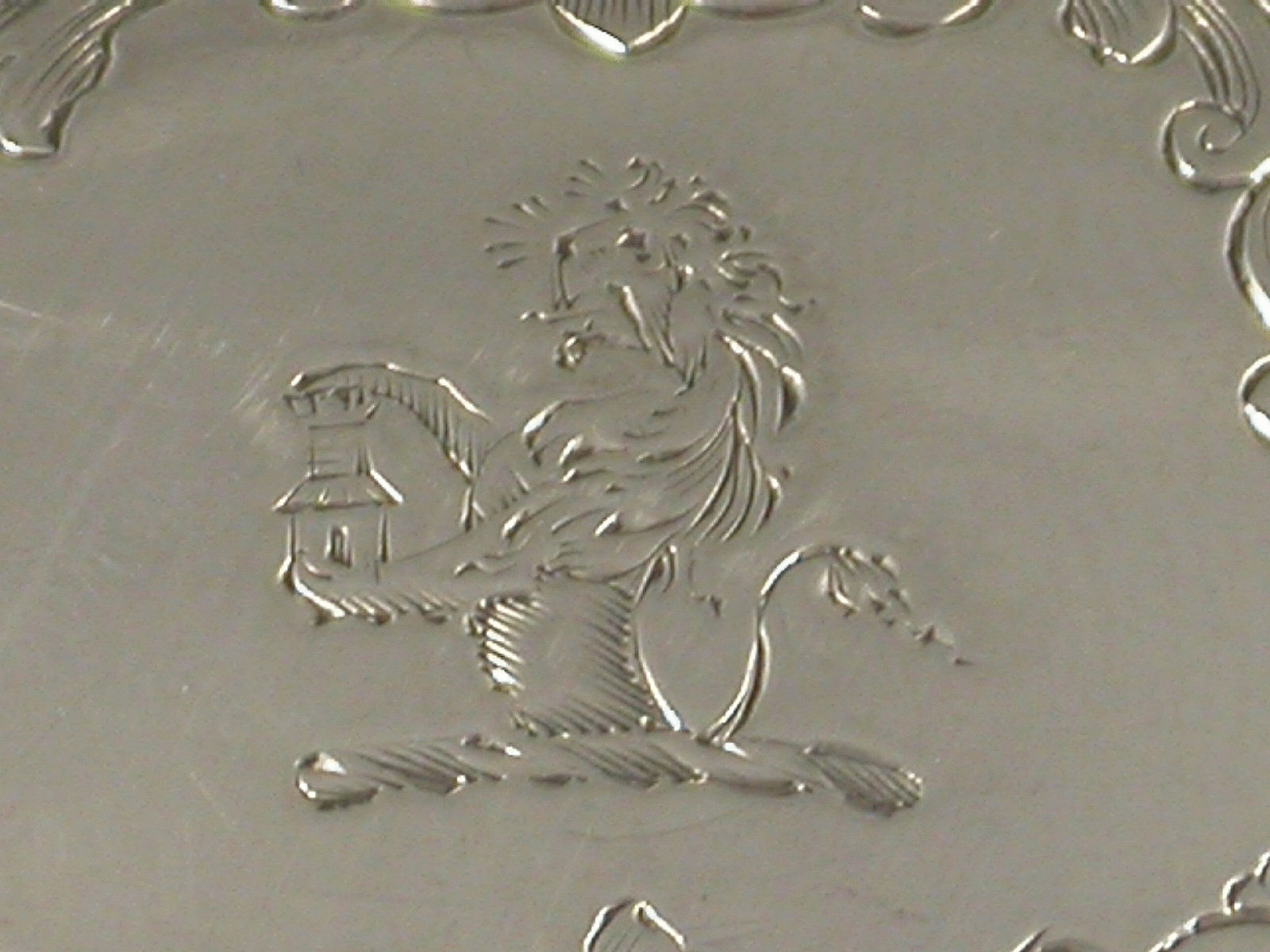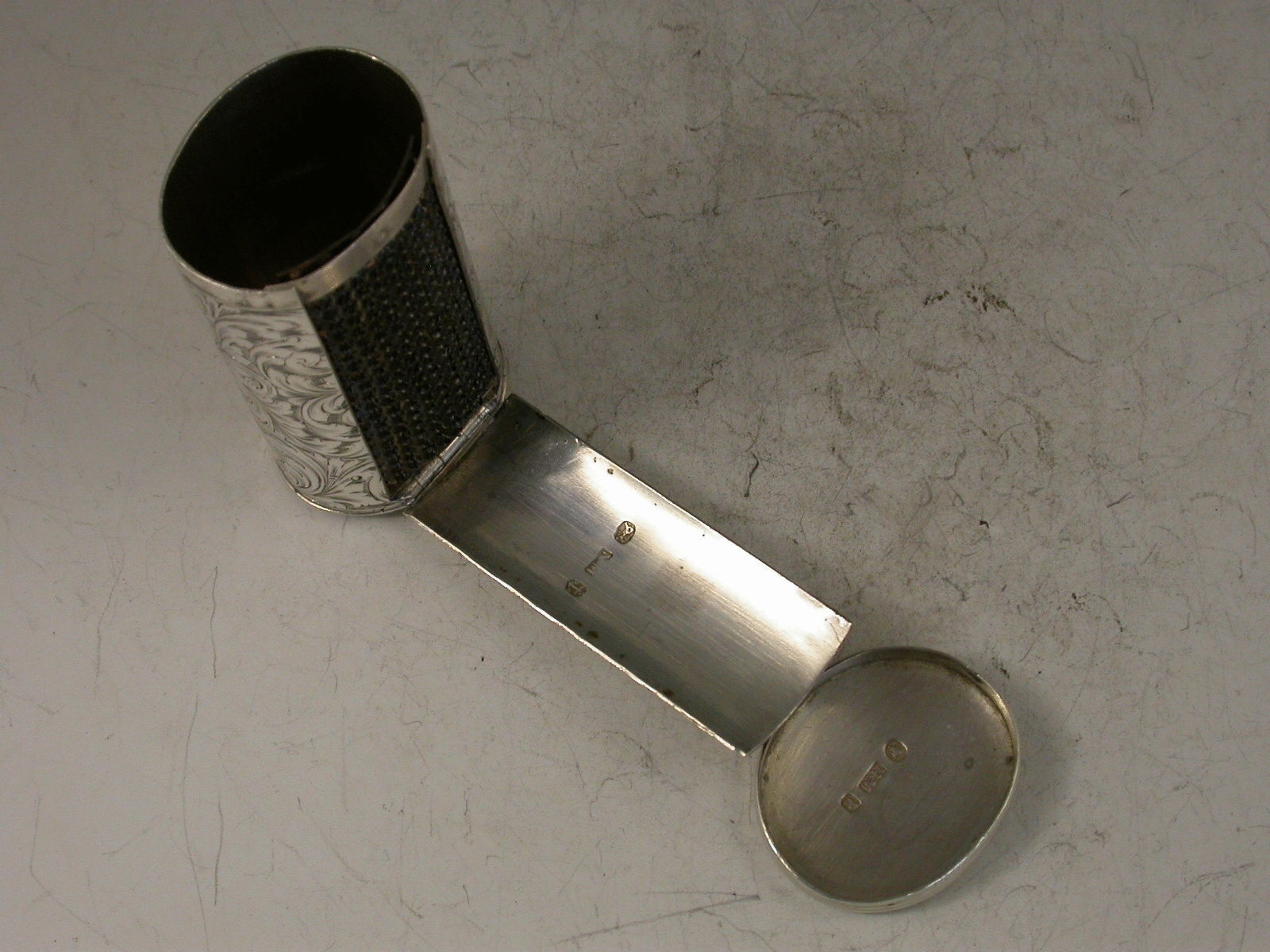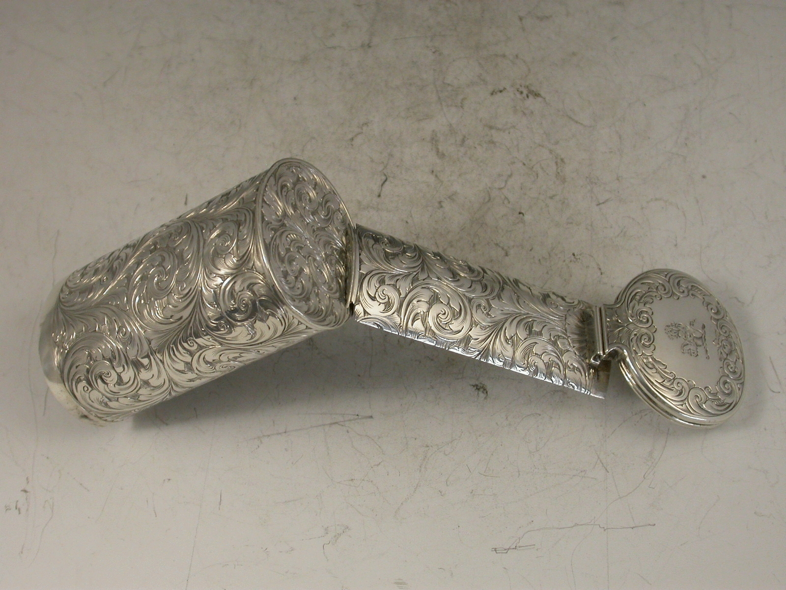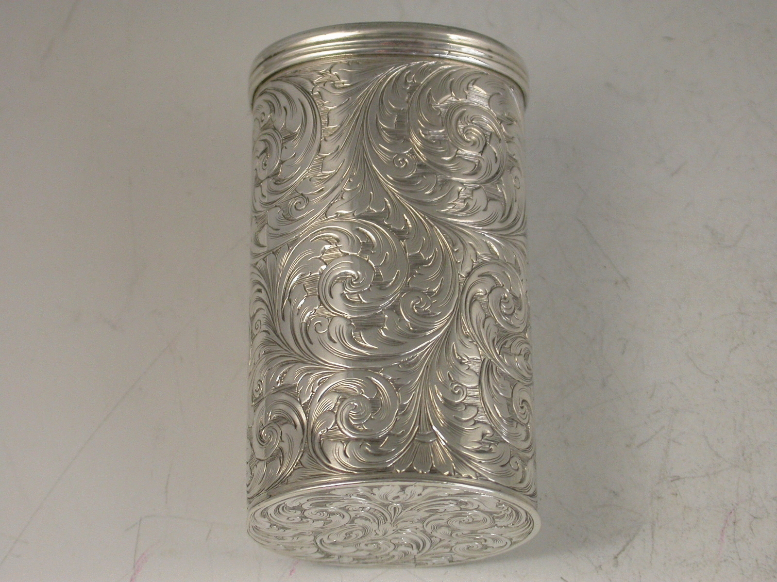 An extremely fine and rare Victorian silver Table Nutmeg Grater of oval cylindrical form, allover engraved with foliate scroll decoration, the hinged front opens to reveal the steel grater, the hinged cover engraved with a crest.