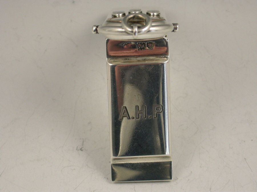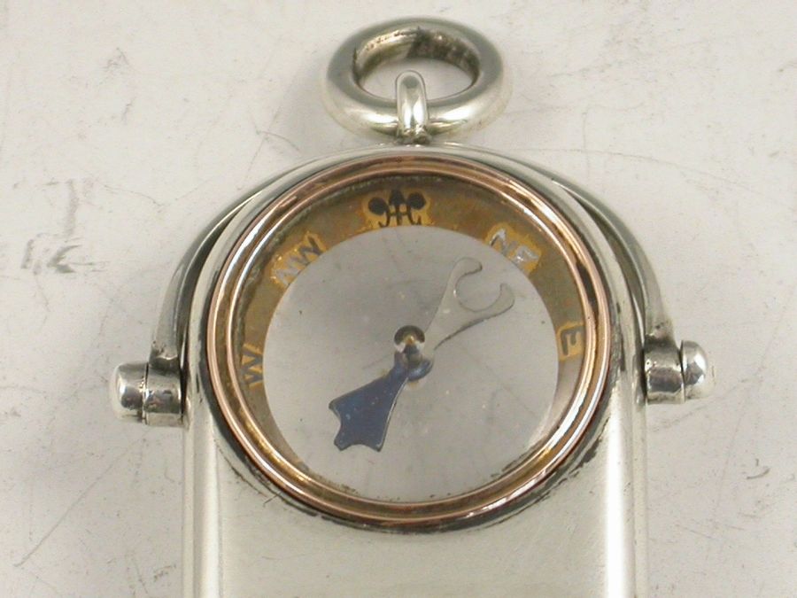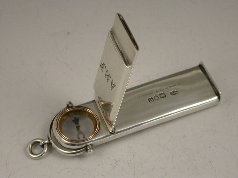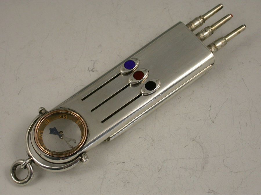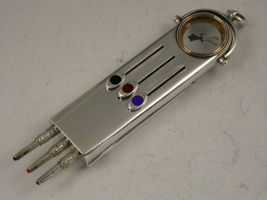 An extremely rare Victorian silver combination item made up of three coloured sliding pencils with enamelled buttons housed within a rounded rectangular case with hinged whistle to the reverse, the top with inset glass covered metal compass, attached stirrup shape suspension ring, the whistle engraved with contemporary initials A.H.P.