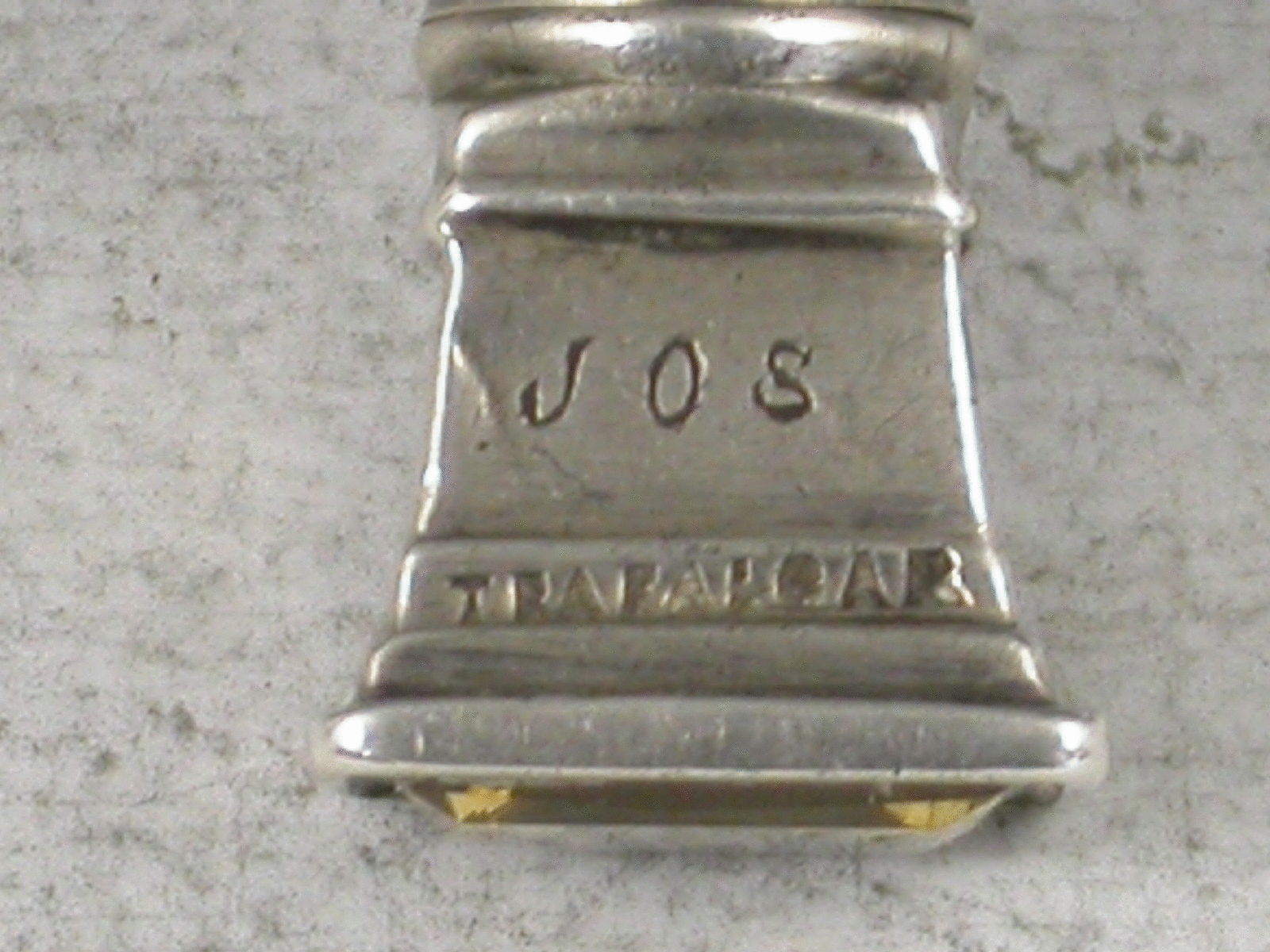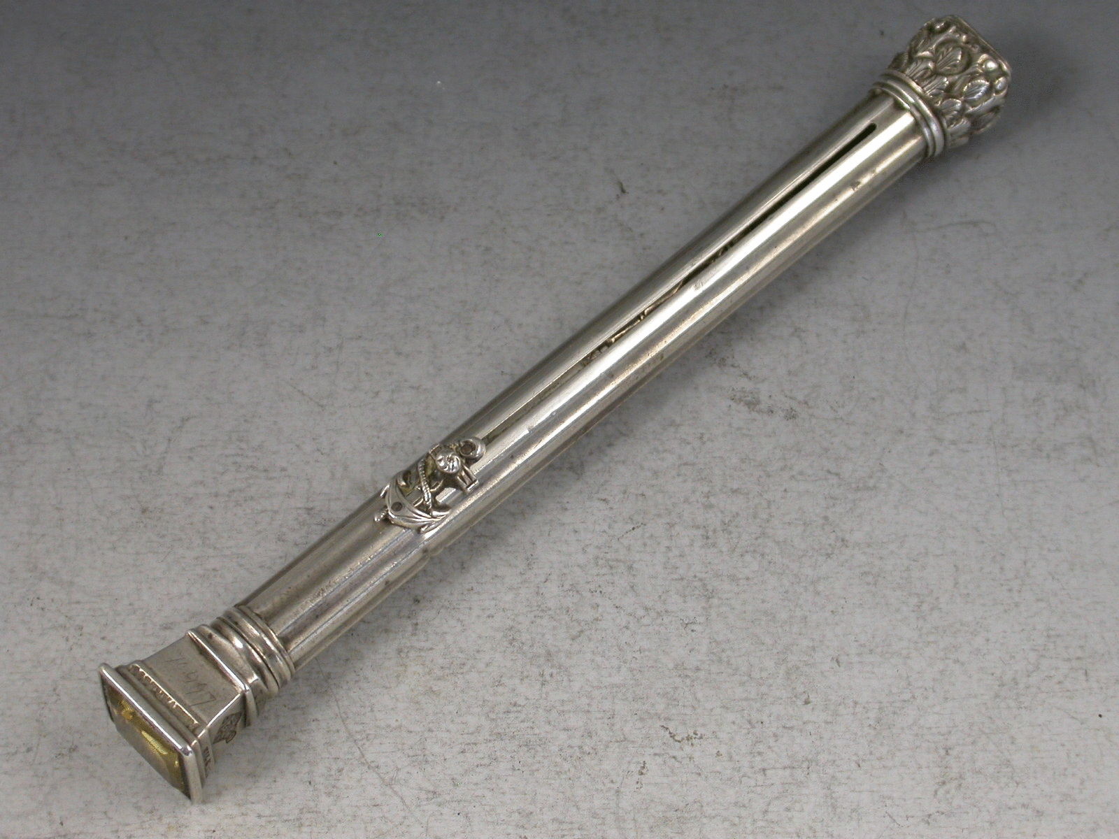 An extremely rare early Victorian silver Propelling Pencil made in the form of Nelson’s Column. The slider button formed as a fouled anchor. The screw off top revealing a lead reserve and set with a citrine seal stone. The plinth stamped with the makers mark Jos Wood and a diamond registration mark for the 30th January 1844. Also stamped with four of Nelson’s most famous Victories – Trafalgar, Nile, St Vincent and Copenhagen.