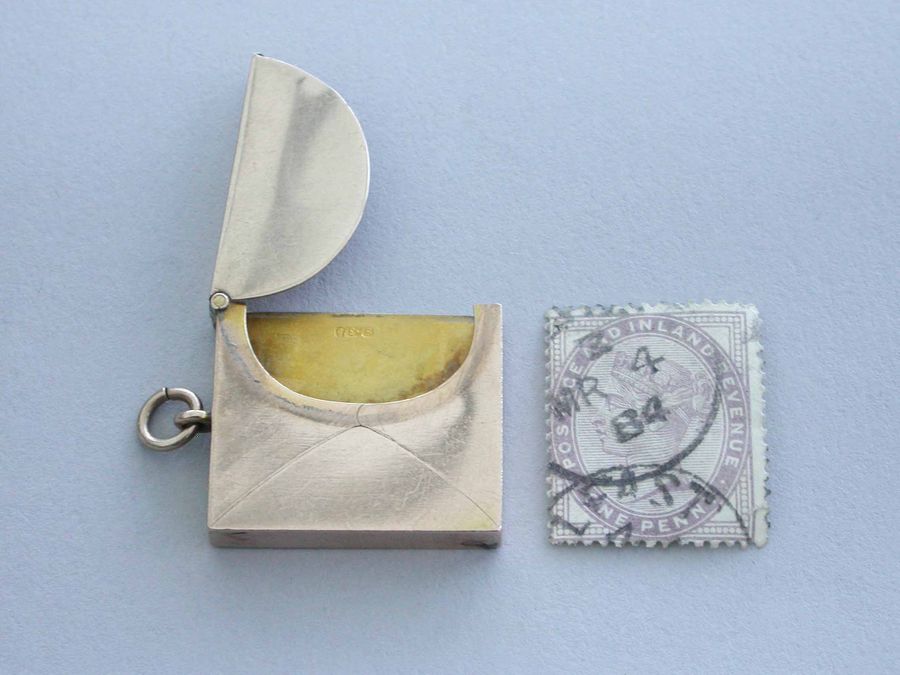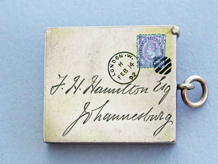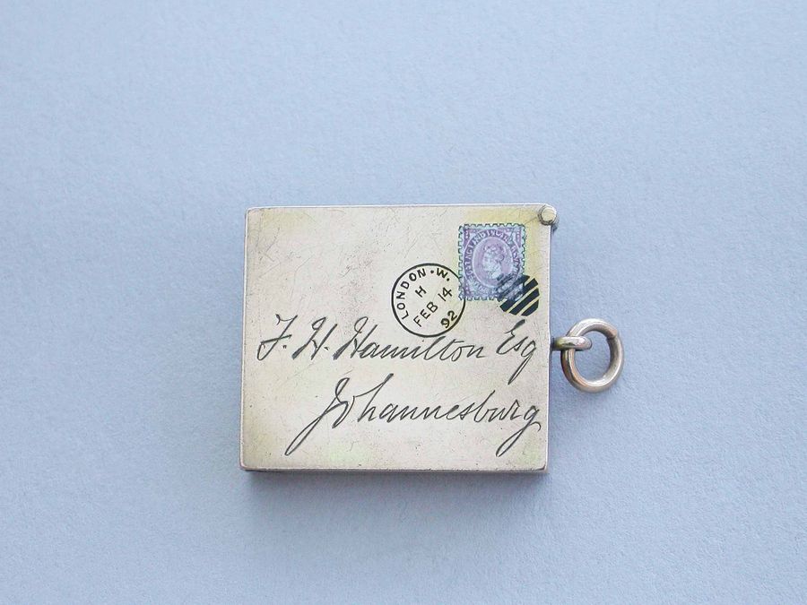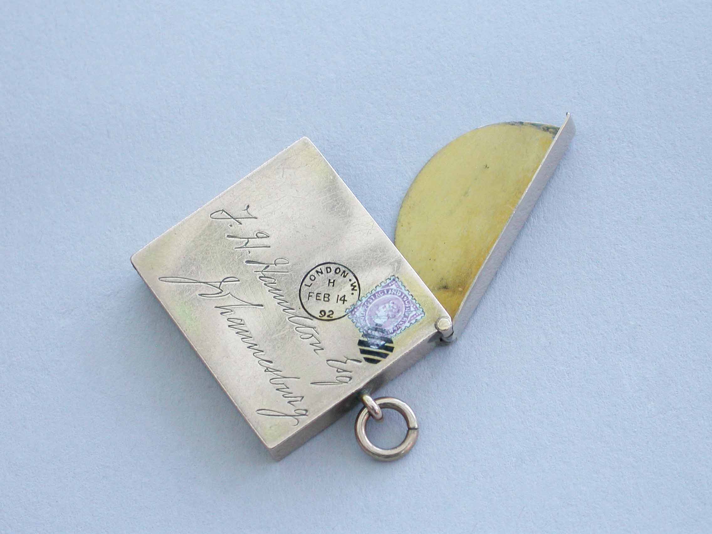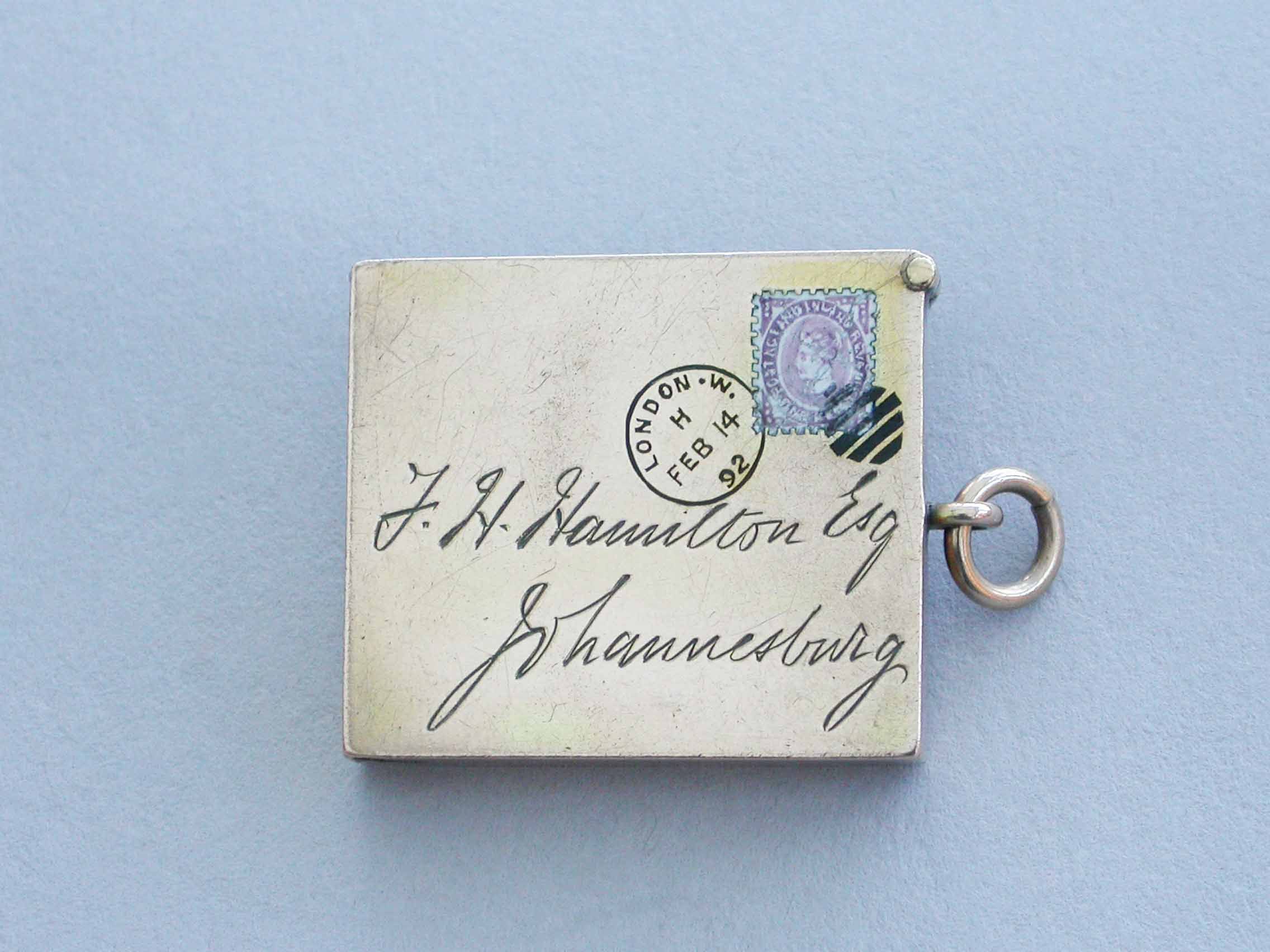 A rare Victorian 9 carat gold novelty Stamp Case made in the form of an envelope, with hinged lid and attached suspension ring, the face engraved with the owners name - J. H. Hamilton Esq, Johannesburg, and with enamel one penny lilac stamp cancelled and dated in London, February 14th 1892.