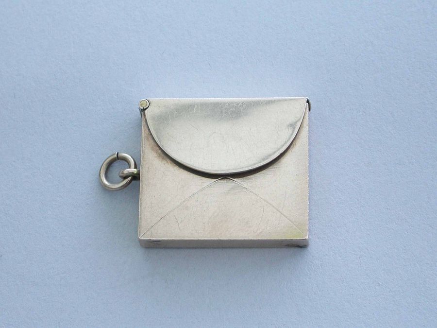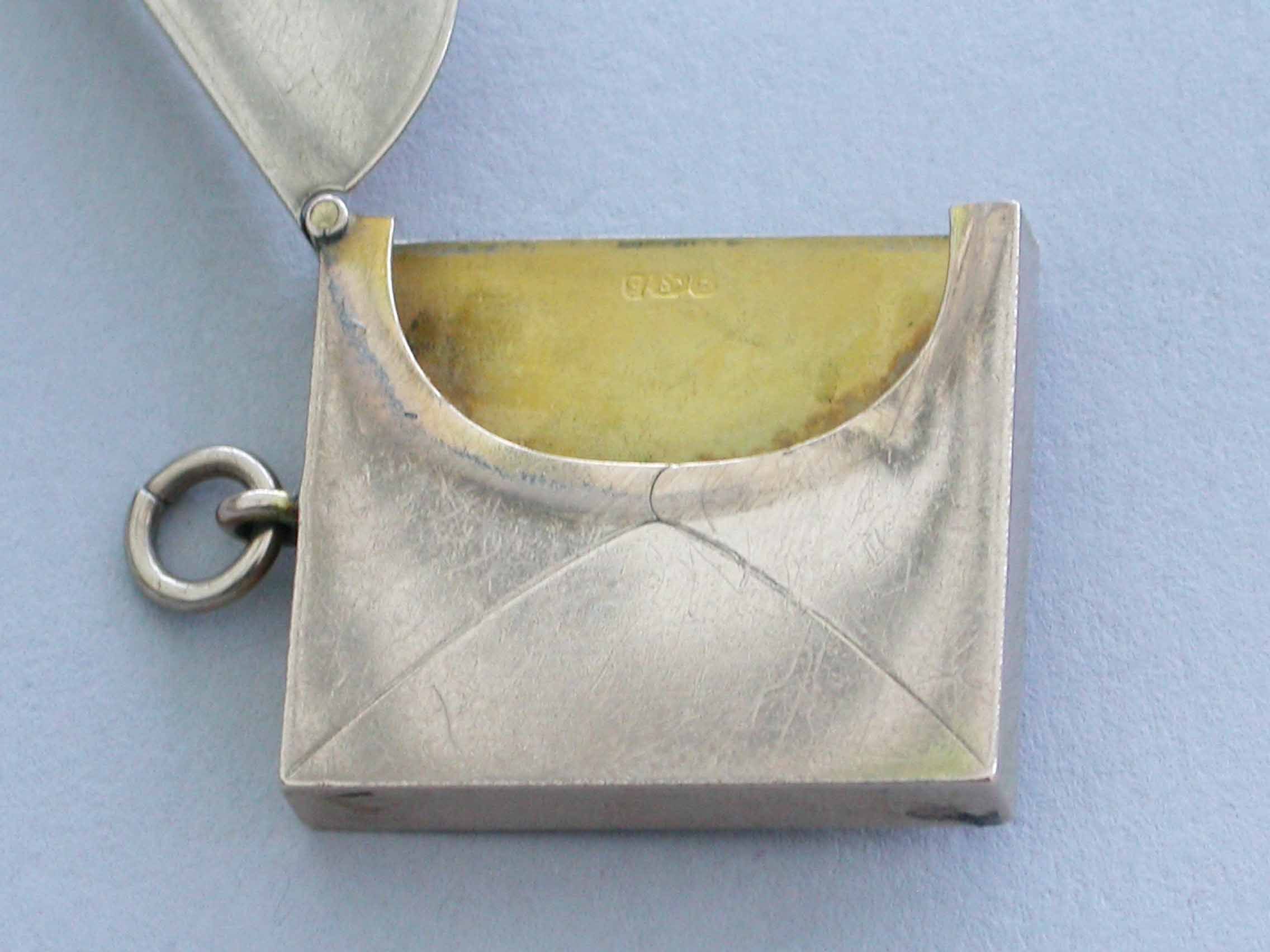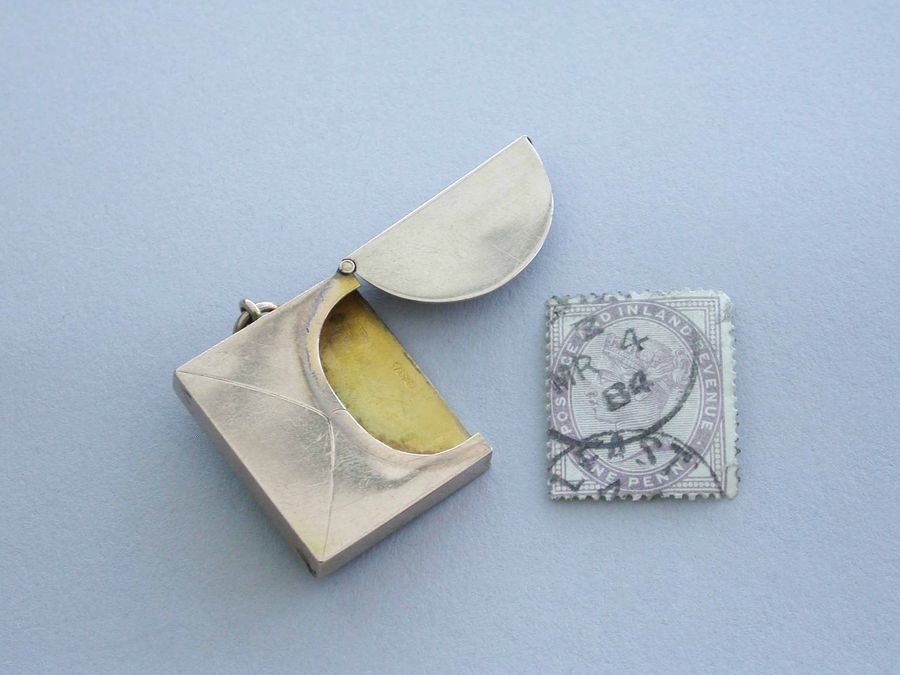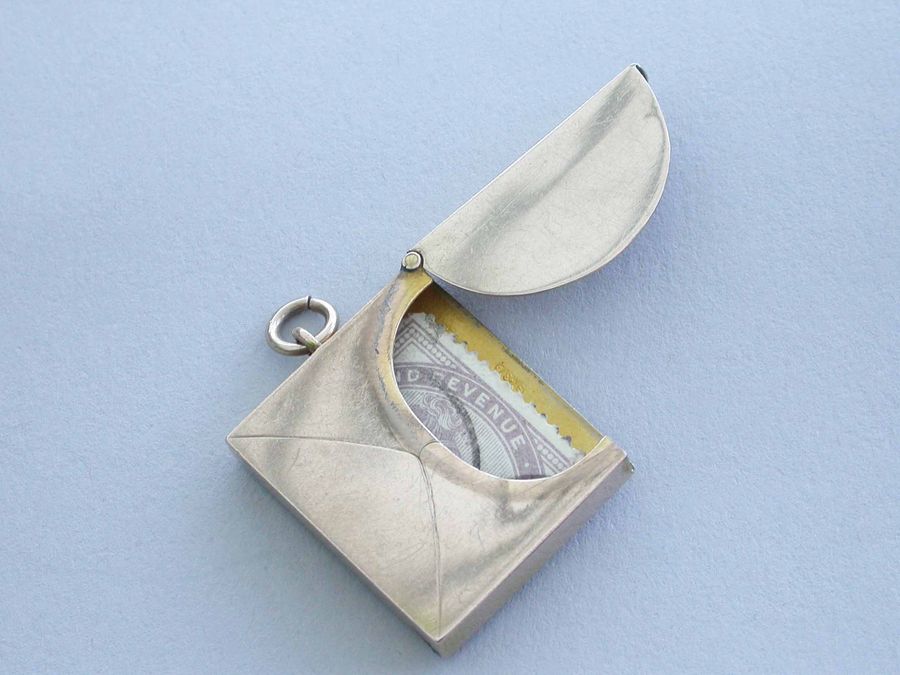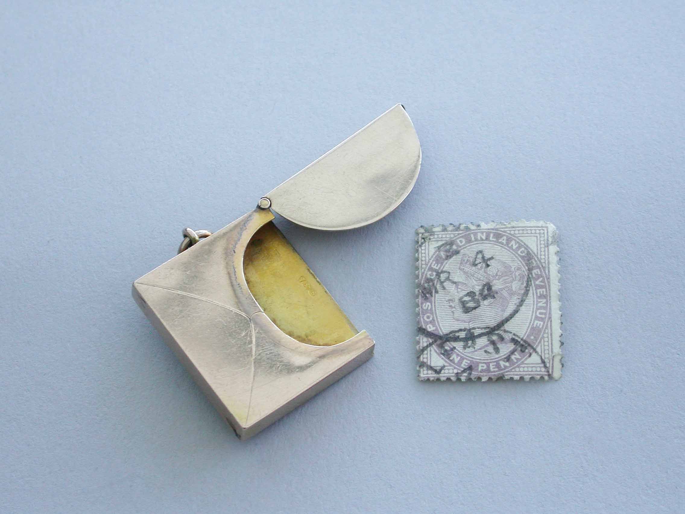 A rare Victorian 9 carat gold novelty Stamp Case made in the form of an envelope, with hinged lid and attached suspension ring, the face engraved with the owners name - J. H. Hamilton Esq, Johannesburg, and with enamel one penny lilac stamp cancelled and dated in London, February 14th 1892.