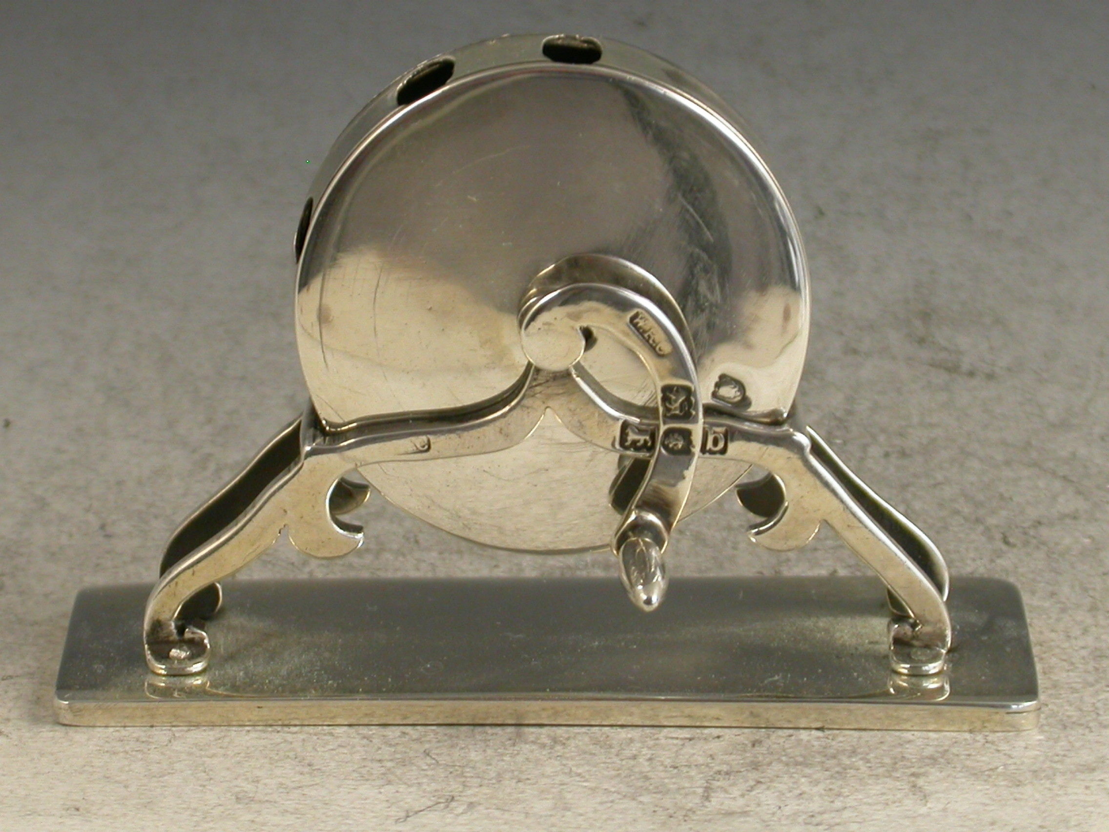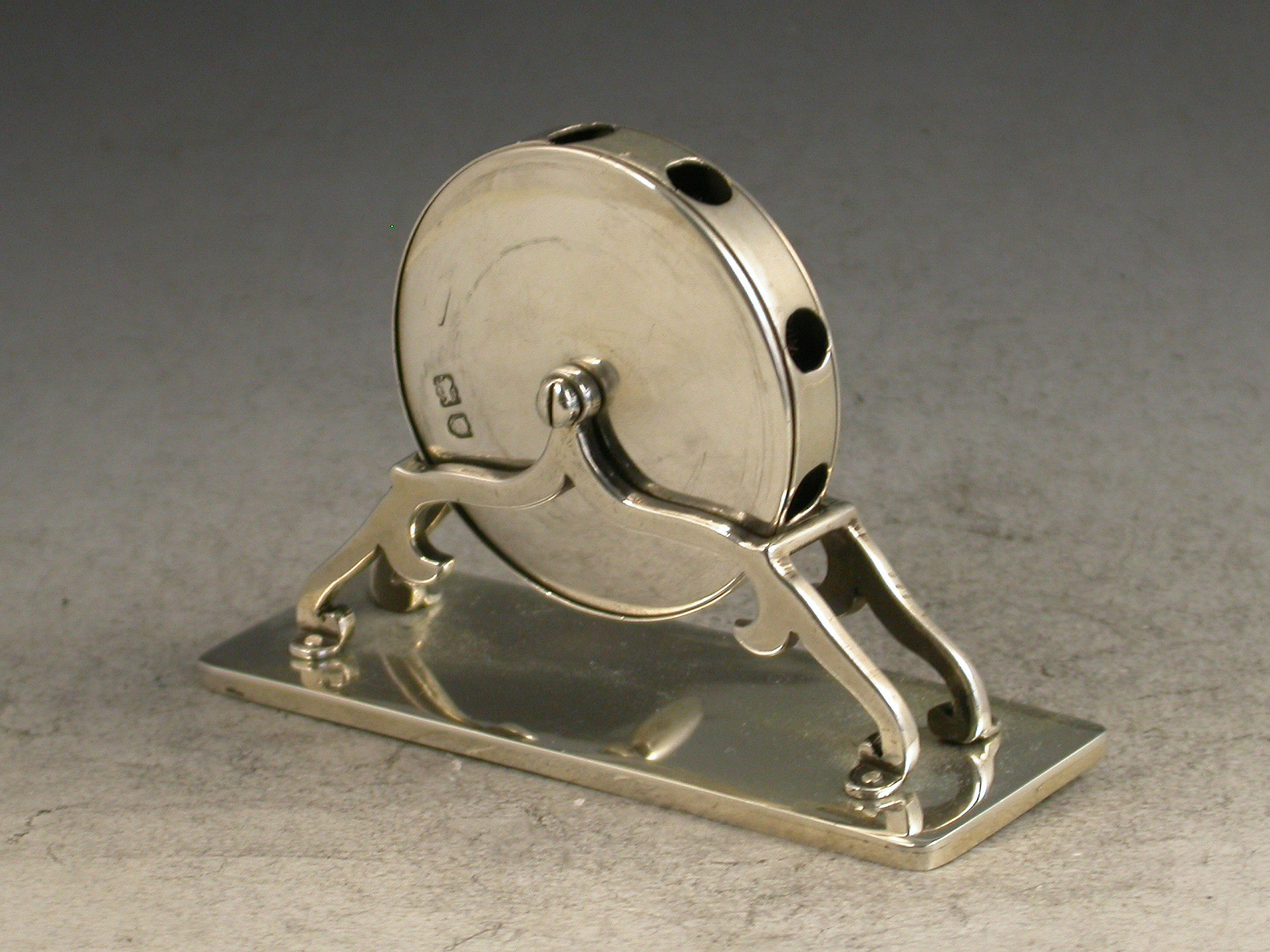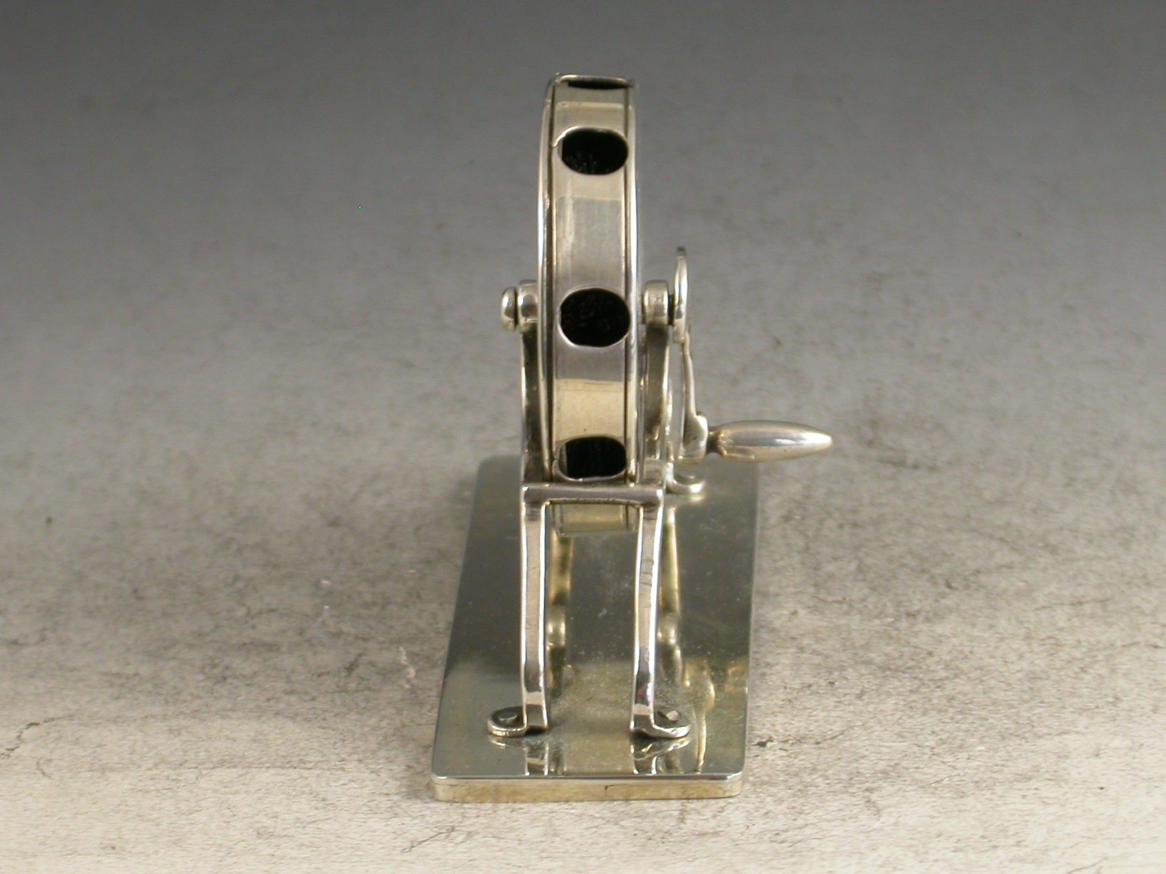 An extremely rare and unusual Victorian novelty silver Pen Wipe made in the form of a miniature ""Kent Rotary Knife Sharpener"", standing on plain rectangular base. The silver handle when turned rotates the brushes inside the silver drum in order to clean the nib.
