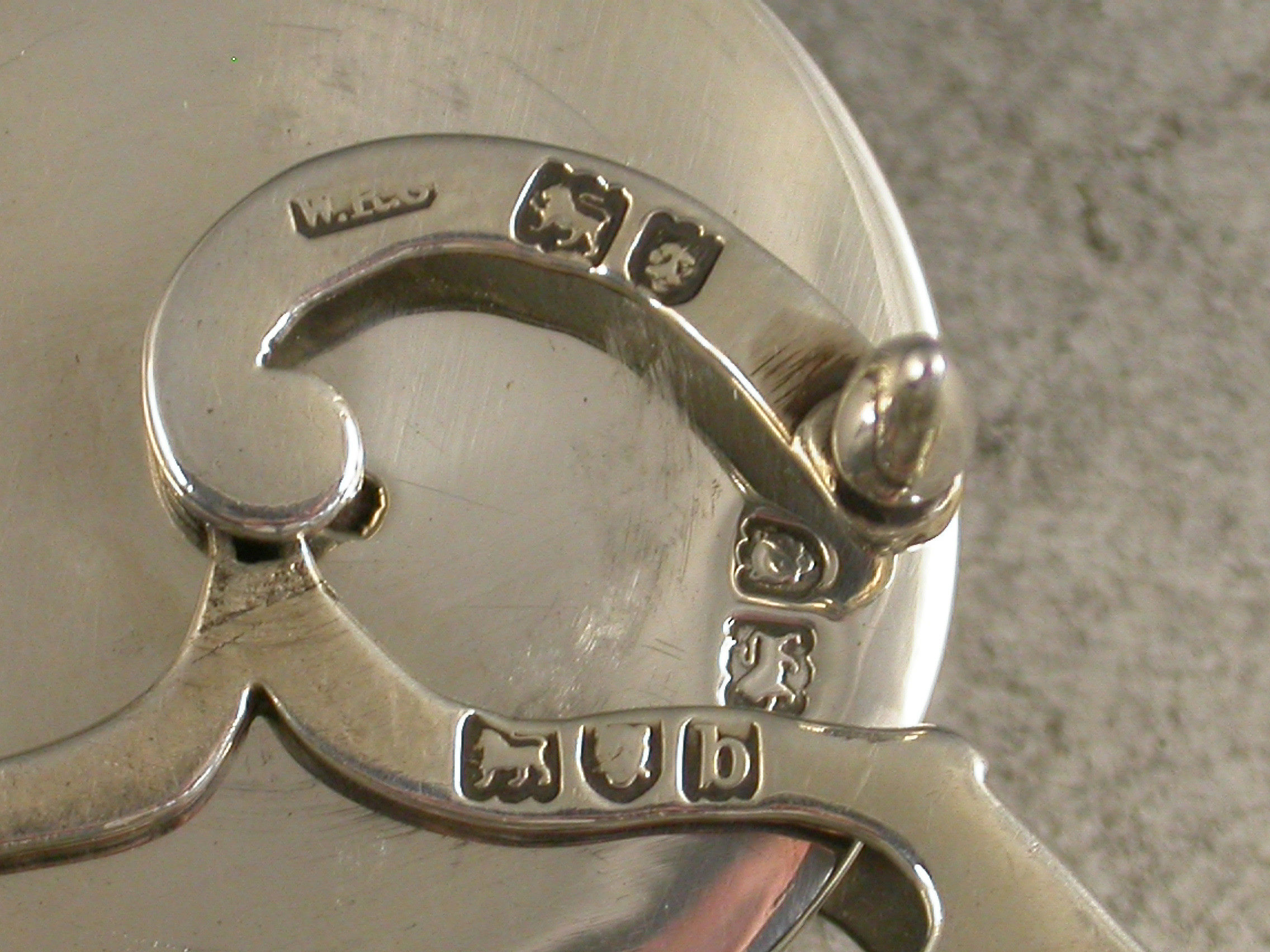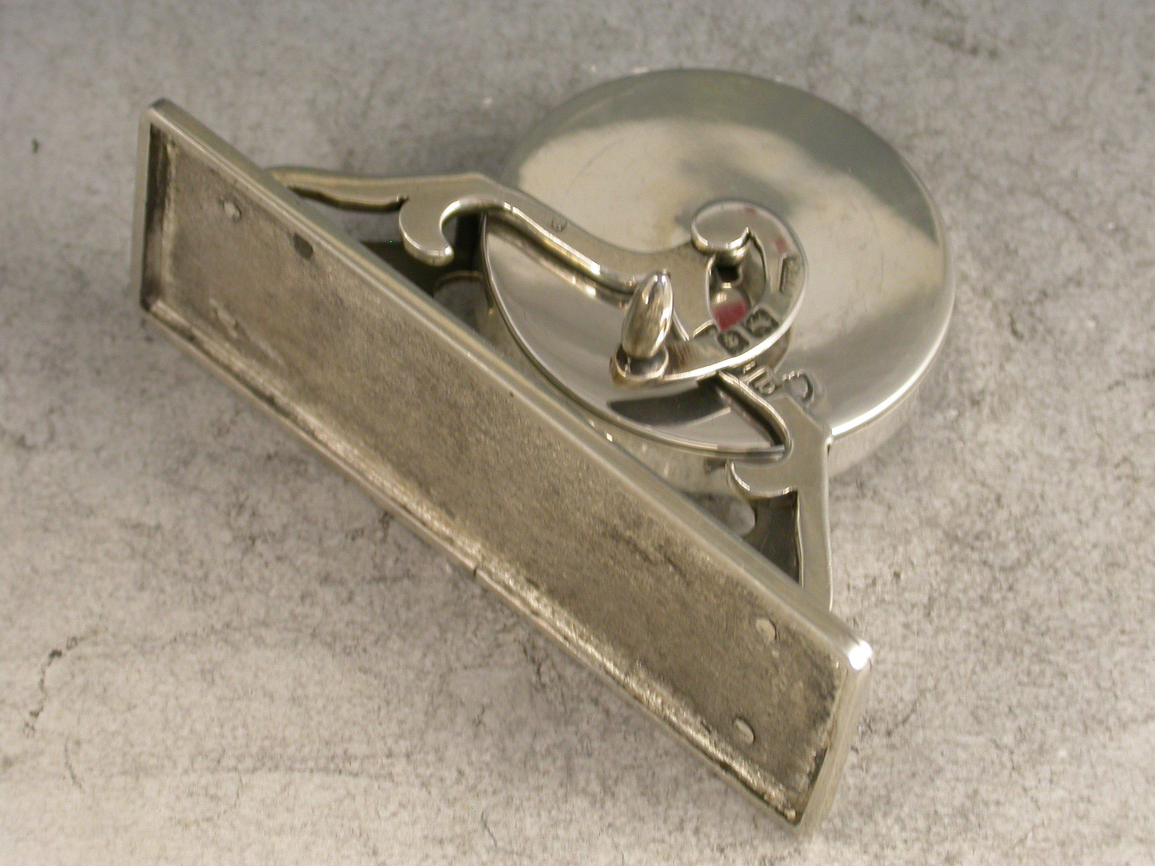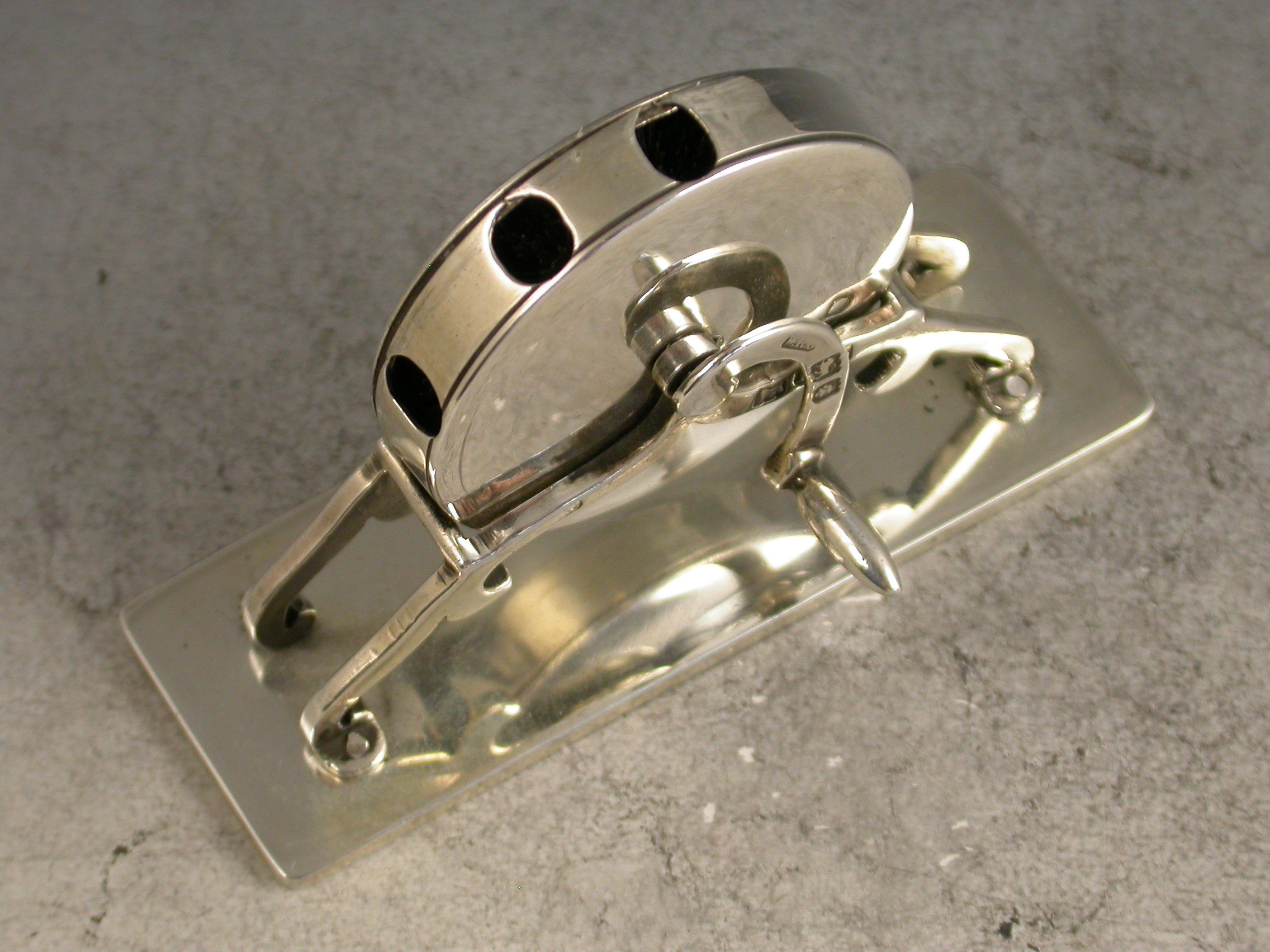 An extremely rare and unusual Victorian novelty silver Pen Wipe made in the form of a miniature ""Kent Rotary Knife Sharpener"", standing on plain rectangular base. The silver handle when turned rotates the brushes inside the silver drum in order to clean the nib.