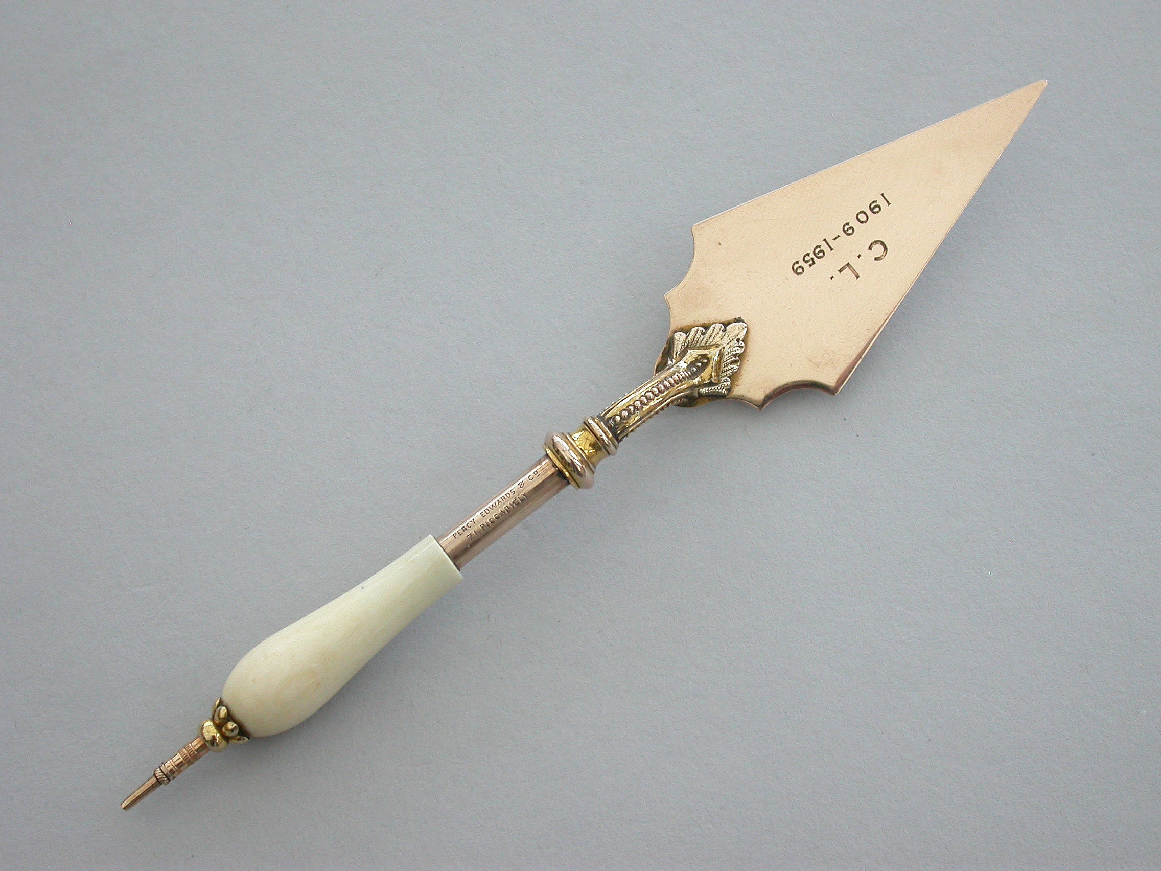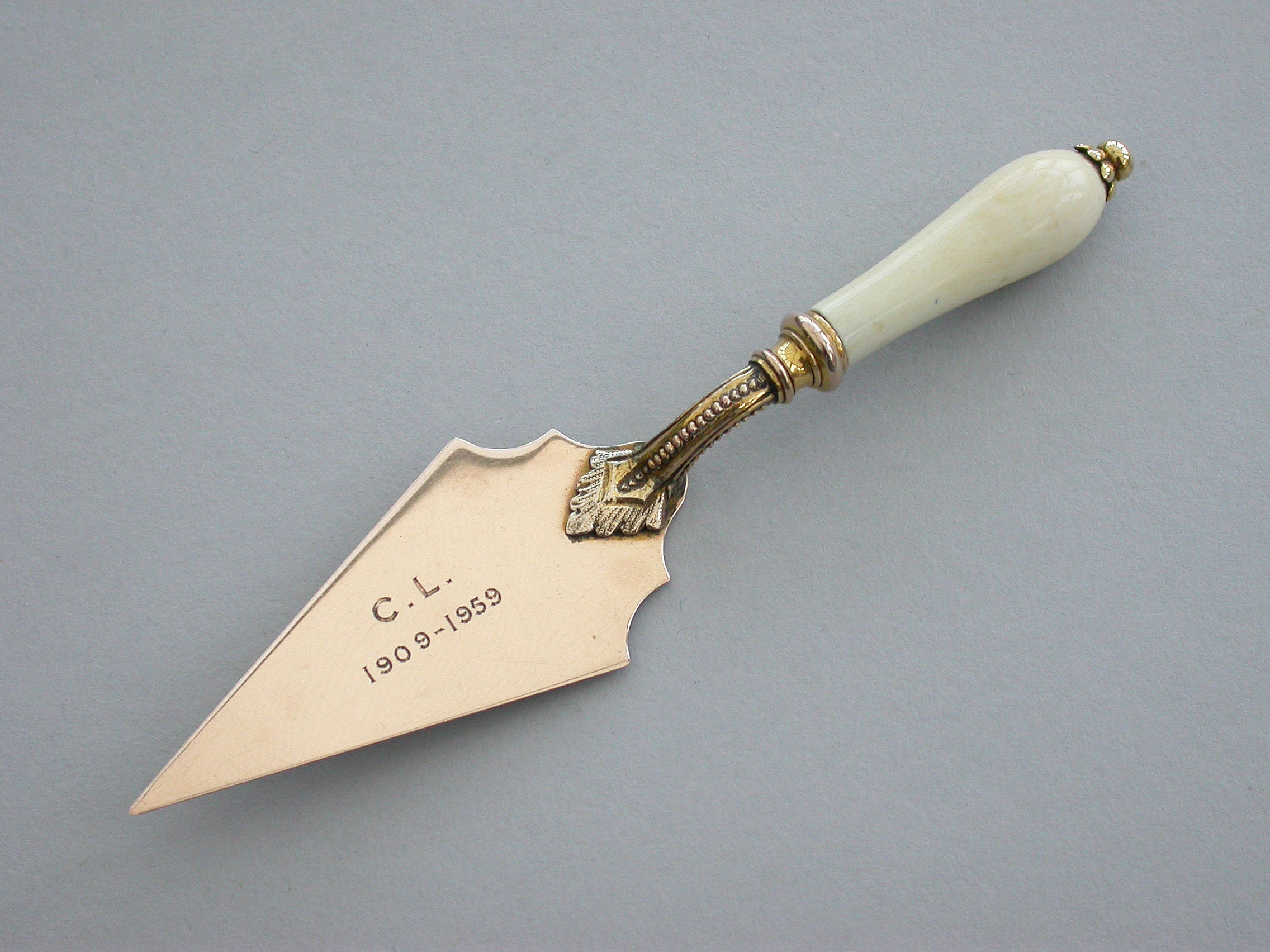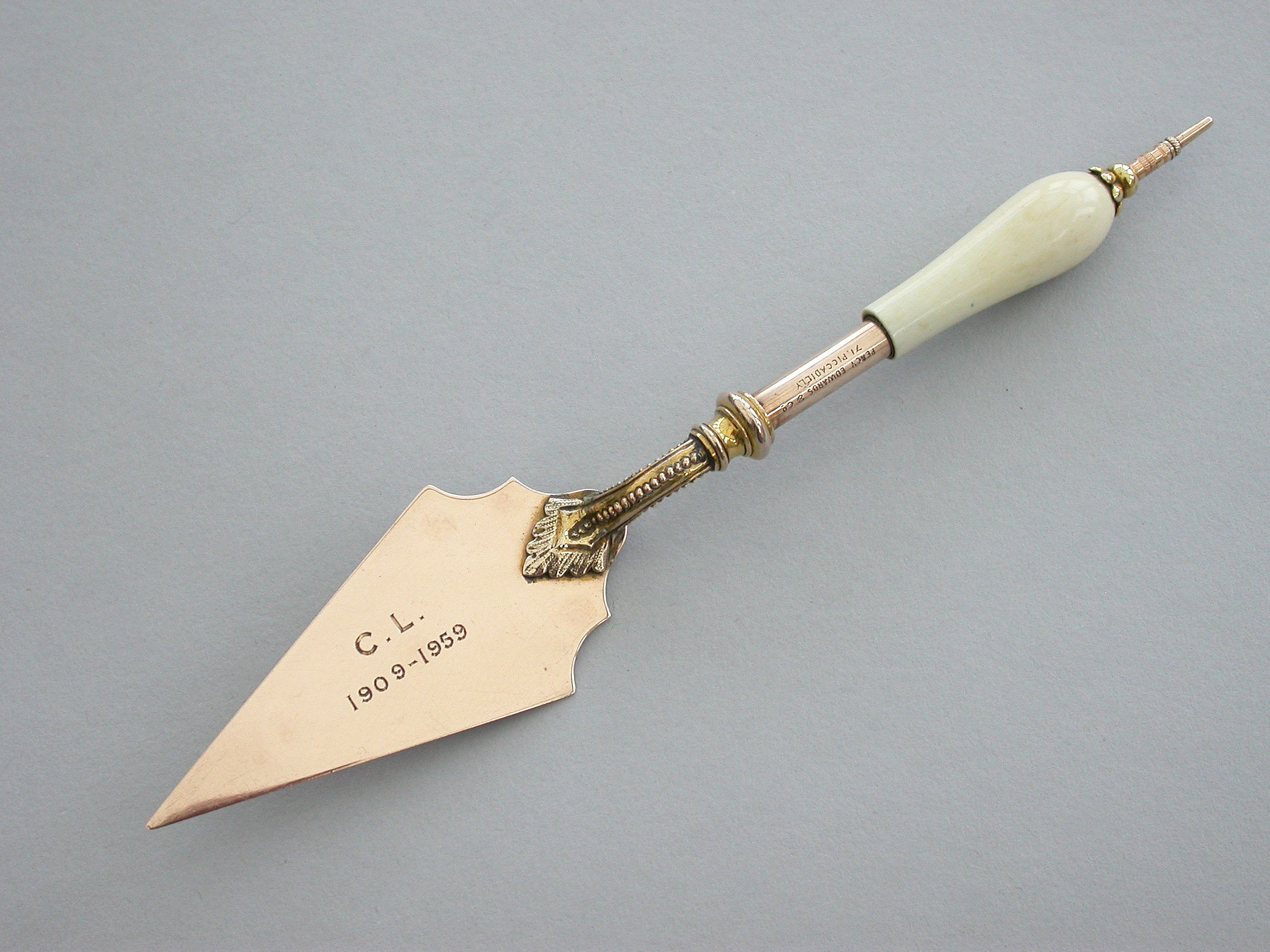 A very rare Victorian Novelty gold Propelling Pencil formed as a Presentation Trowel with turned ivory handle. The blade of the trowel engraved with initials and dates.