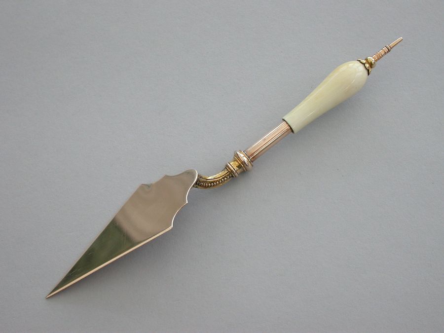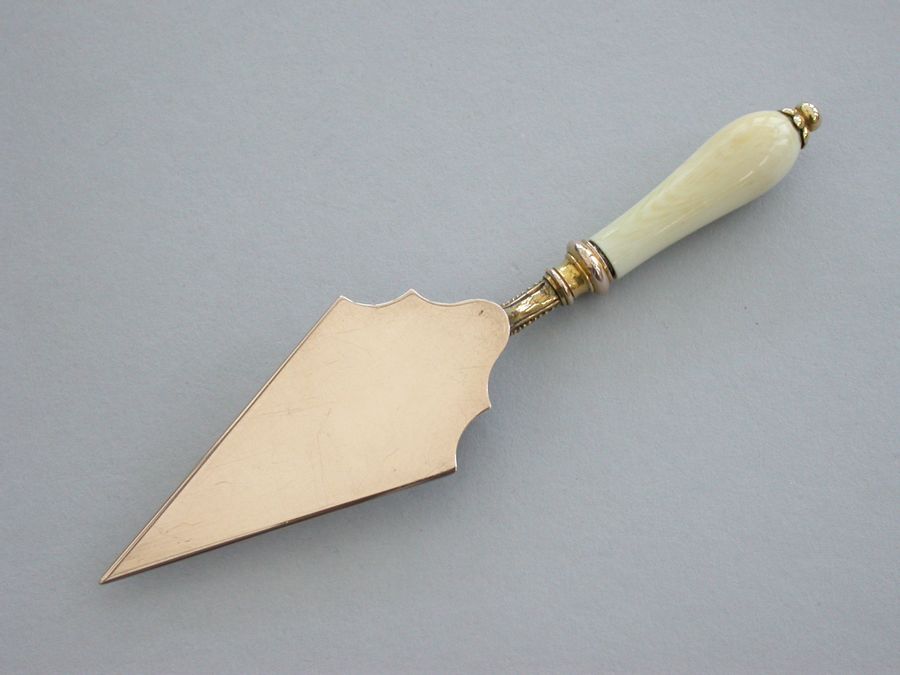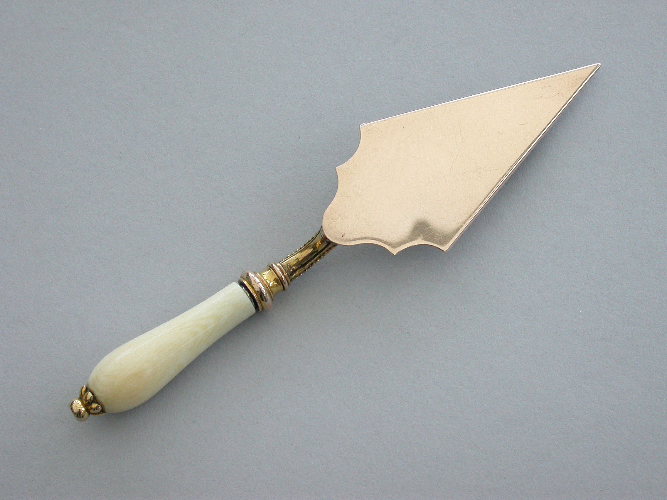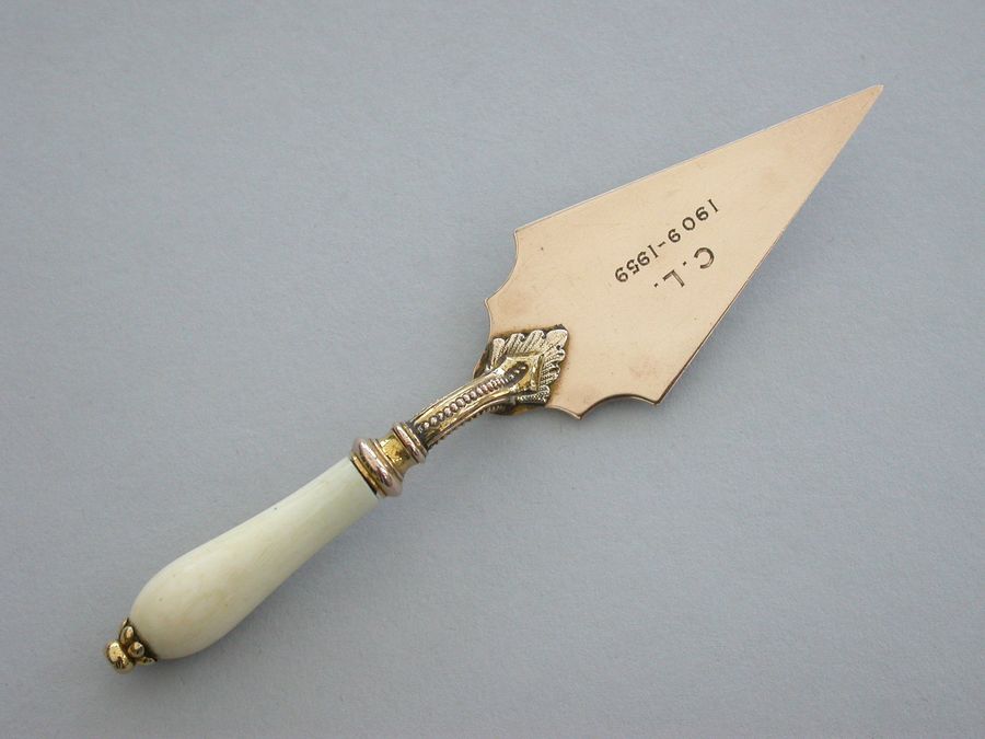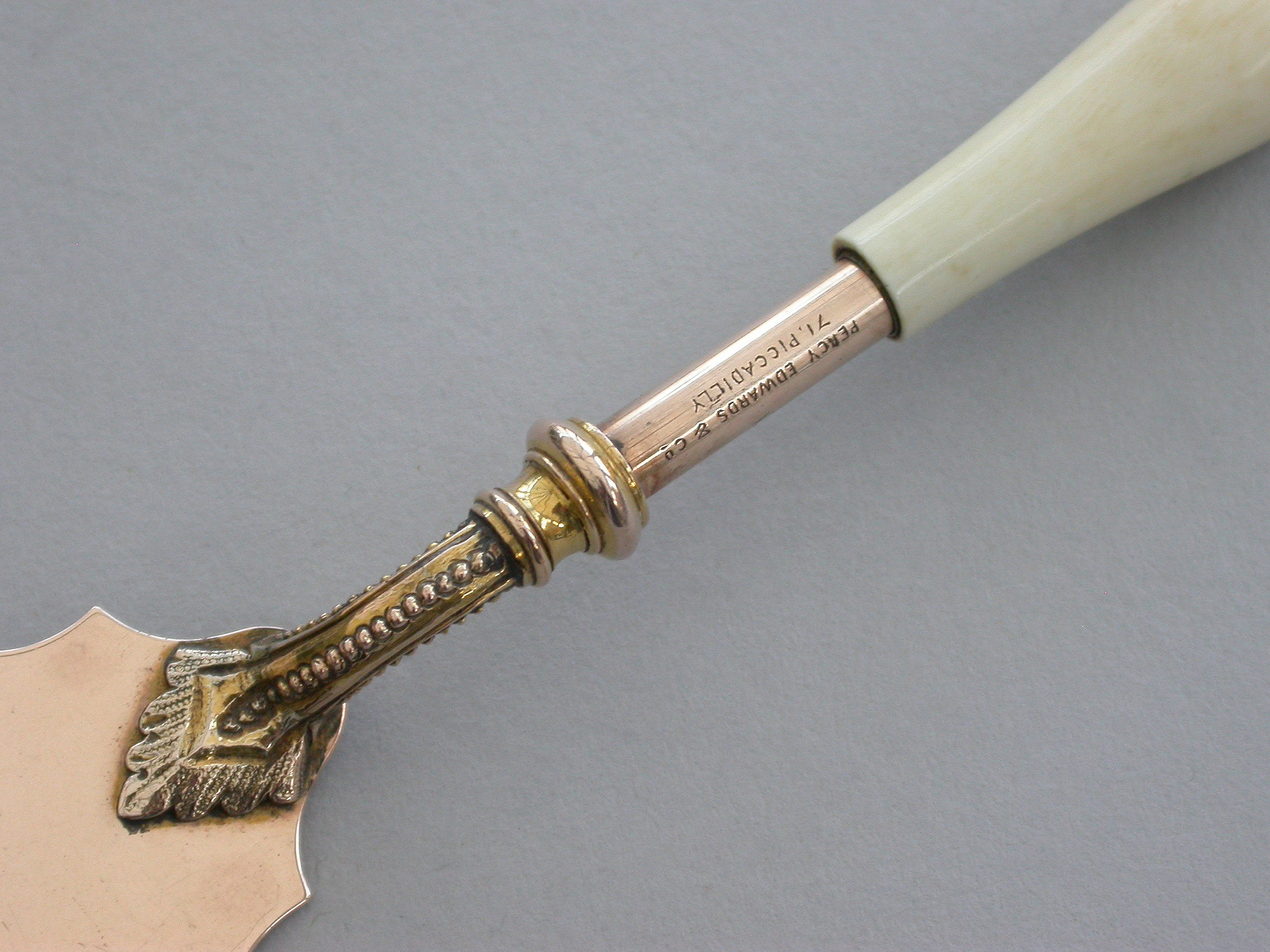 A very rare Victorian Novelty gold Propelling Pencil formed as a Presentation Trowel with turned ivory handle. The blade of the trowel engraved with initials and dates.