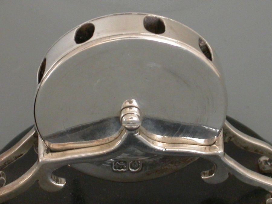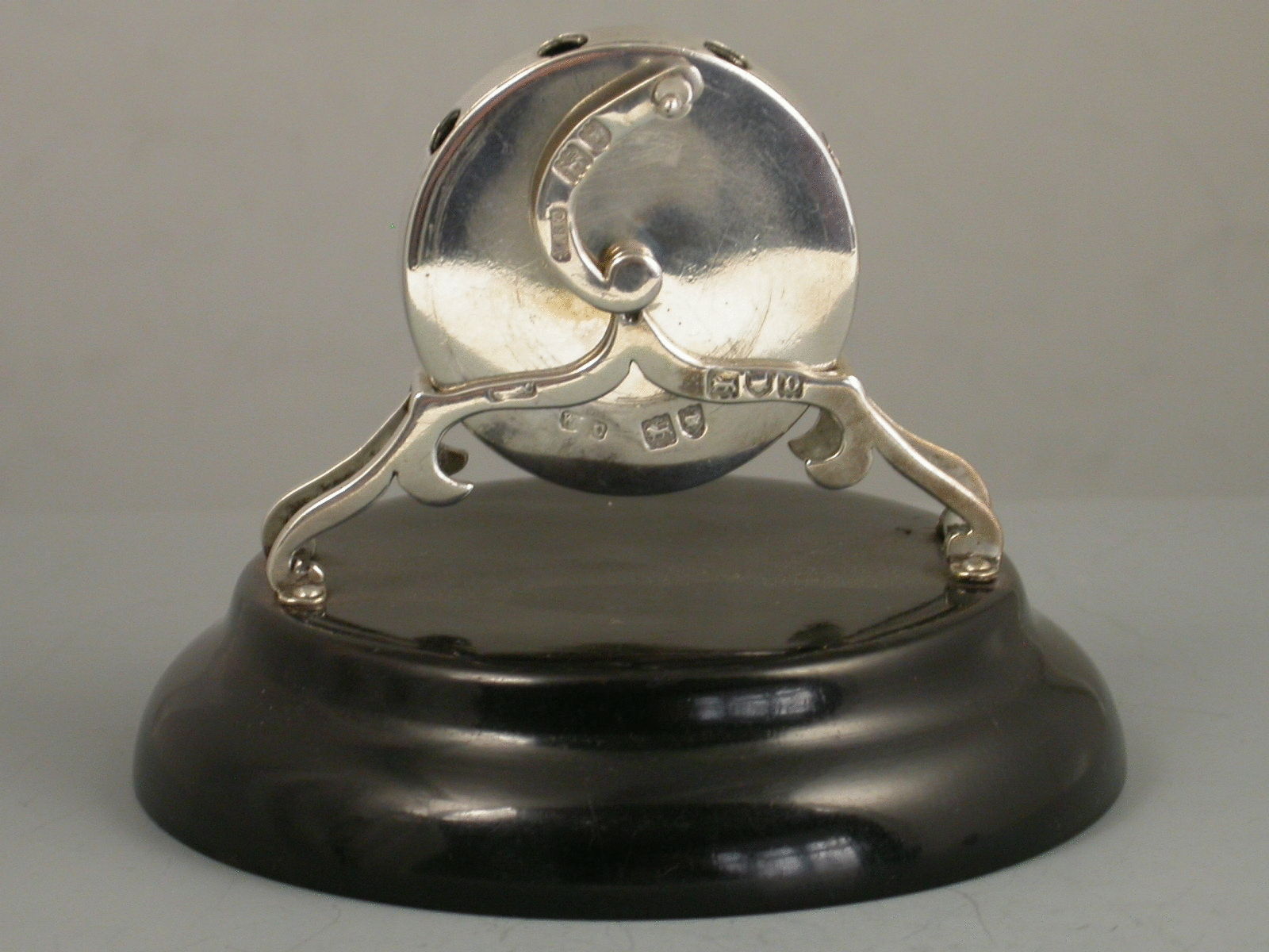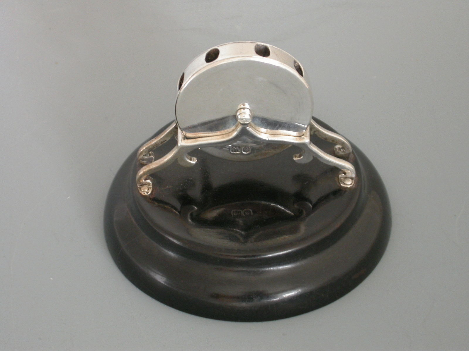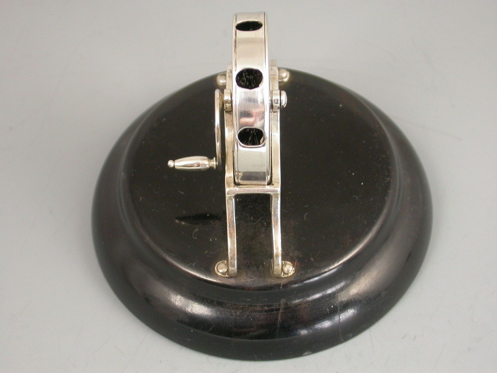 An extremely rare and unusual novelty silver Pen Wipe in the for of a miniature 'Kent' Rotary Knife Sharpener, on lacquered hardwood base. The silver handle when turned, rotates the brushes inside the silver drum in order to clean the nib.
