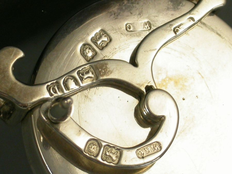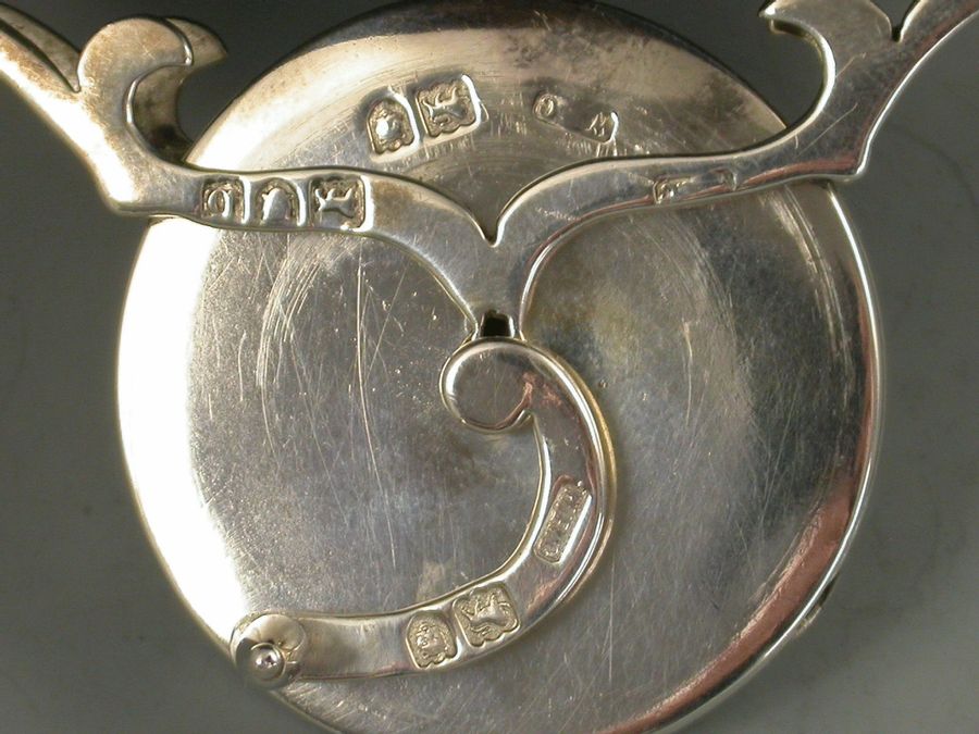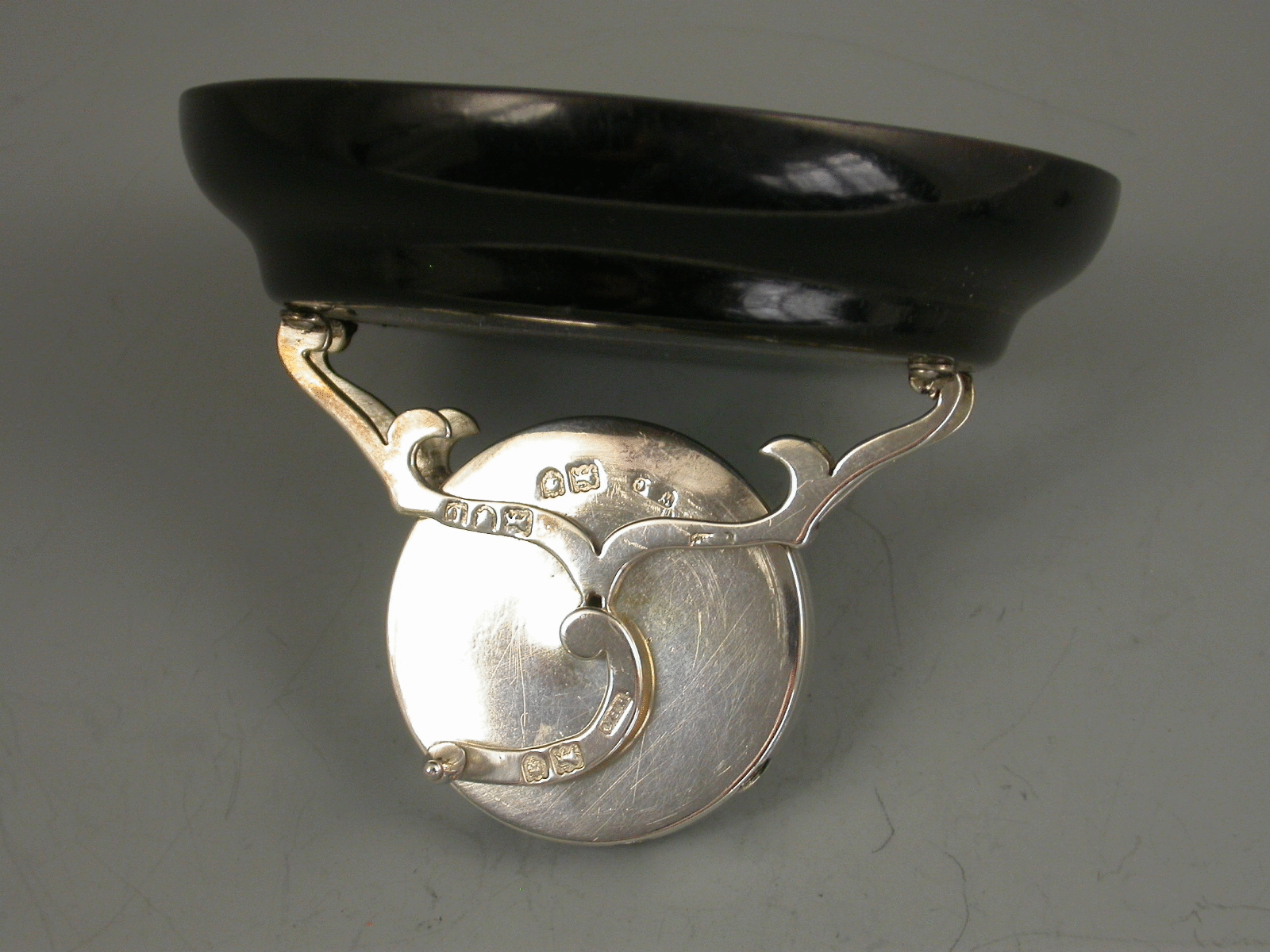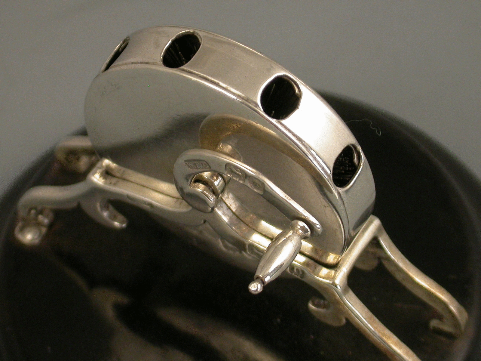 An extremely rare and unusual novelty silver Pen Wipe in the for of a miniature 'Kent' Rotary Knife Sharpener, on lacquered hardwood base. The silver handle when turned, rotates the brushes inside the silver drum in order to clean the nib.