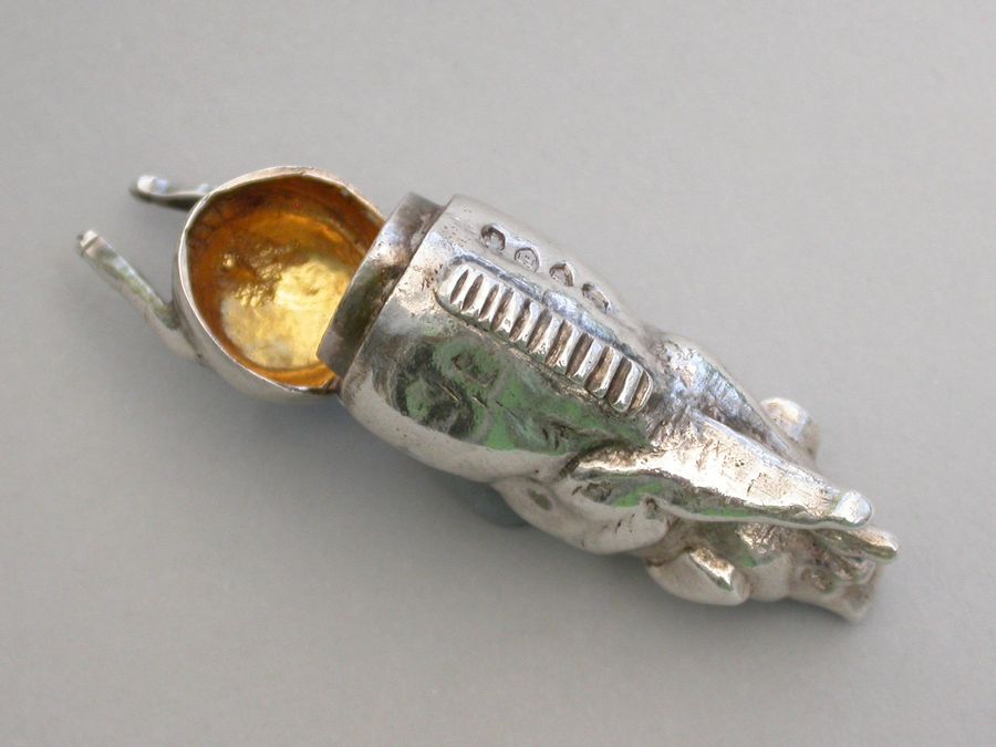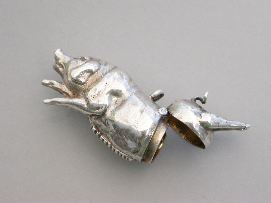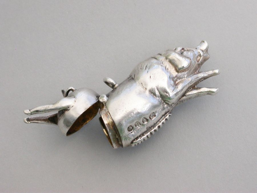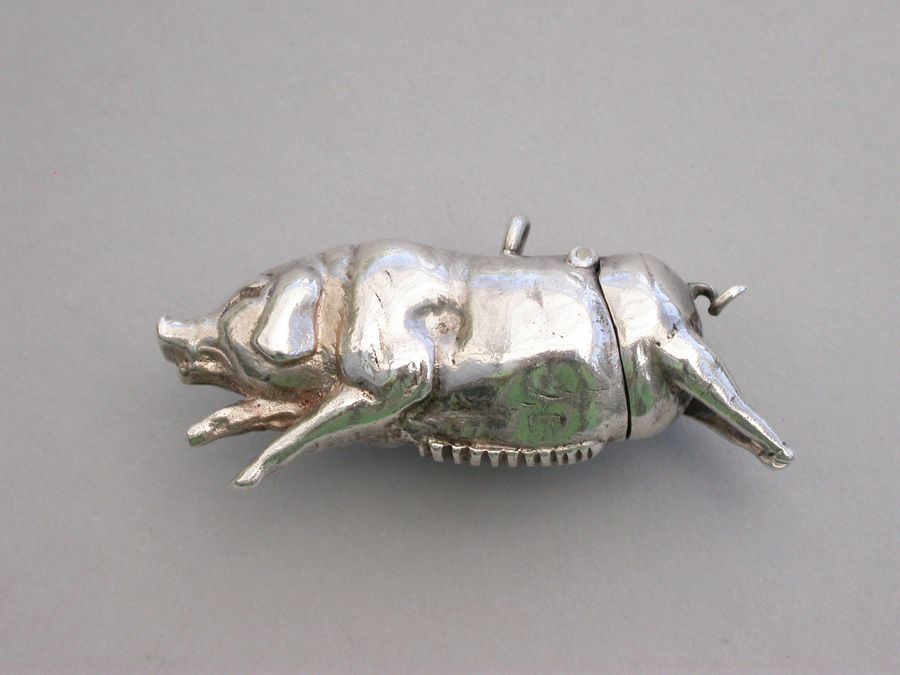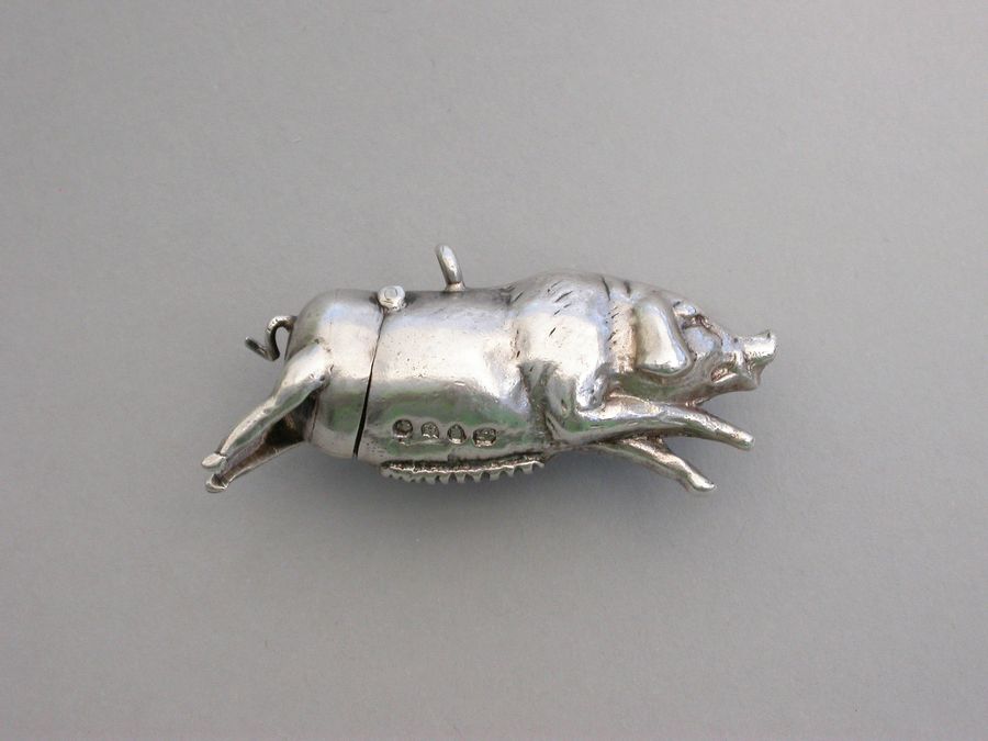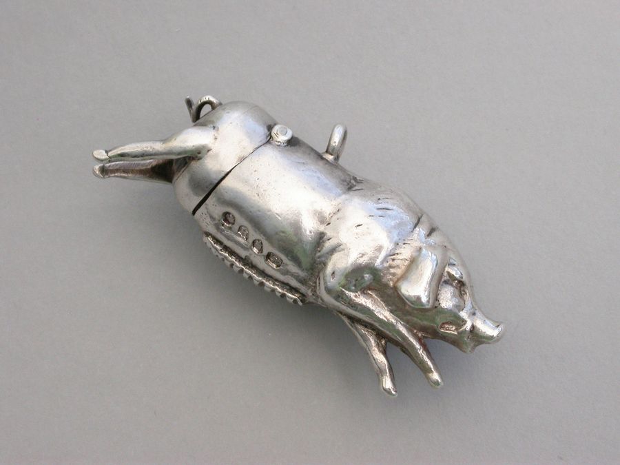 A rare Victorian novelty silver Vesta Case made in the form of a small running Pig, with hinged flip-top lid and silver gilt interior. Attached suspension ring and striker to base.
