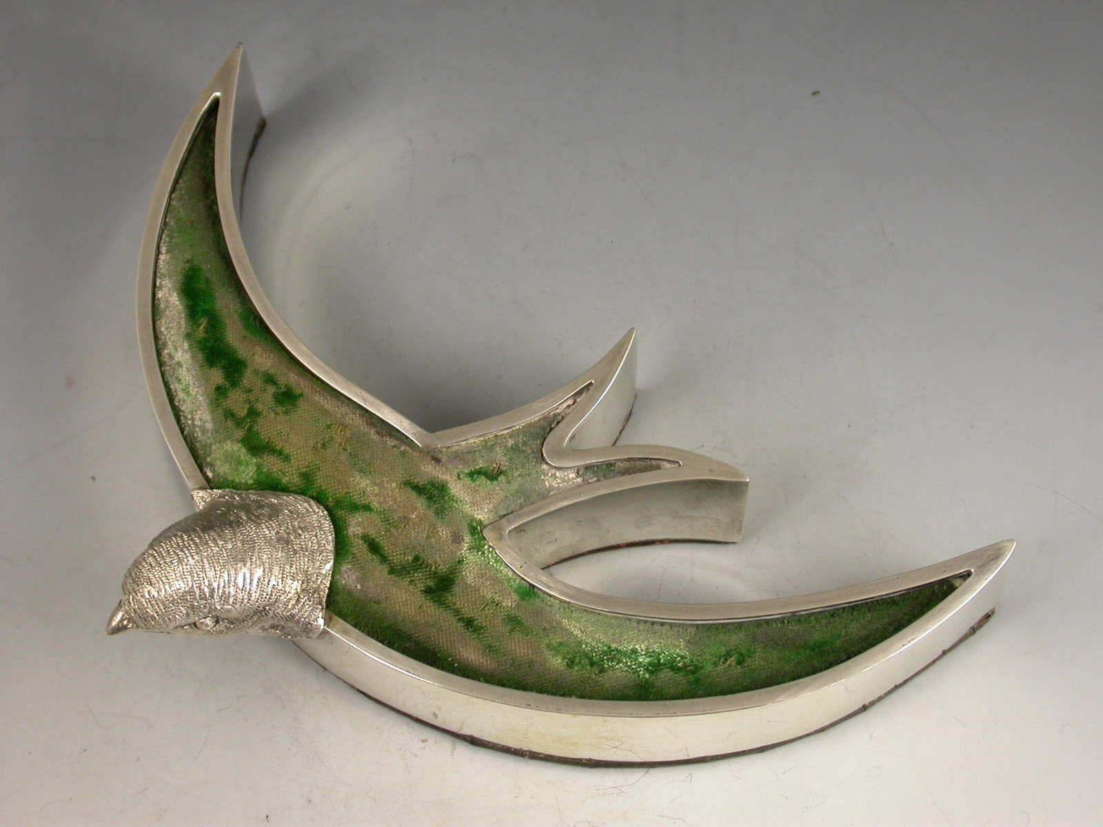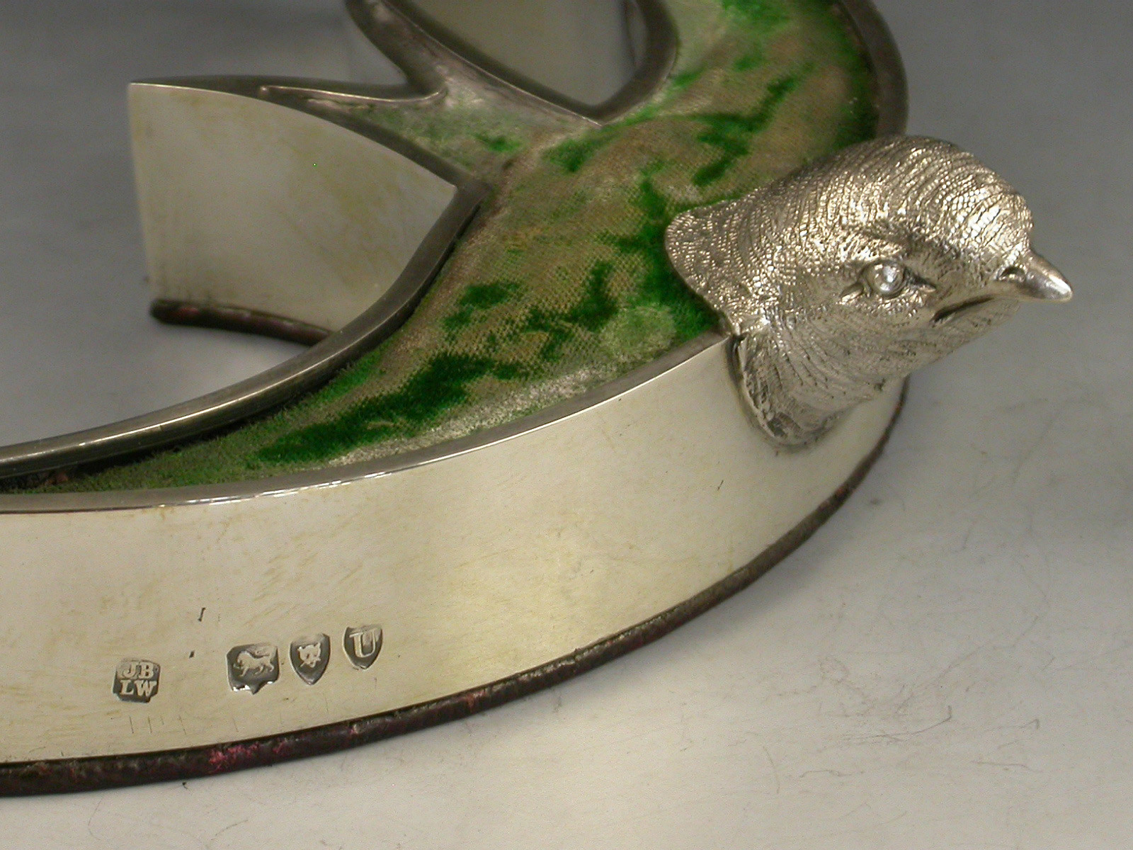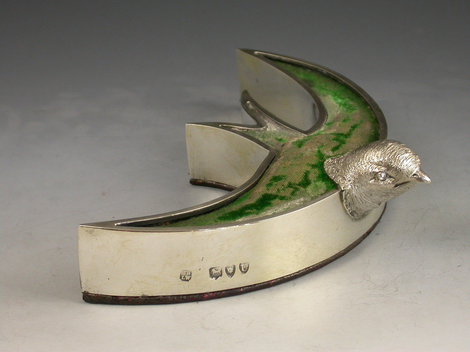 An exceptionally rare Victorian novelty silver Pin Cushion modelled as a swallow or swift in flight, with cast naturalistic head and stylised body filled with a cushion covered in green velvet, red Morocco leather base.