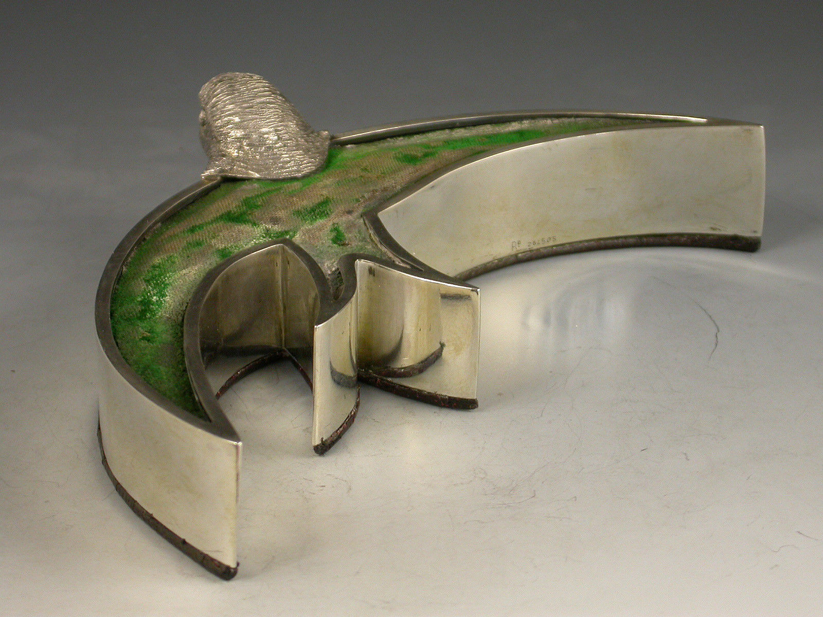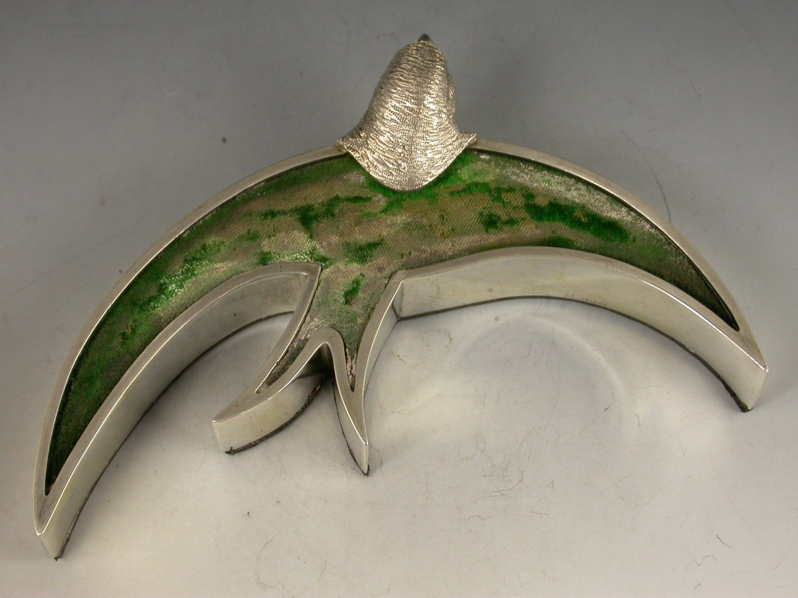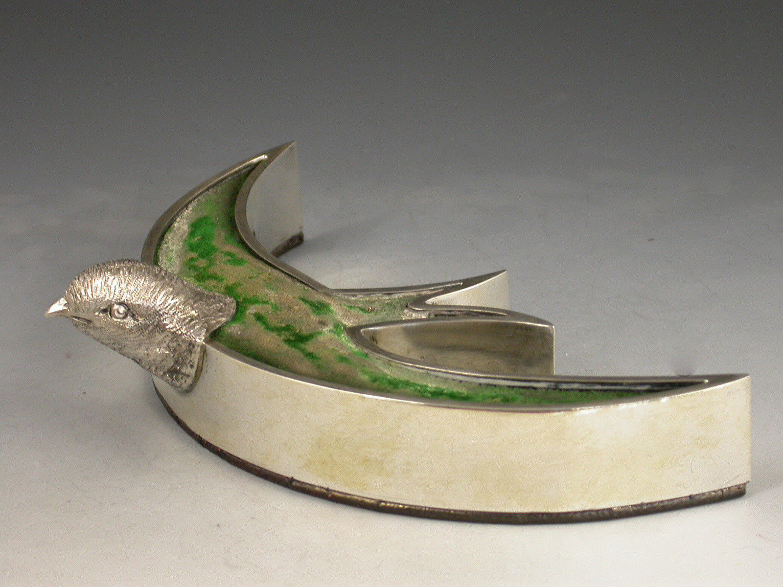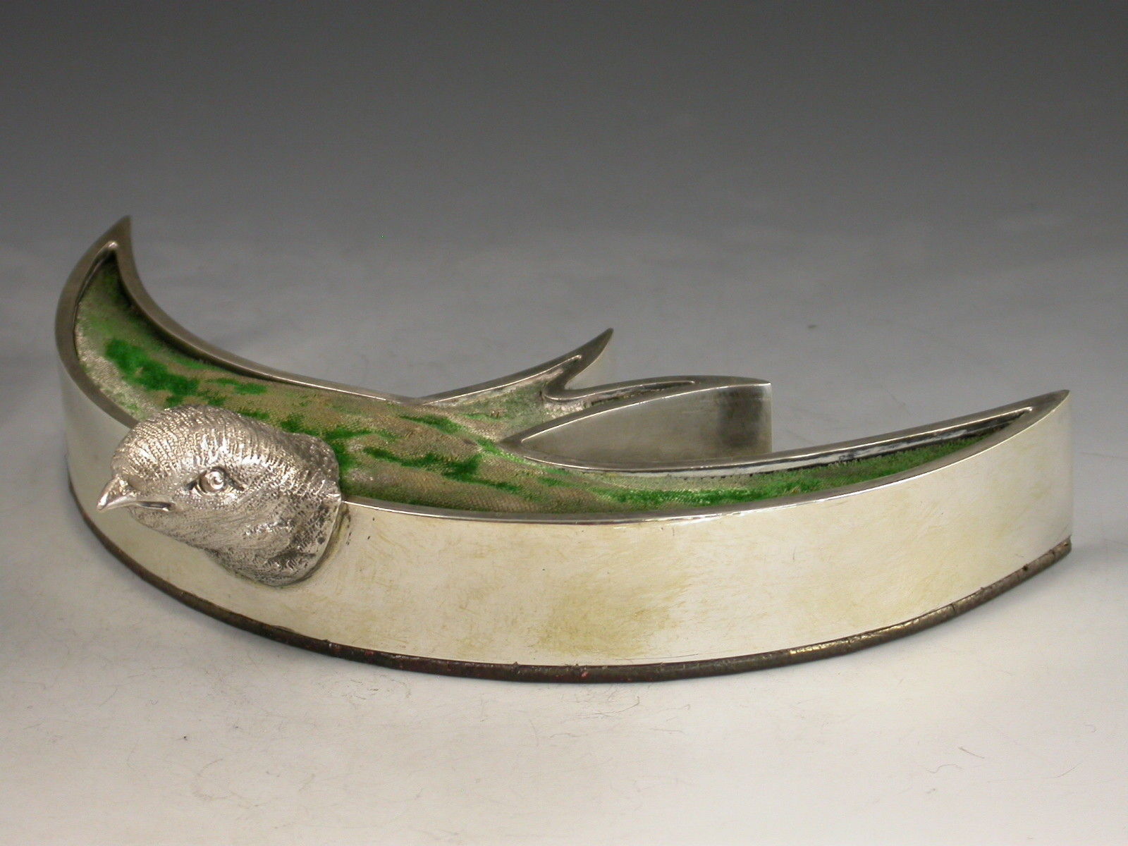 An exceptionally rare Victorian novelty silver Pin Cushion modelled as a swallow or swift in flight, with cast naturalistic head and stylised body filled with a cushion covered in green velvet, red Morocco leather base.