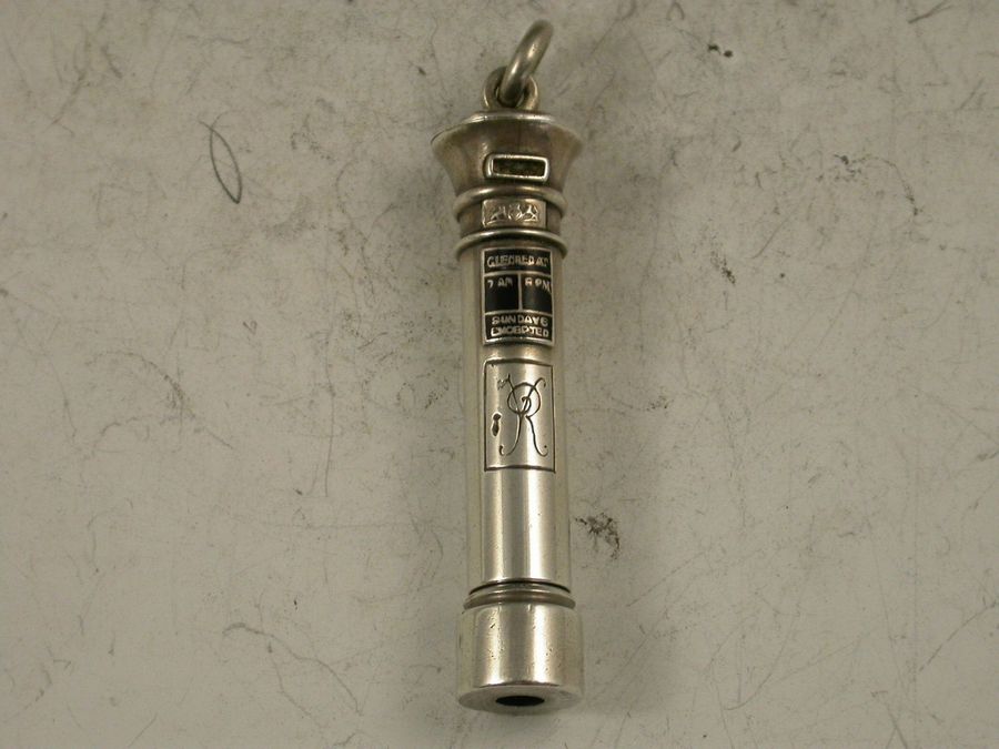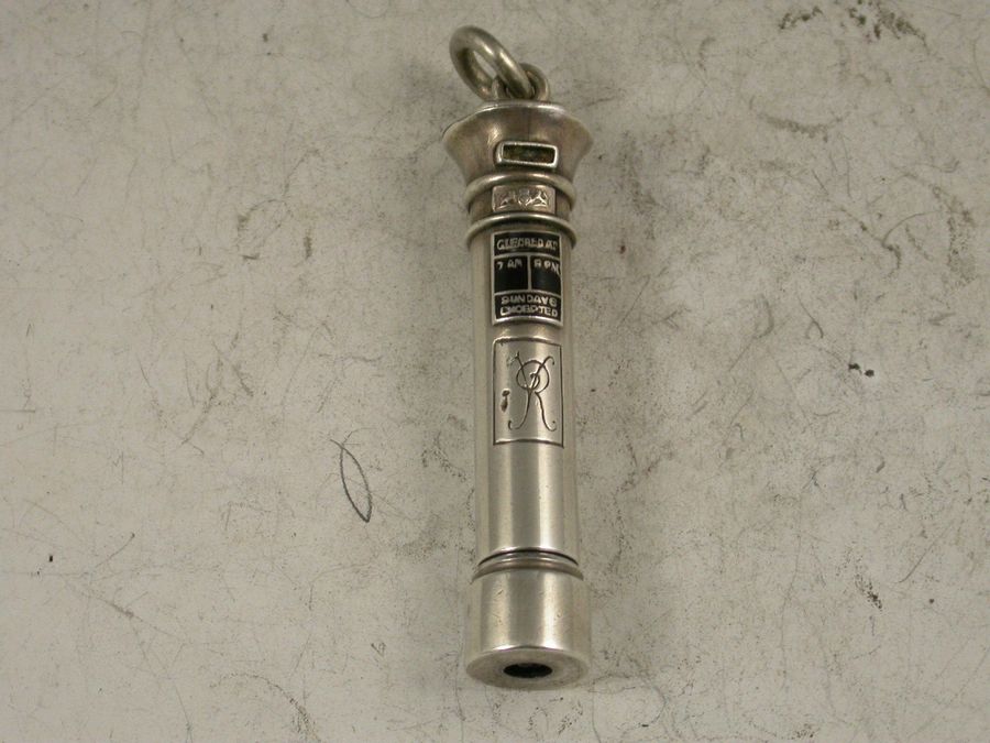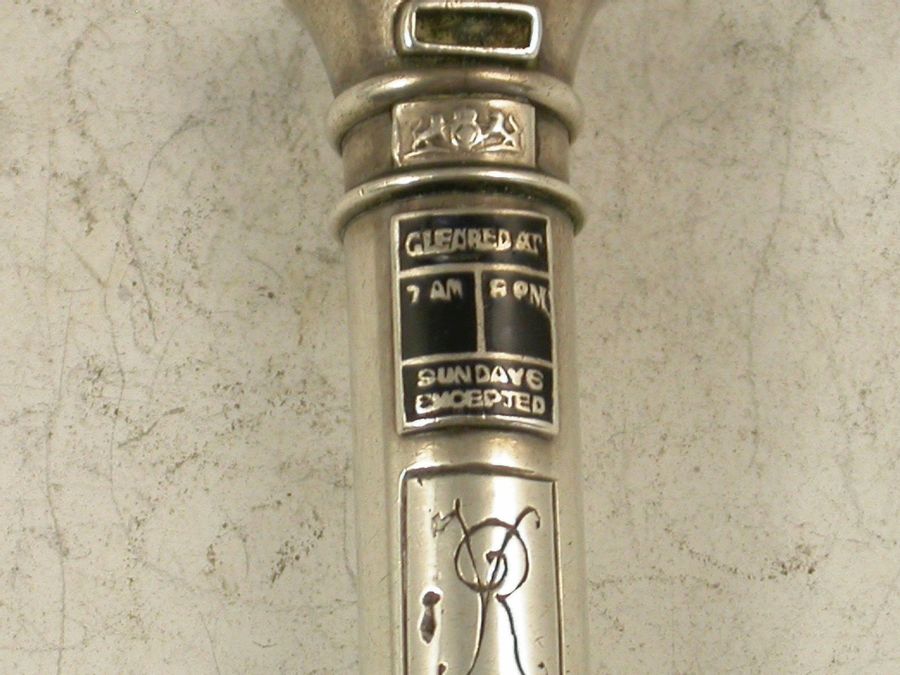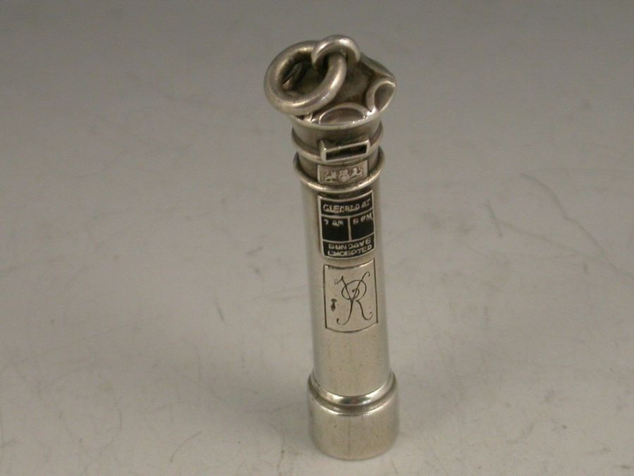 An extremely rare Victorian novelty silver and enamel telescopic Propelling Pencil made in the form of an early Pillar / Post Box with crown finial and enamel collection times sign. Also engraved with the Royal Cypher 'VR', for Victoria Regina.