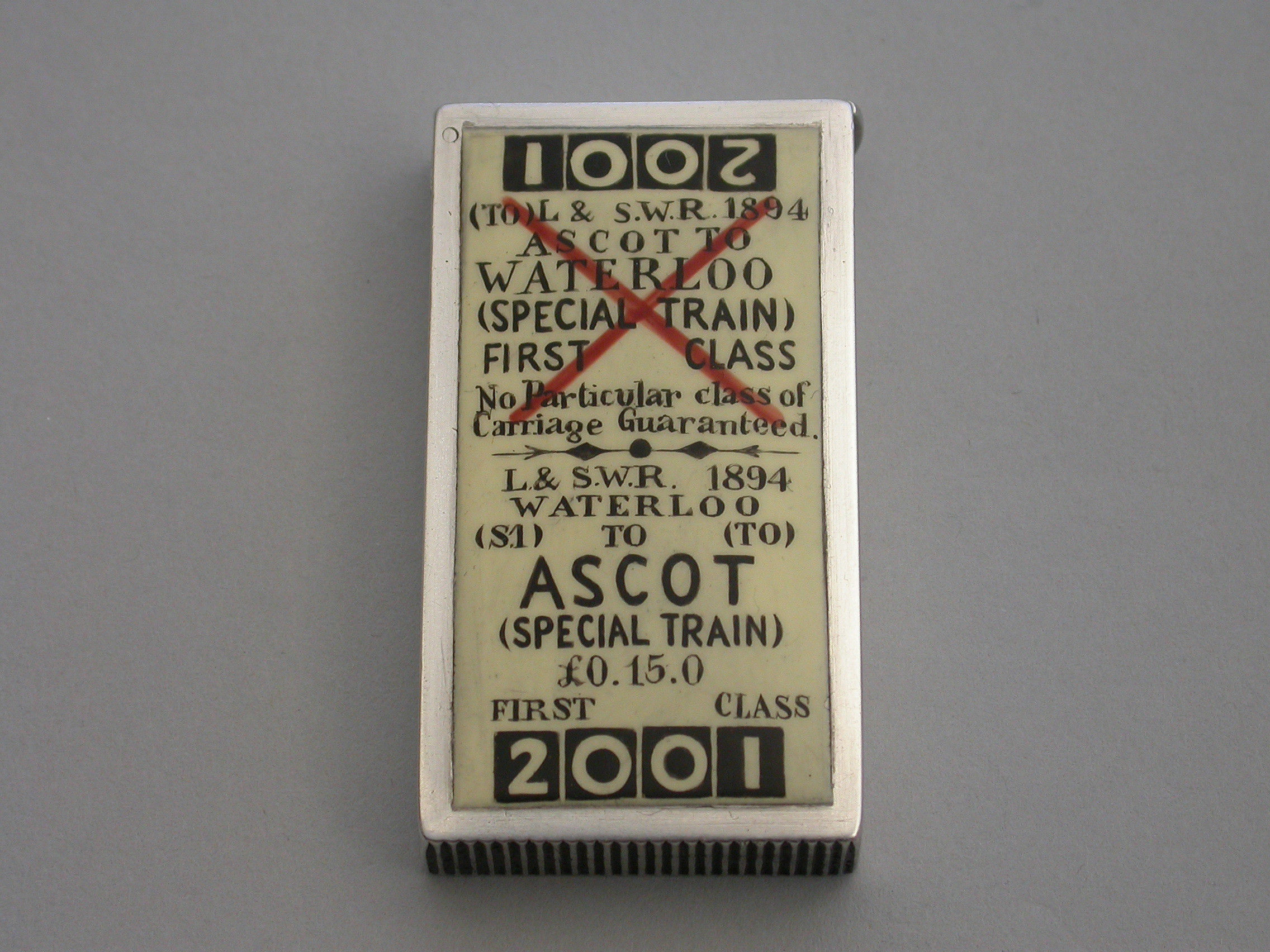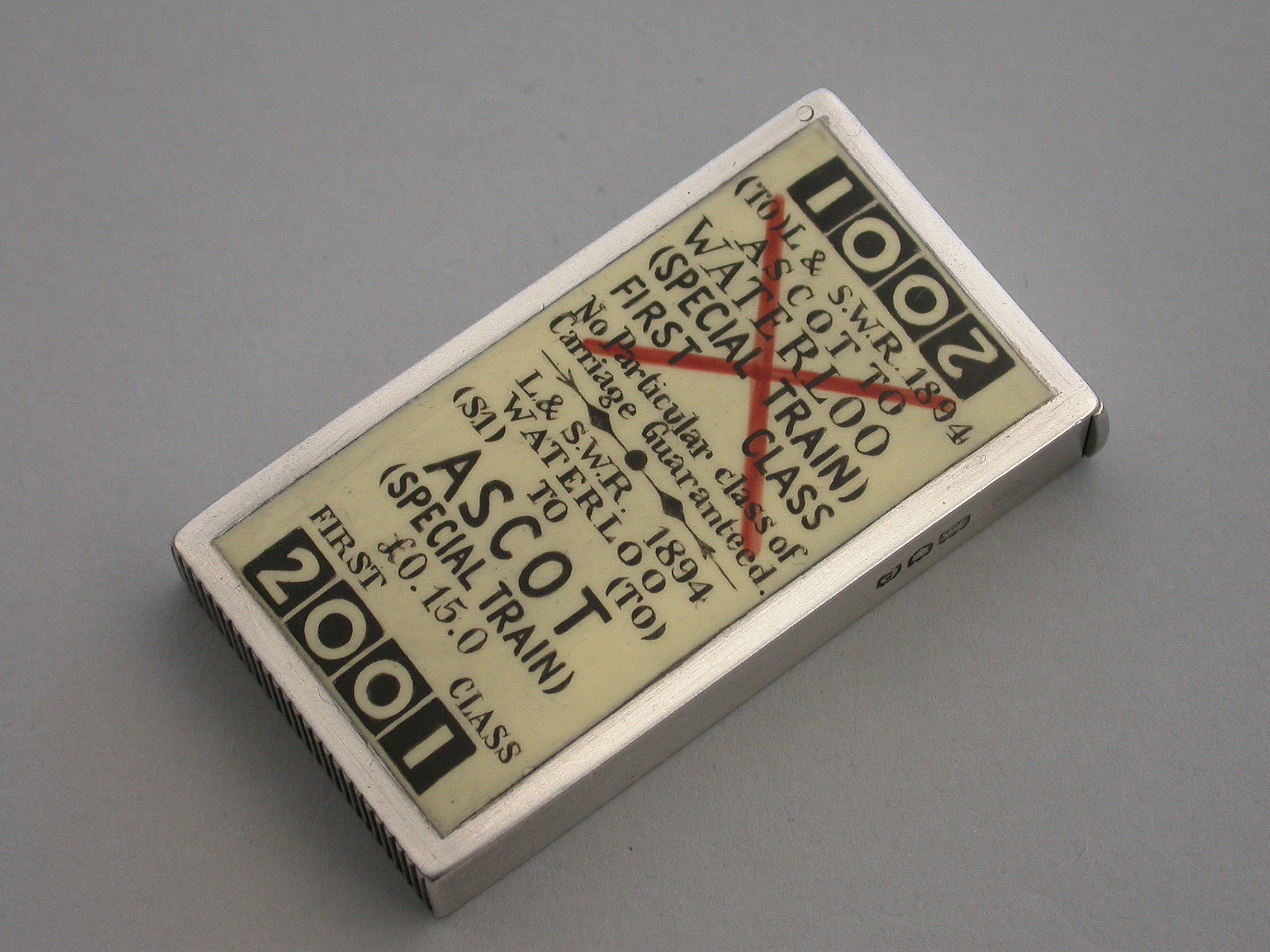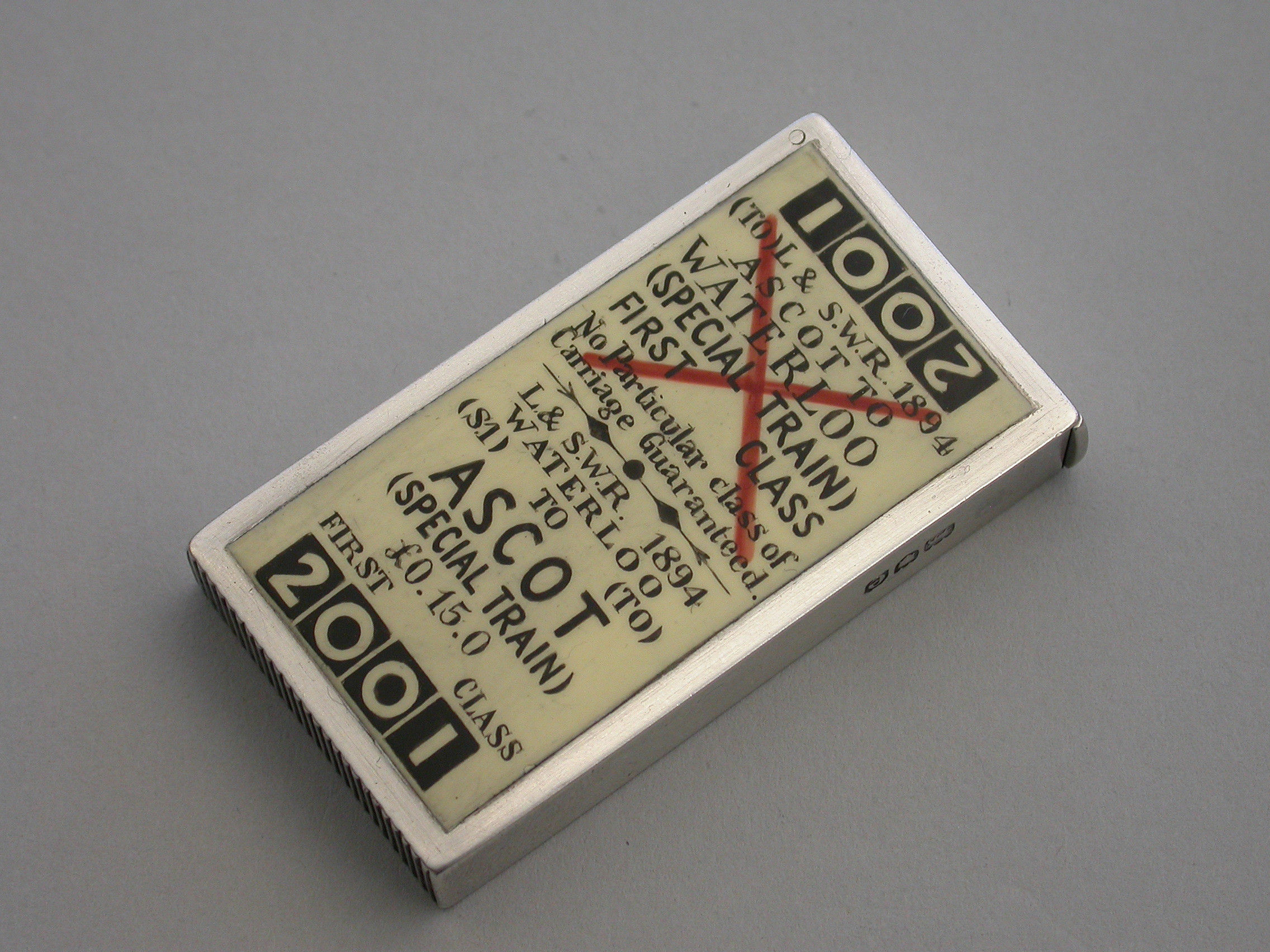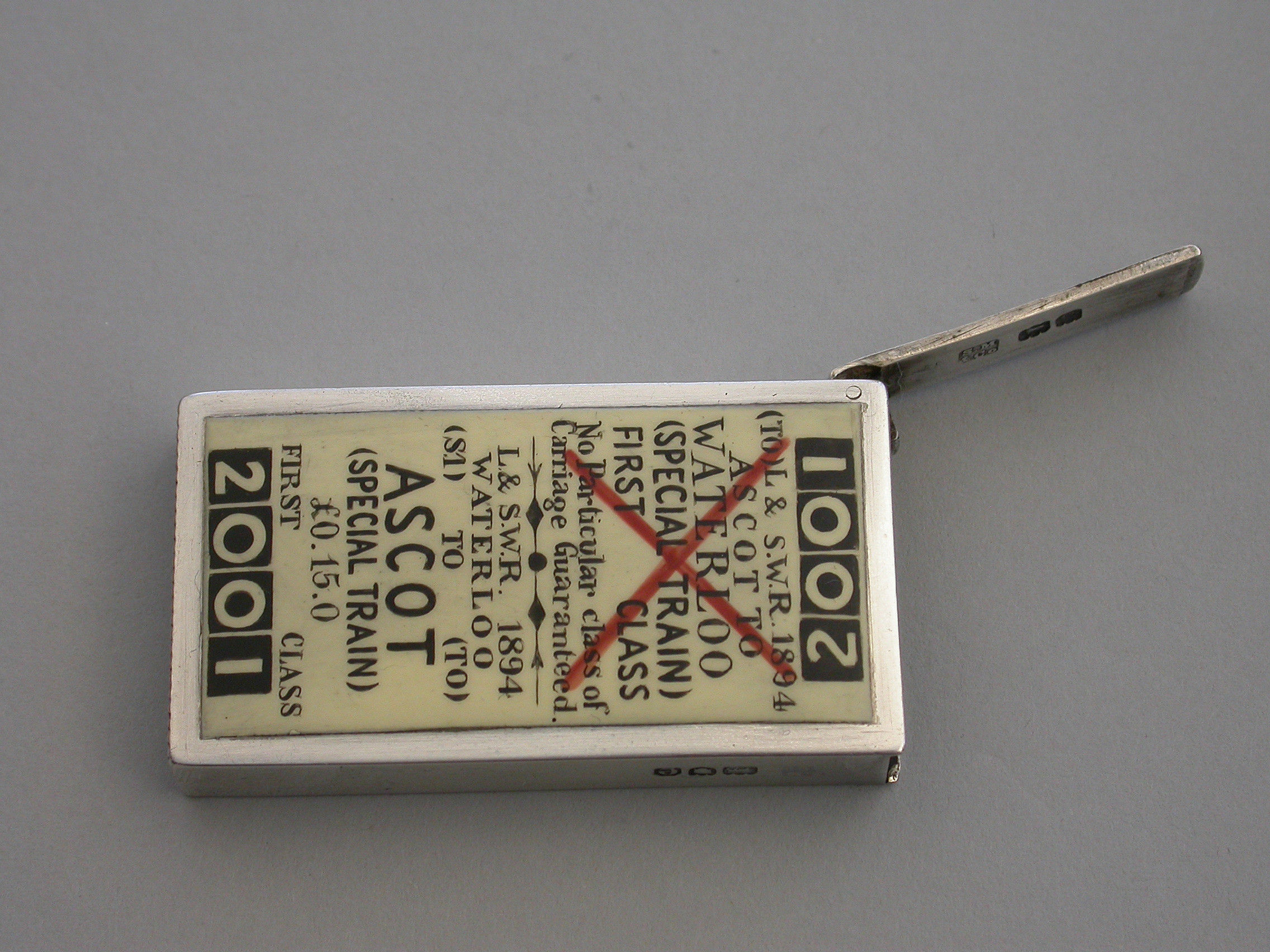 An extremely fine and rare Victorian silver and enamel novelty Vesta Case of rectangular form with flat hinged lid, the face enamelled to represent a First Class London and South West Railway Train Ticket - Waterloo to Ascot.