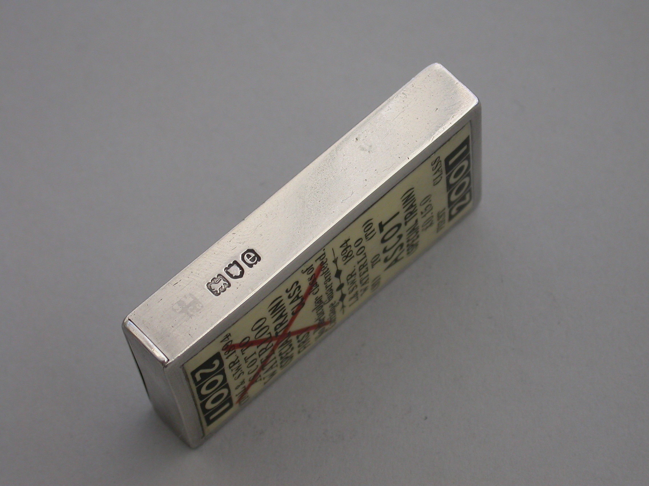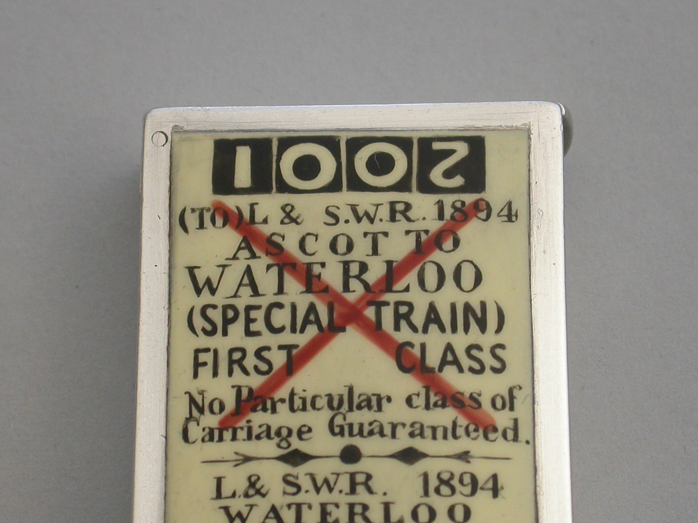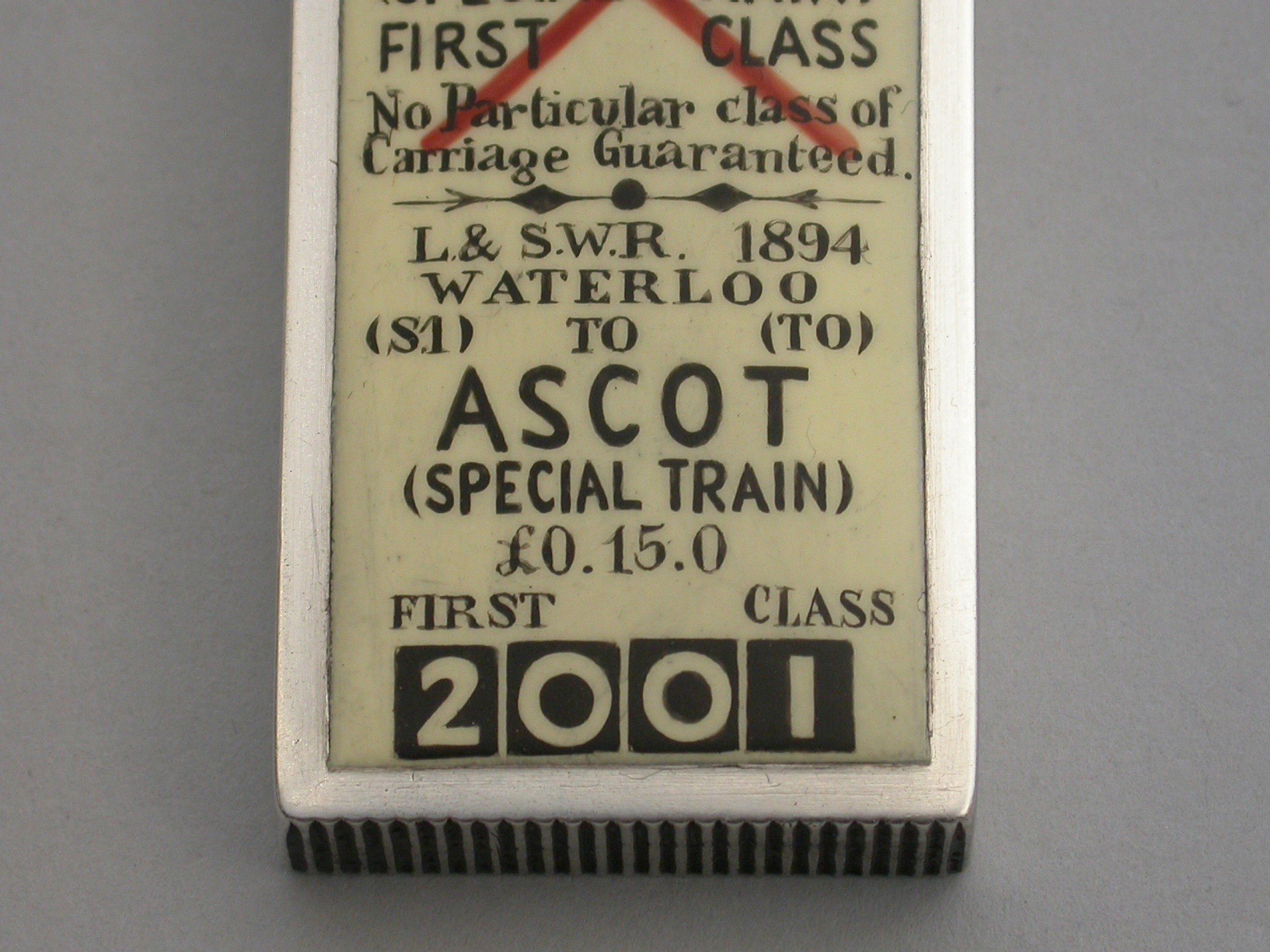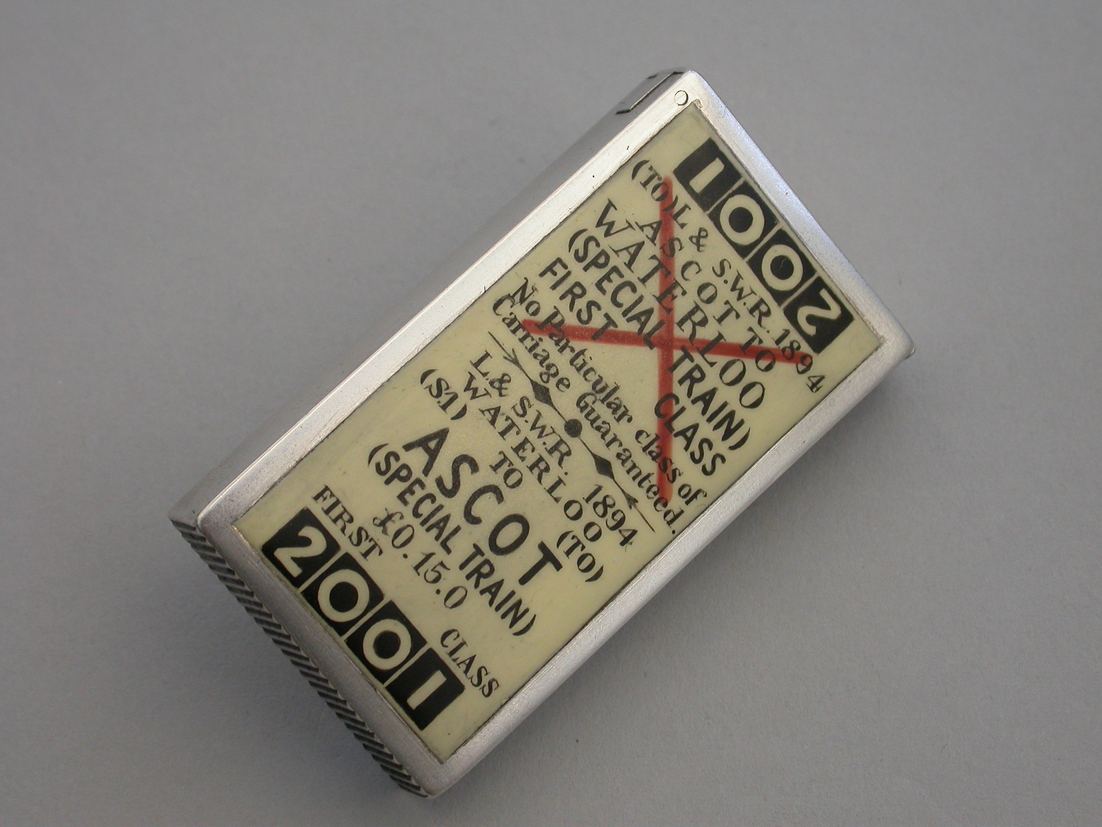 An extremely fine and rare Victorian silver and enamel novelty Vesta Case of rectangular form with flat hinged lid, the face enamelled to represent a First Class London and South West Railway Train Ticket - Waterloo to Ascot.