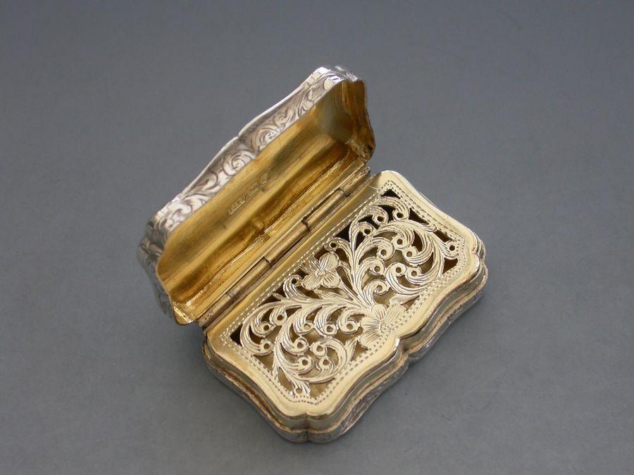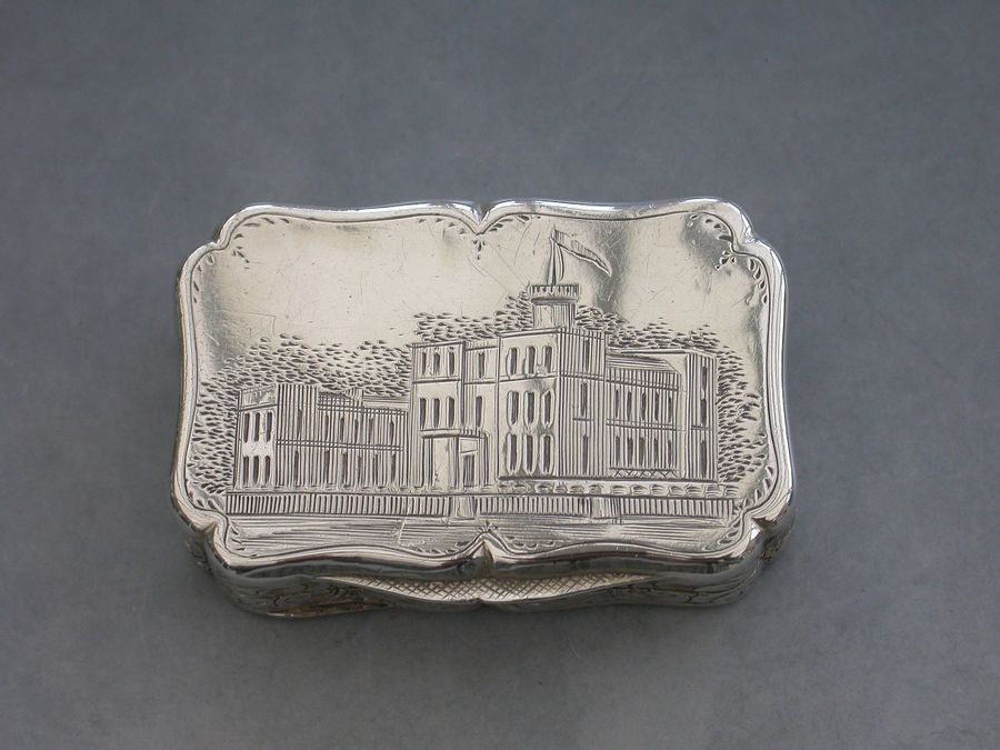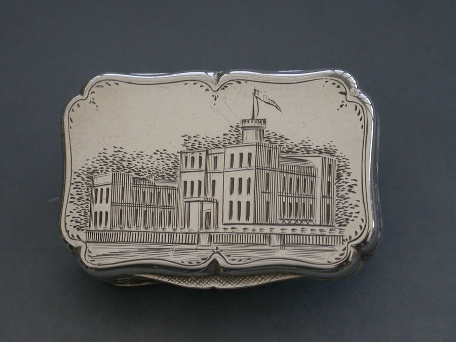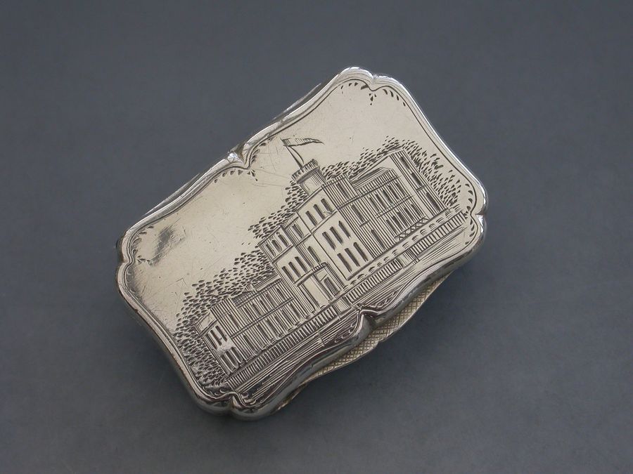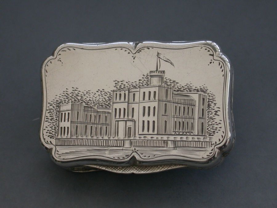 An extremely rare Victorian Castle-top Vinaigrette of shaped rectangular form, the base and sides with foliate scroll engraved decoration and an initialled cartouche, the silver gilt interior with a foliate scroll pierced grille, the lid engraved with an unidentified building.