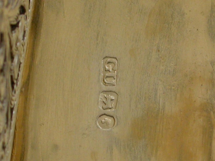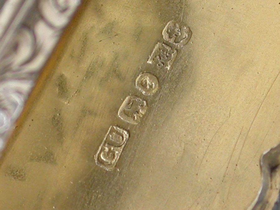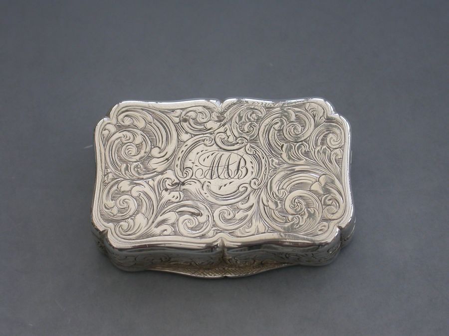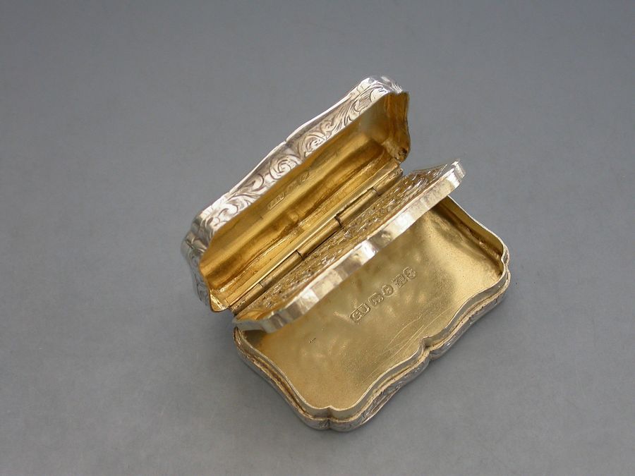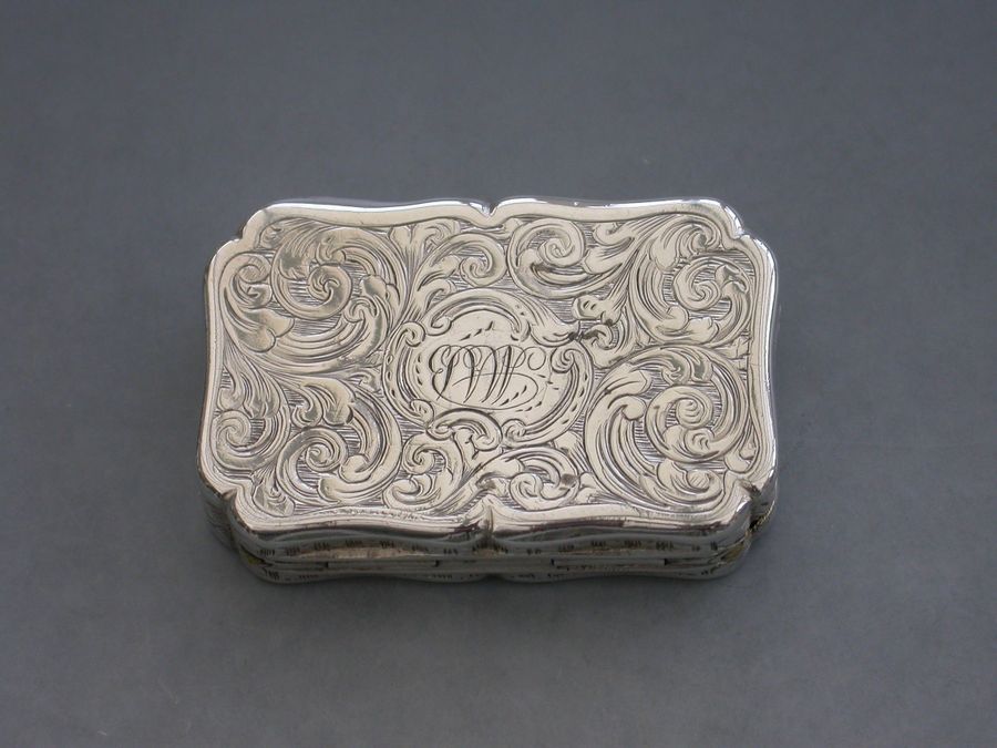 An extremely rare Victorian Castle-top Vinaigrette of shaped rectangular form, the base and sides with foliate scroll engraved decoration and an initialled cartouche, the silver gilt interior with a foliate scroll pierced grille, the lid engraved with an unidentified building.