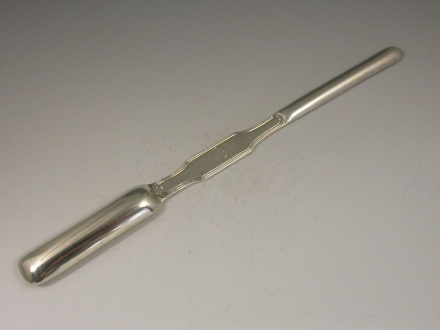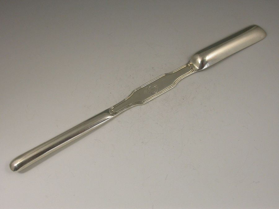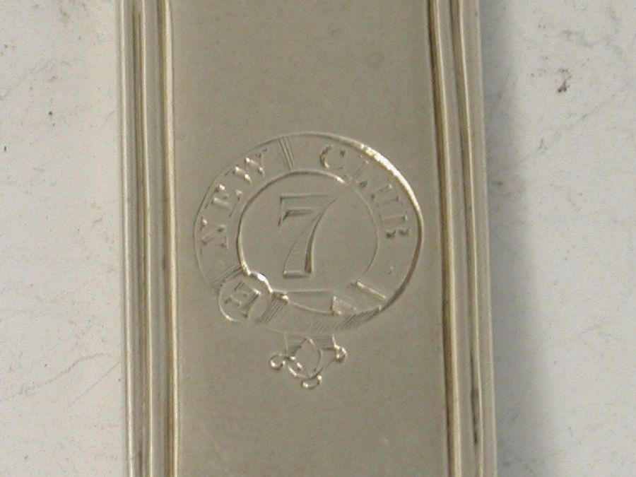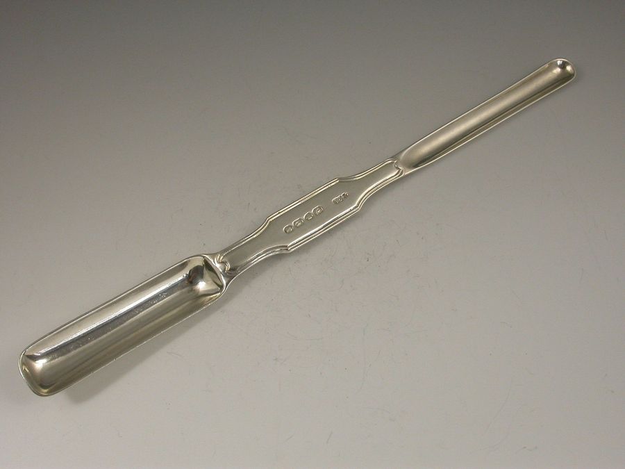 A rare Victorian silver Marrow Scoop of unusual form in fiddle and thread pattern and hallmarked on the top side. The reverse engraved with a garter surrounding a numeral seven and ""New Club"", possibly for the 'New Club', Princes Street, Edinburgh.