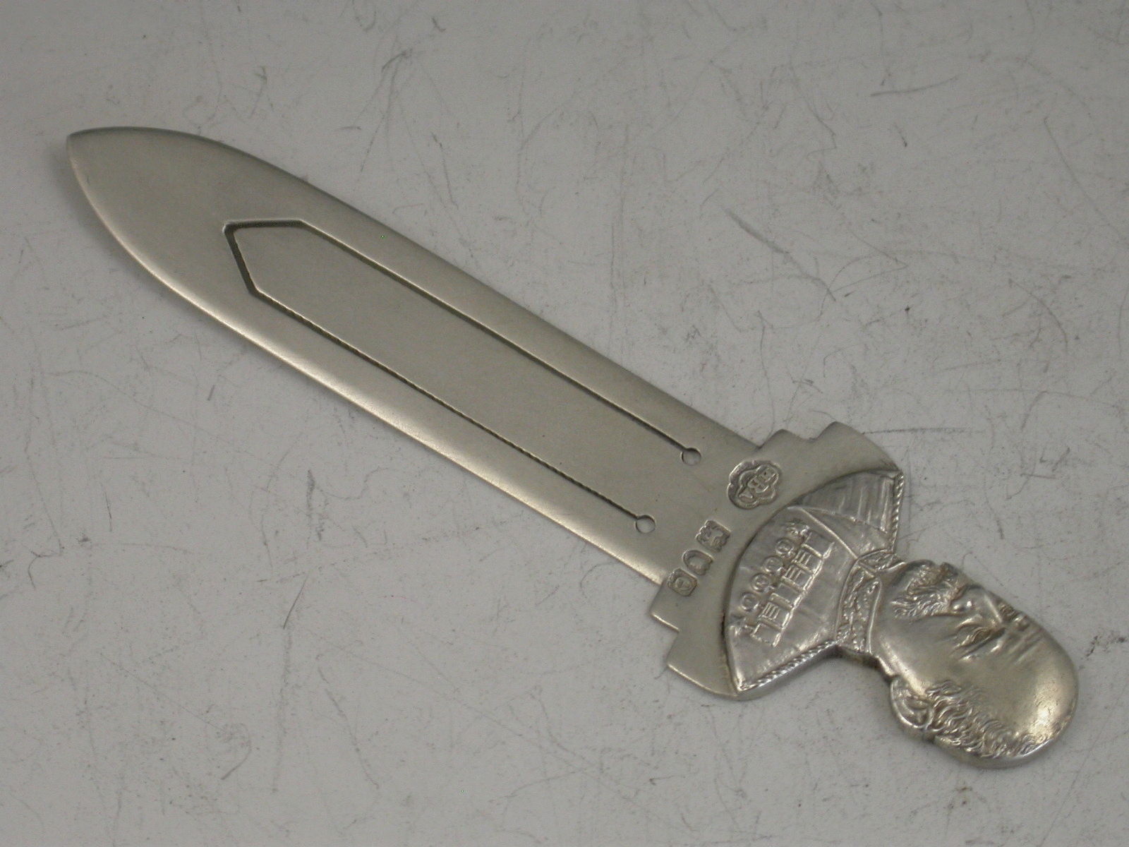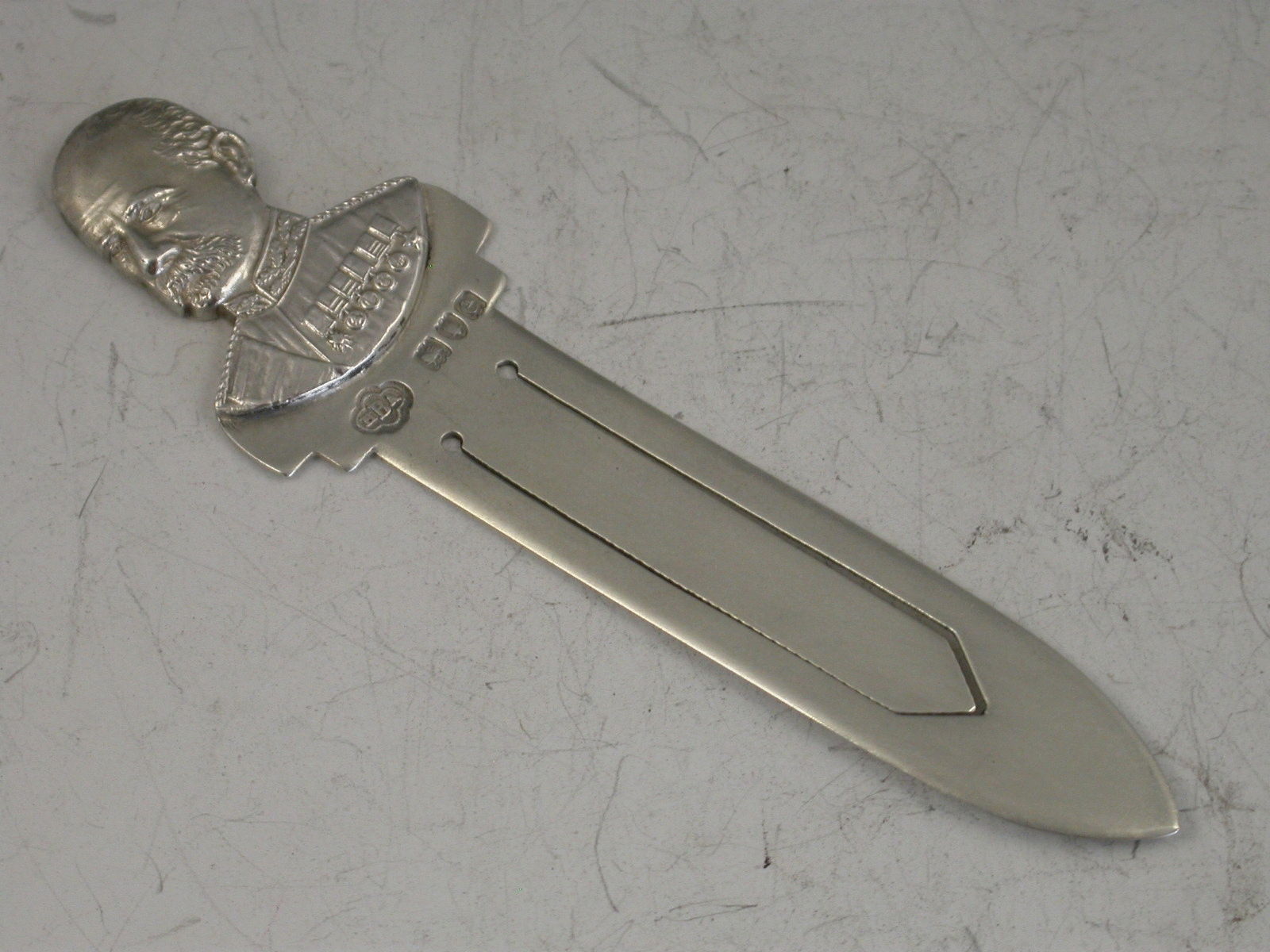 A rare late Victorian silver figural Bookmark with dagger shaped blade, the terminal formed as a bust of Herbert Lord Kitchener.