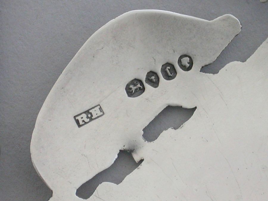 An extremely rare Victorian silver Wine Label of large pierced cartouche form with engraved foliate scrolled borders, incised with bold lettering for RUM below a hedgehog surmount (possibly Armorial).