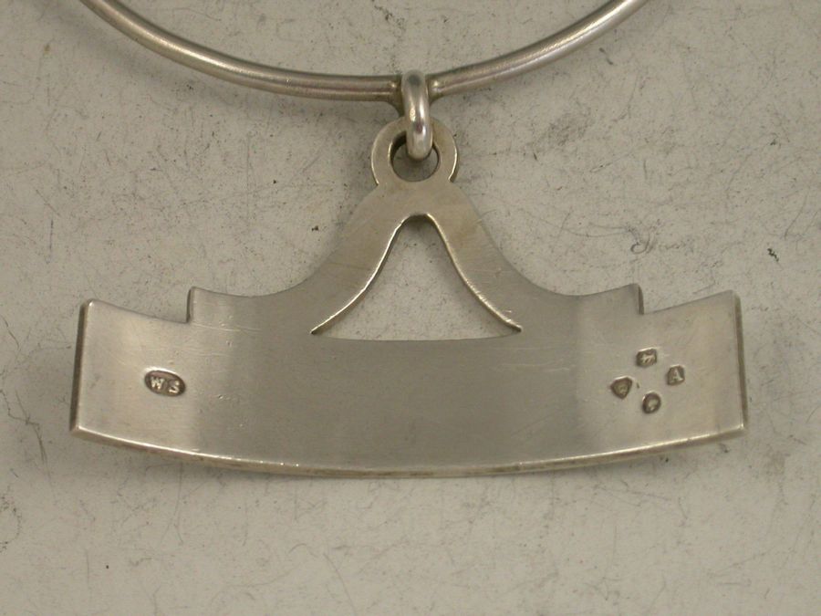 An extremely rare Victorian silver Wine Label of neck-ring form, the narrow rectangular label with pierced domed surmount and single suspension loop attached to circular silver wire support, incised for Thera.