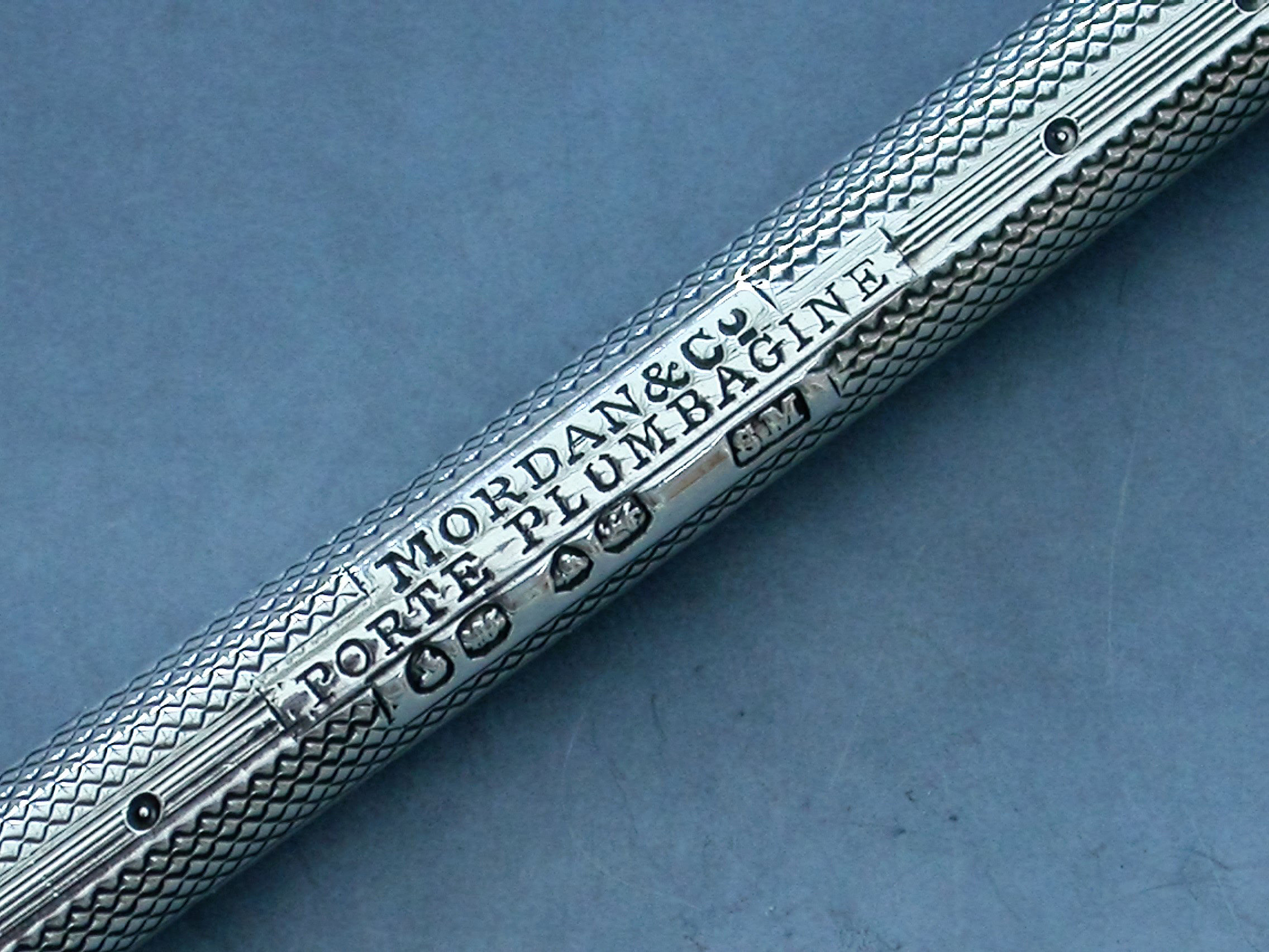 A rare fully hallmarked Victorian silver mechanical Porte Crayon known as the ""Porte Plumbagine"". The cylindrical body with engine turned line and dot decoration. The knarled cap rotates to propel the lead through the screw off square section nozzle.