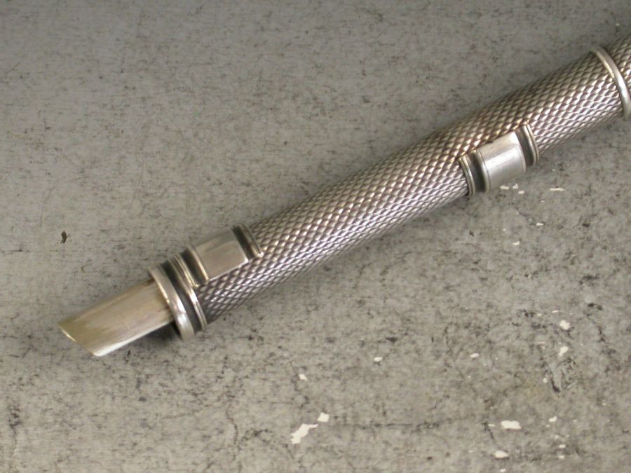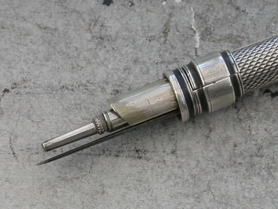 An extremely rare Victorian silver Patent ""Unique Pocket Companion"" with engine turned decoration to the body. The pocket companion comprises at one end, a slide out steel pen holder, a pencil and a pen knife. At the opposite end the terminal is inset with a citrine coloured seal stone and unscrews to reveal a lead reservoir. The case also unscrews at the centre to reveal the letter and coin balance which is graduated 1/4T to 11/2T and 1/4 ounce to 1 ounce. The ""T"" stands for Tola to measure Rupees and along with the Knife Blade rather than the more usual coin gauge, indicates that this version of the Unique Pocket Companion was made by Sheldon for use in the East Indies (other versions were also produced for use in America, France & Belgium with different scales)