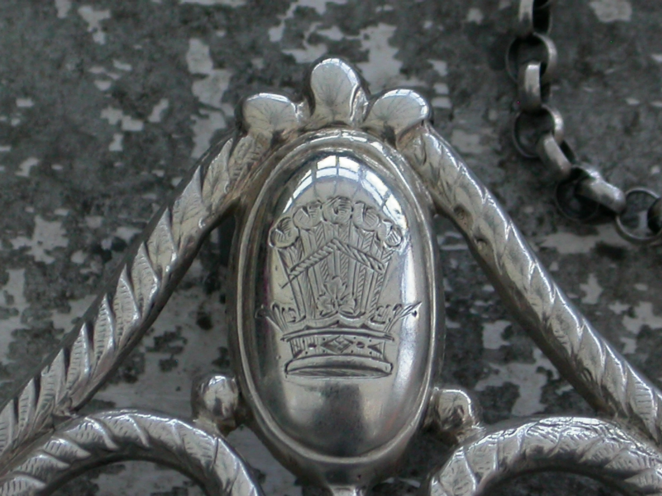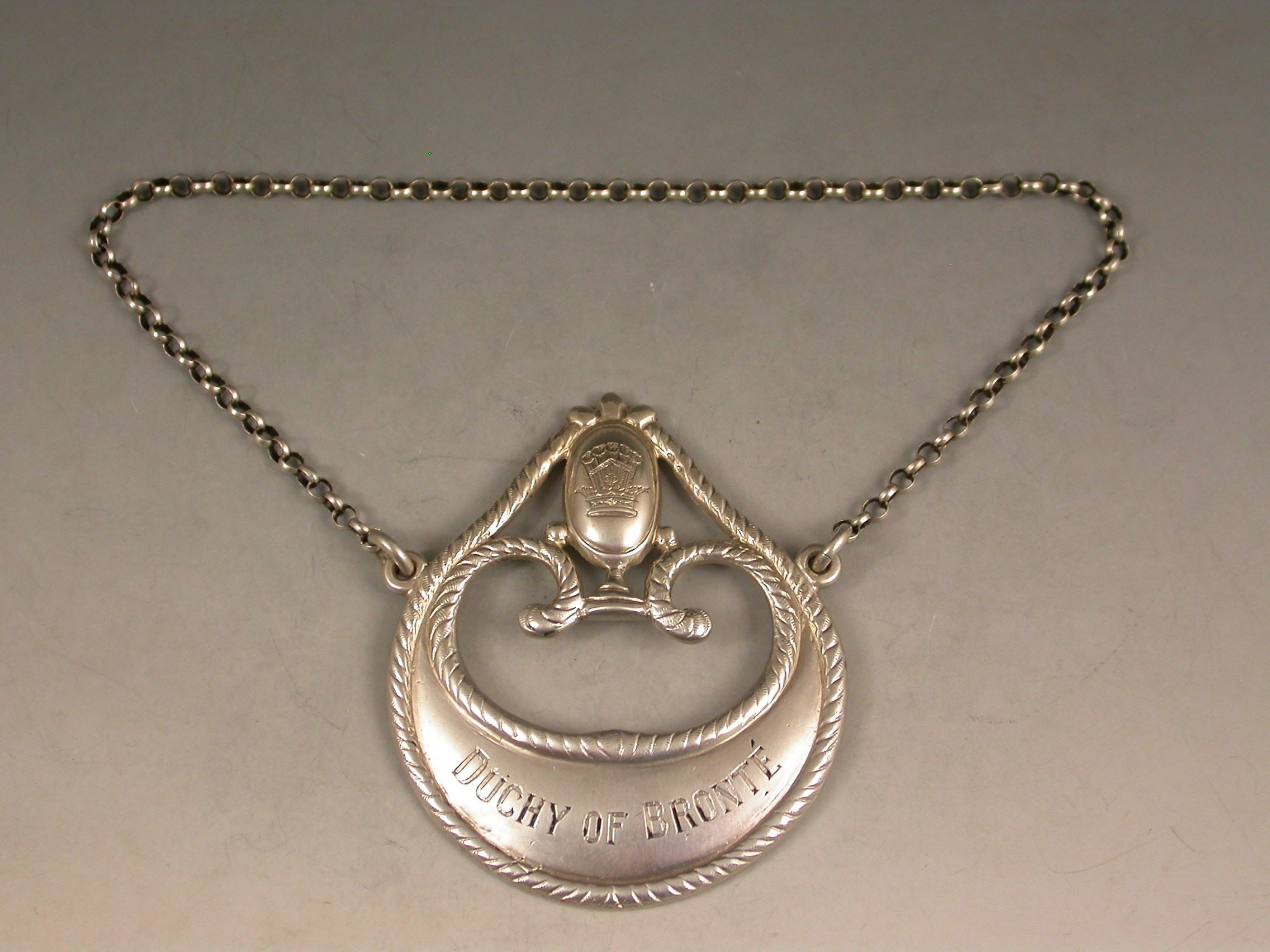 A rare Victorian silver Wine Label of enclosed crescent form with oval cartouche engraved with a crest and supported by swags with tied ribbon surmount and rope border, incised for Duchy Of Bronte.