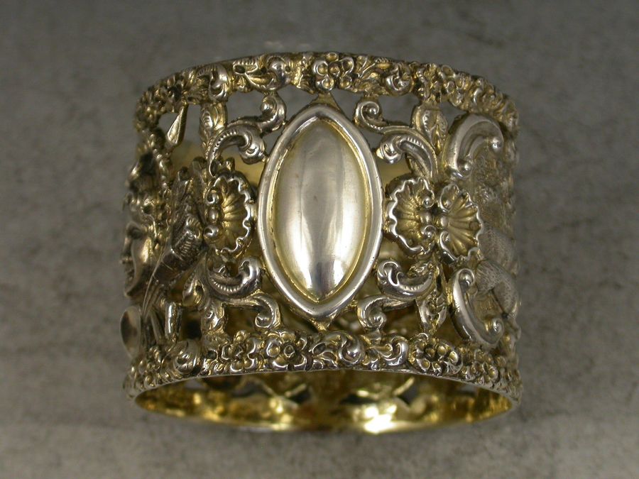 An extremely fine and rare Victorian pierced silver gilt Napkin Ring, chased and embossed with the ""Stag Hunt"" pattern. foliate borders and vacant oval cartouche.