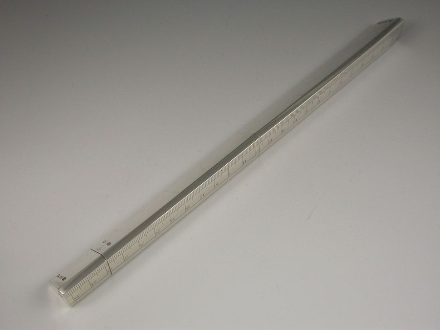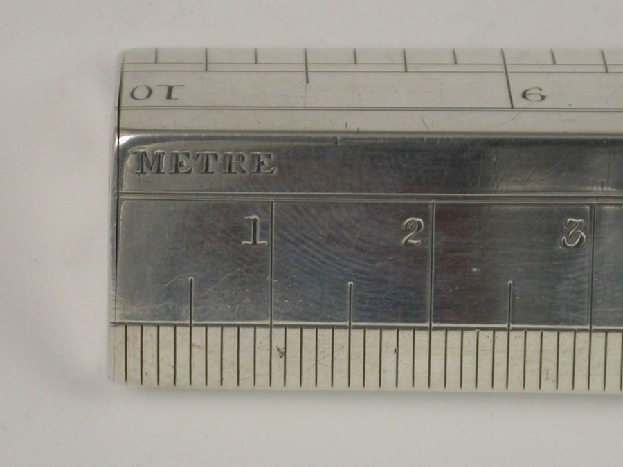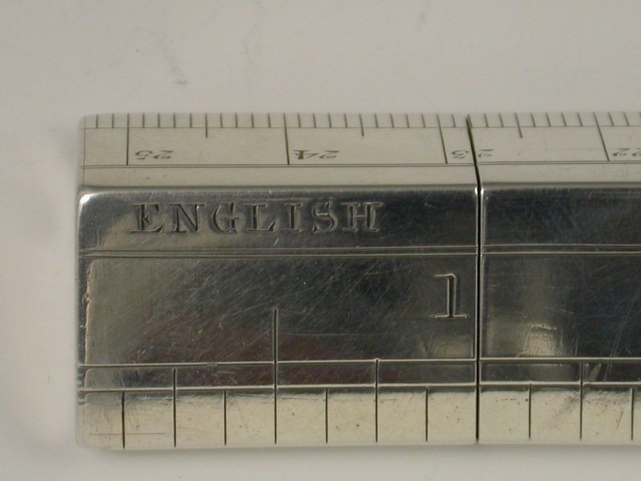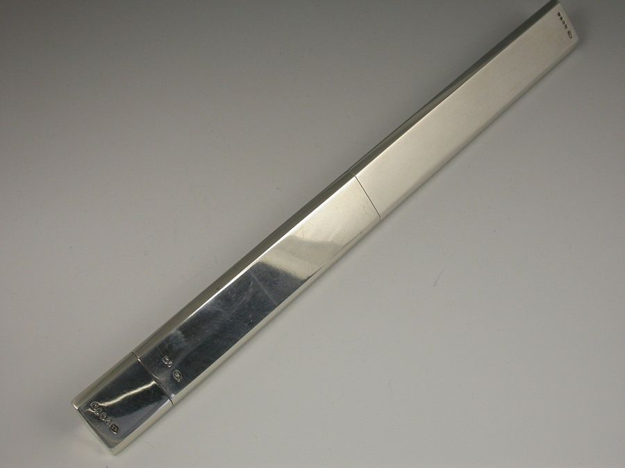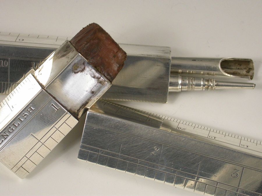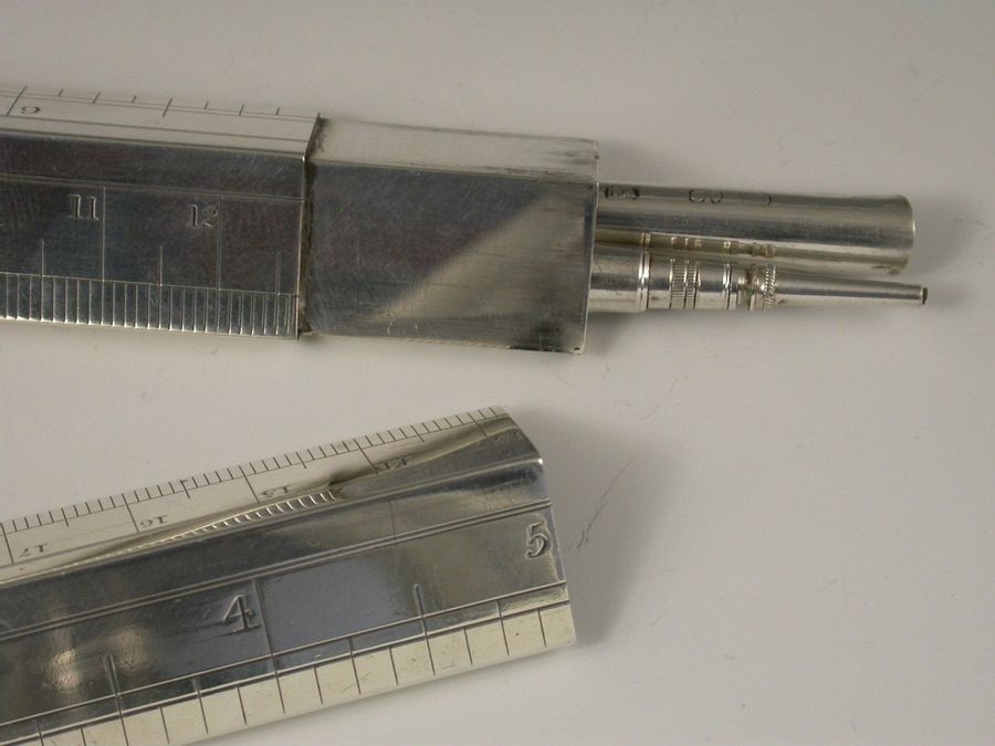 A rare Victorian silver 10” Rule of triangular form, engraved with imperial and metric scales (English and Metre). Containing its original silver Propelling Pencil and Dip Pen. Pull-off Sealing Wax Holder.
