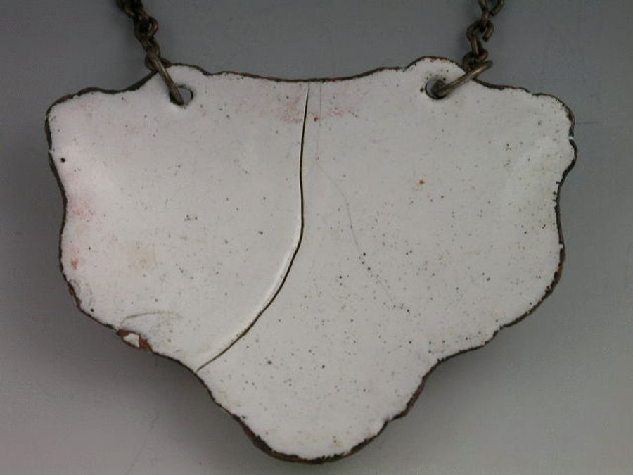 An extremely rare mid 18th century Battersea enamel on copper Wine Label for LISBON, of eschutcheon form, engraved by Simon Francois Ravenet for the Battersea factory and depicting two cupids standing beside a barrel with a castle in the background. In brightly coloured enamels. c1753 – 1756.