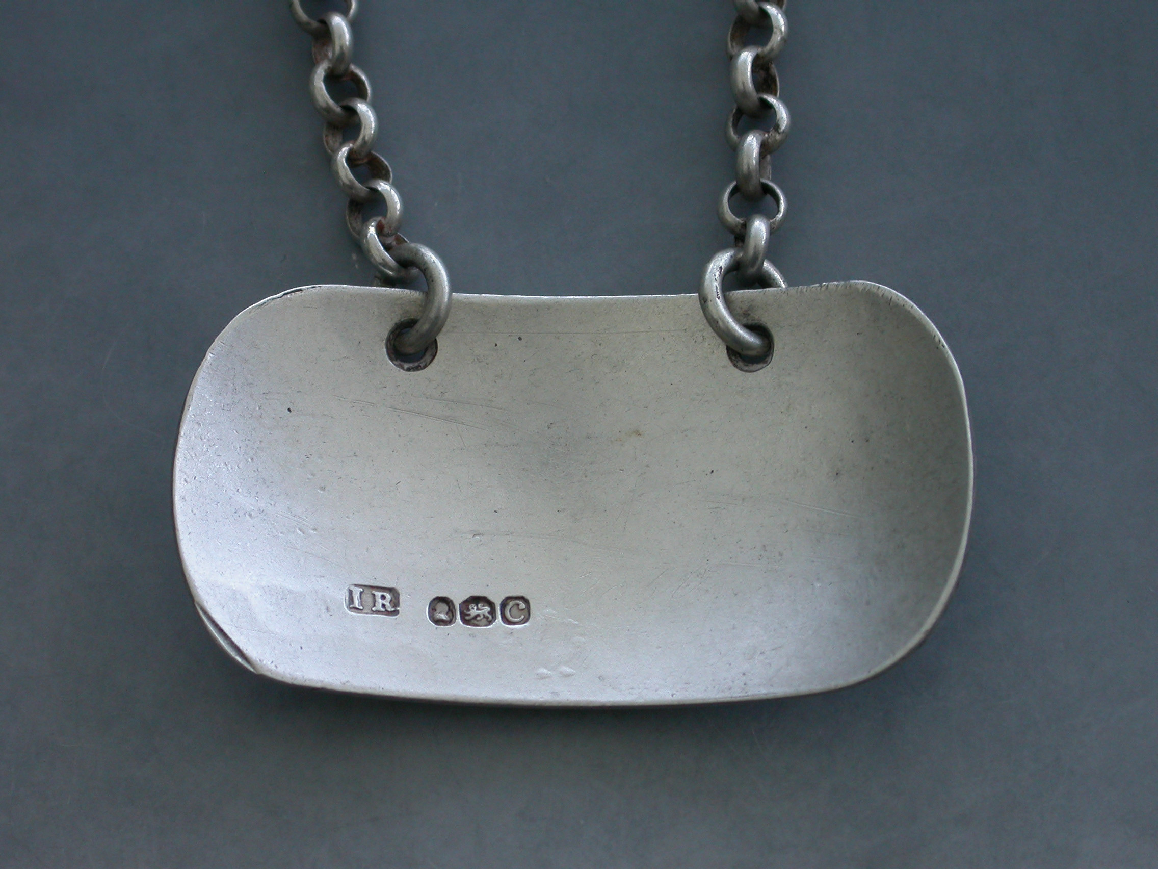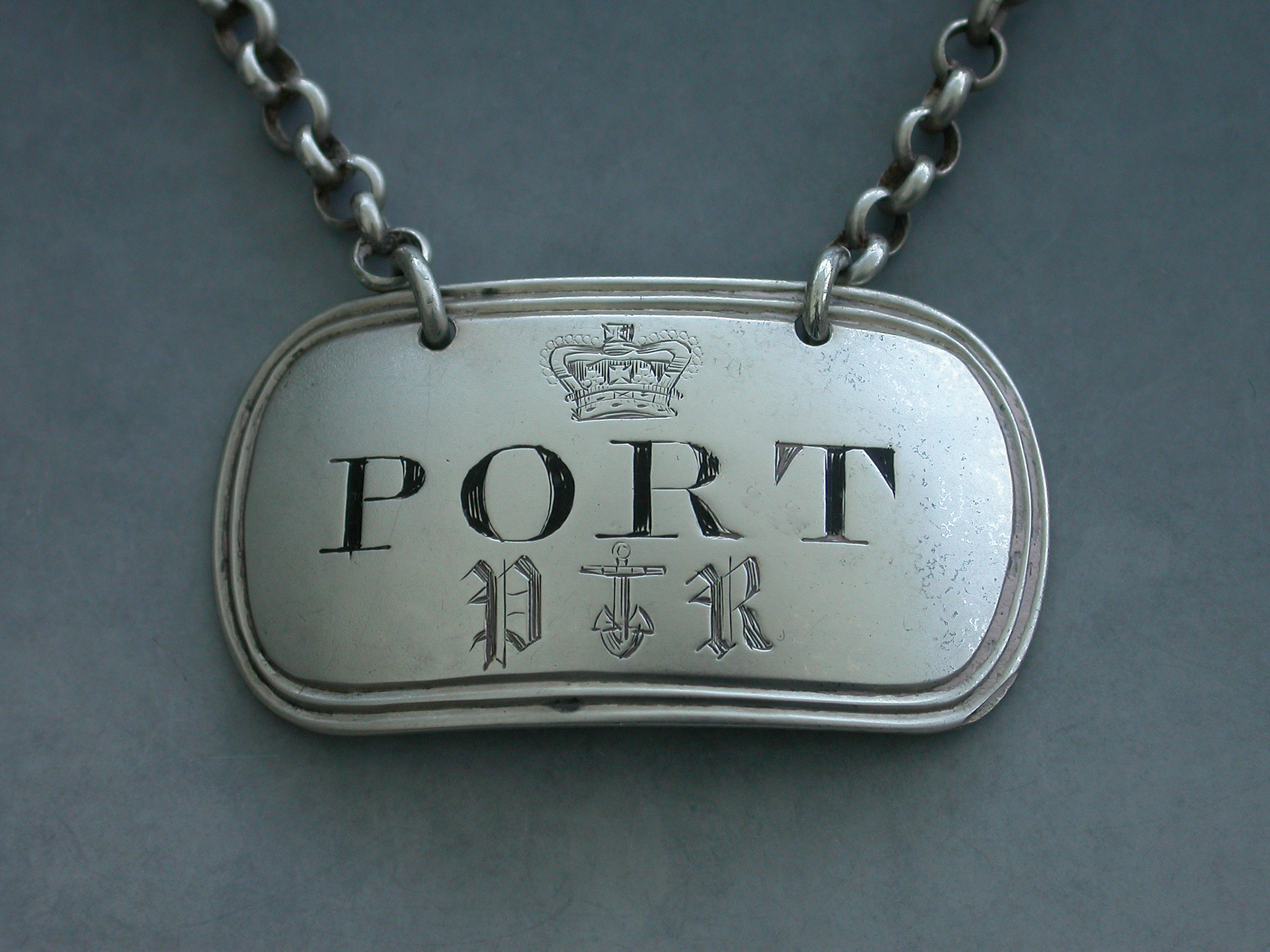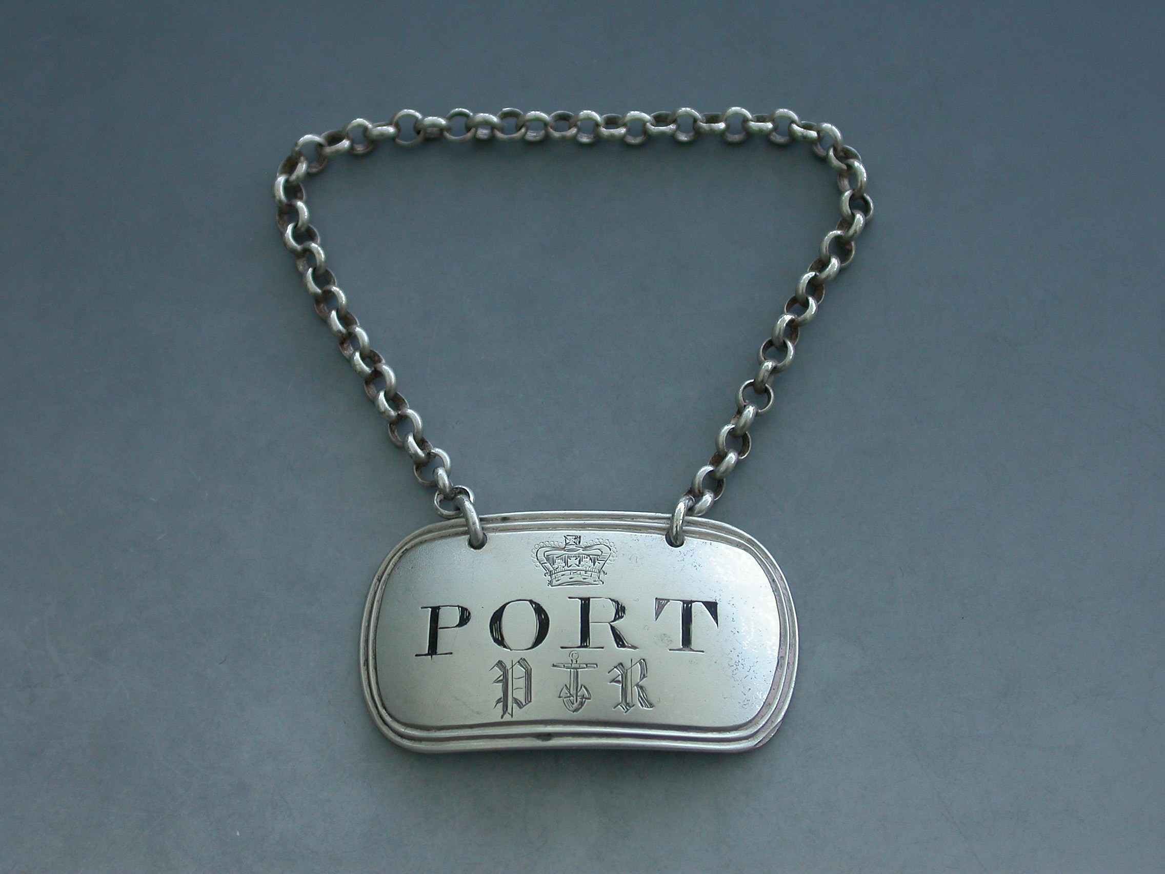 An extremely rare George III silver Wine Label of broad rounded rectangular form with double reeded border, incised for Port and engraved with the Royal Crown of George III above and an anchor between the initials P & R below the name. Presumed to be for the Royal Yacht ""Prince Regent"".