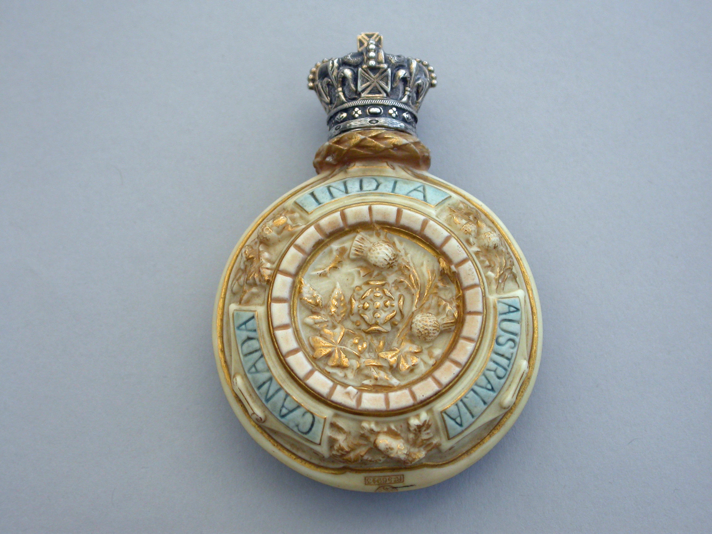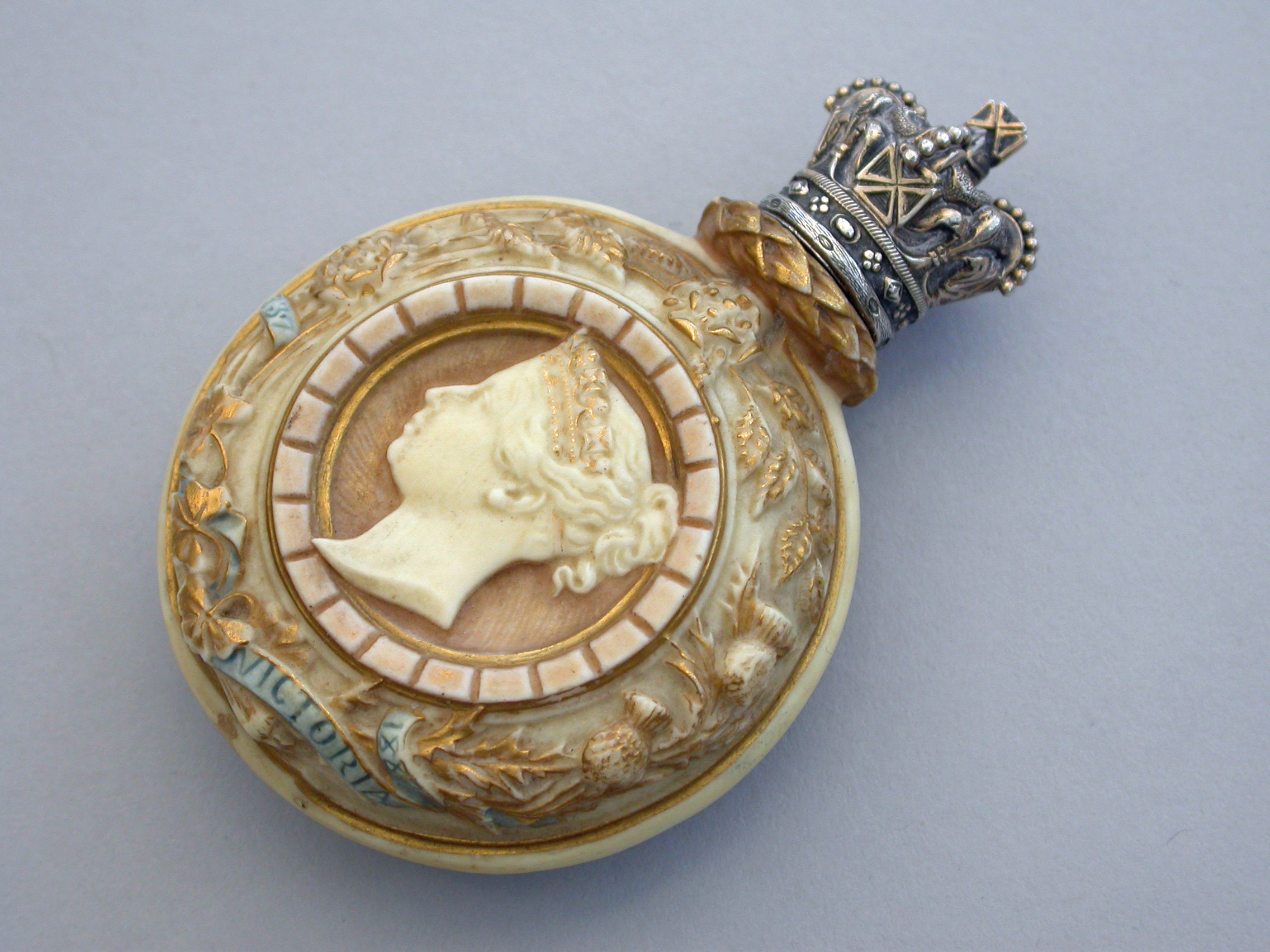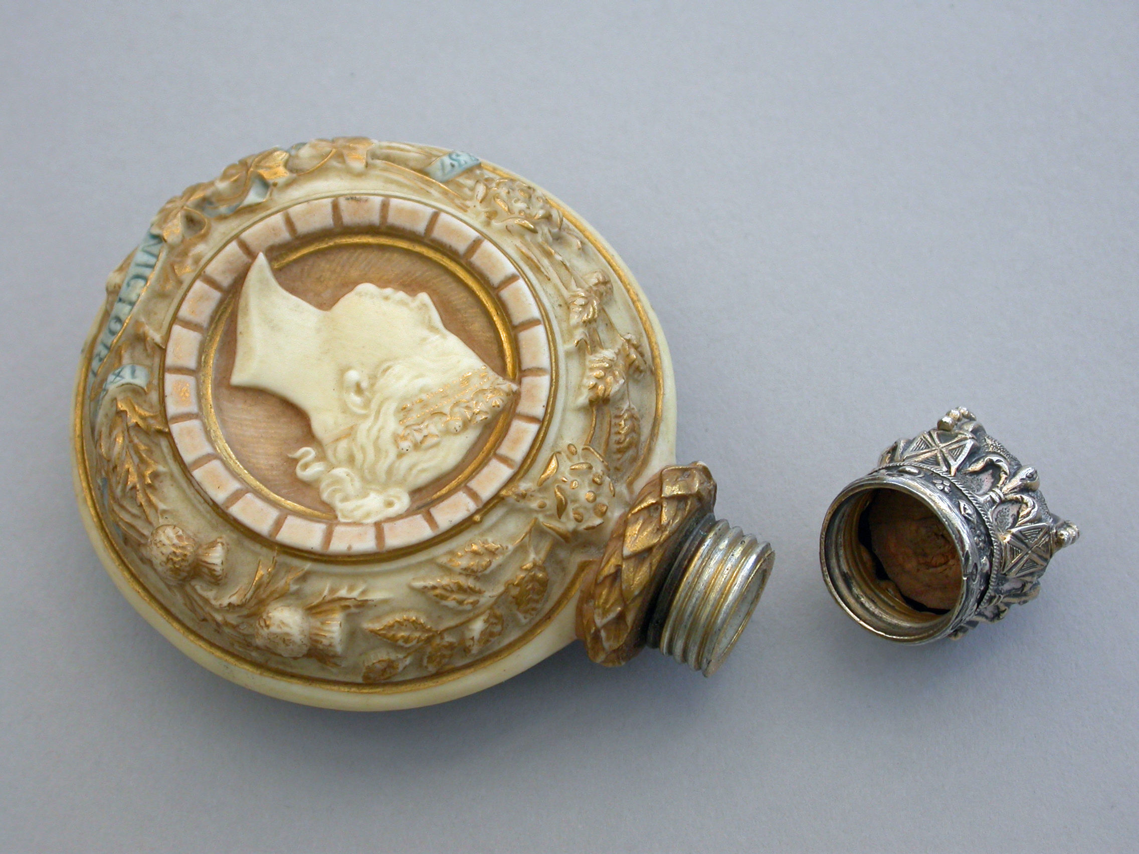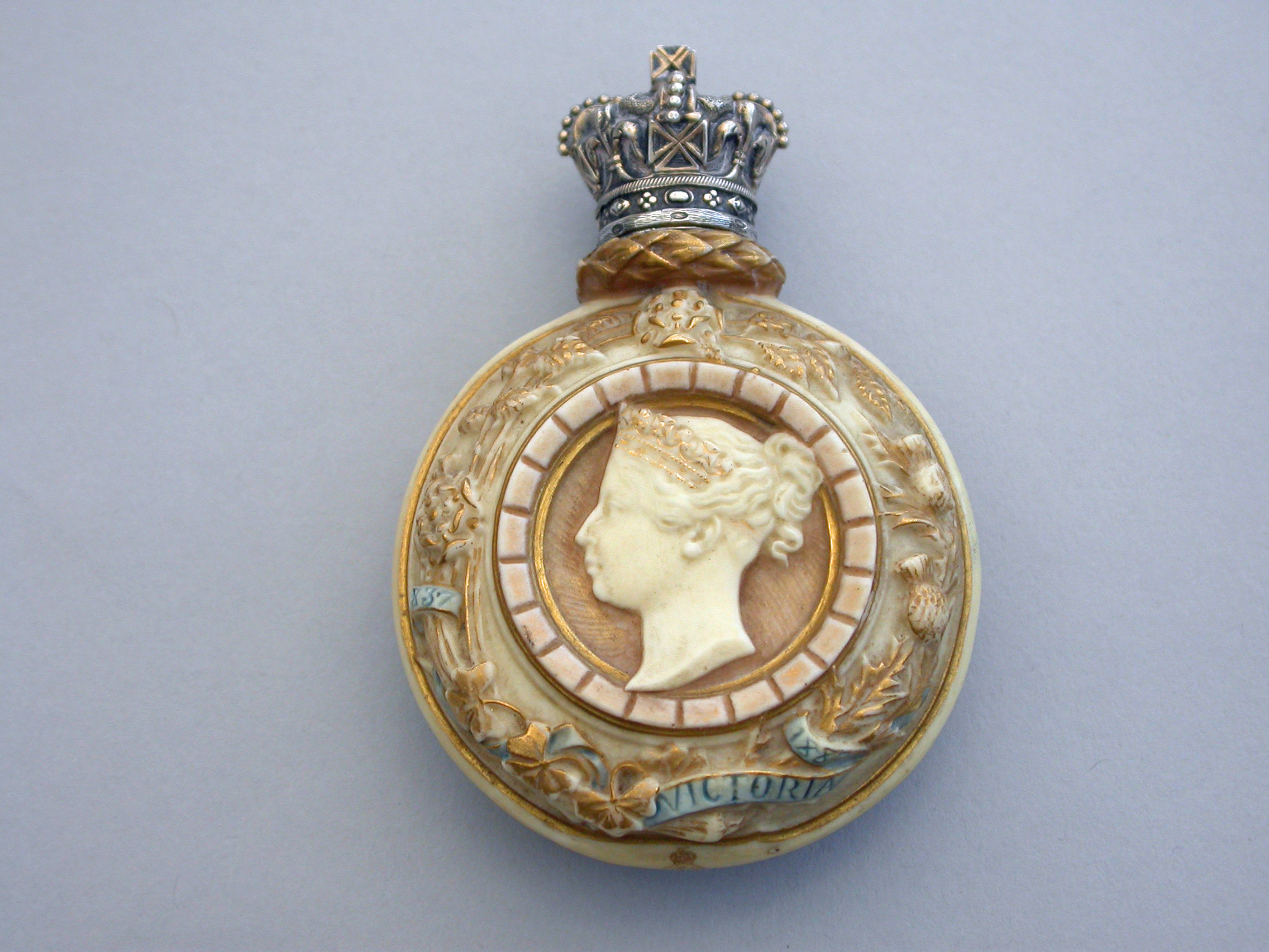 A rare silver gilt mounted Royal Worcester Porcelain Scent Bottle of flask shape, made to commemorate the Golden Jubilee of Queen Victoria in 1887. Decorated in bisque colours highlighted in gilt and sky blue and depicting a bust of the young Victoria to one side, the flowers of the union to the reverse, oak leaf and acorn borders with banners of the three Commonwealth Countries - India, Canada and Australia. The unmarked silver gilt screw-on lid formed as a Royal Crown.