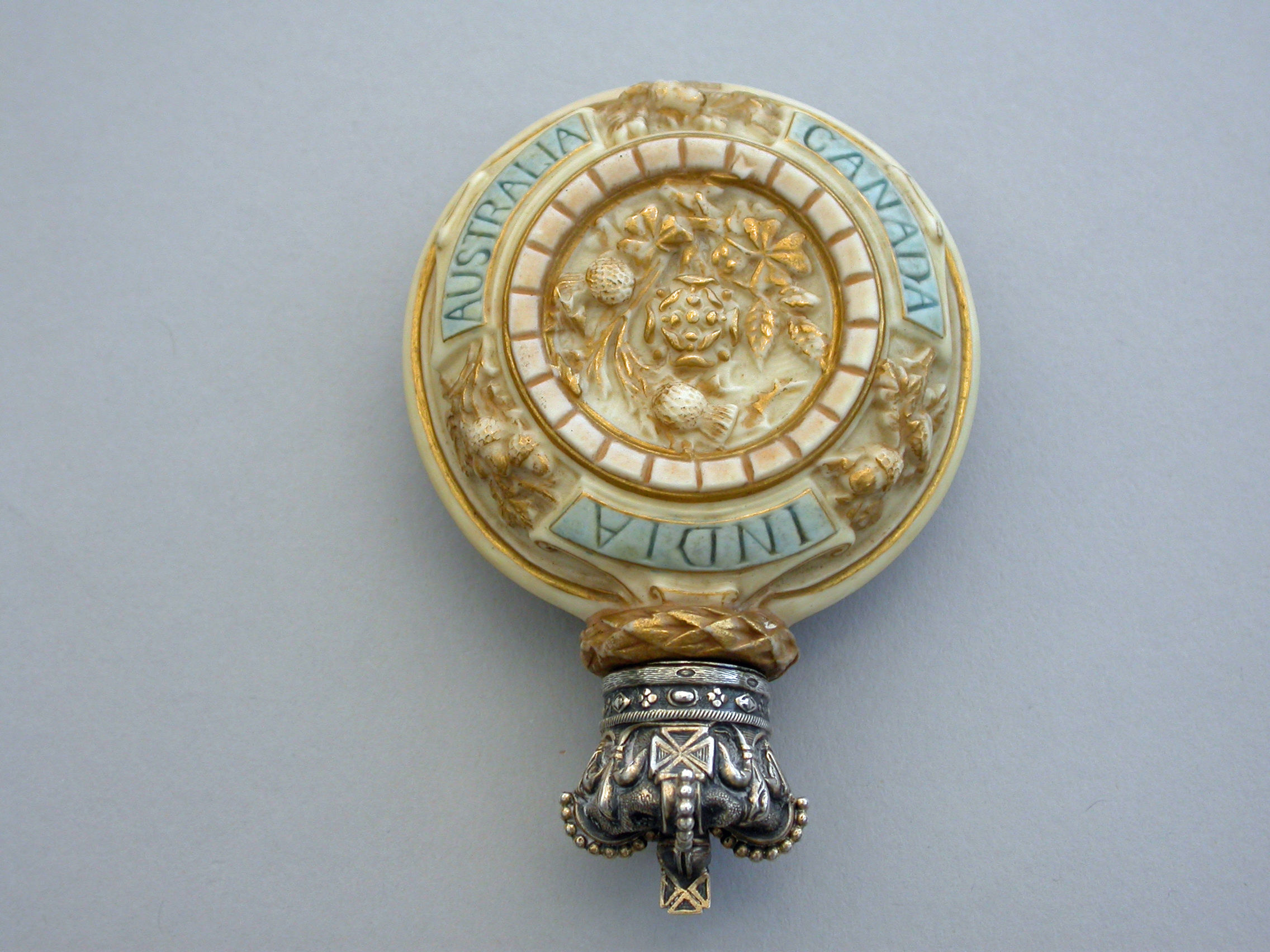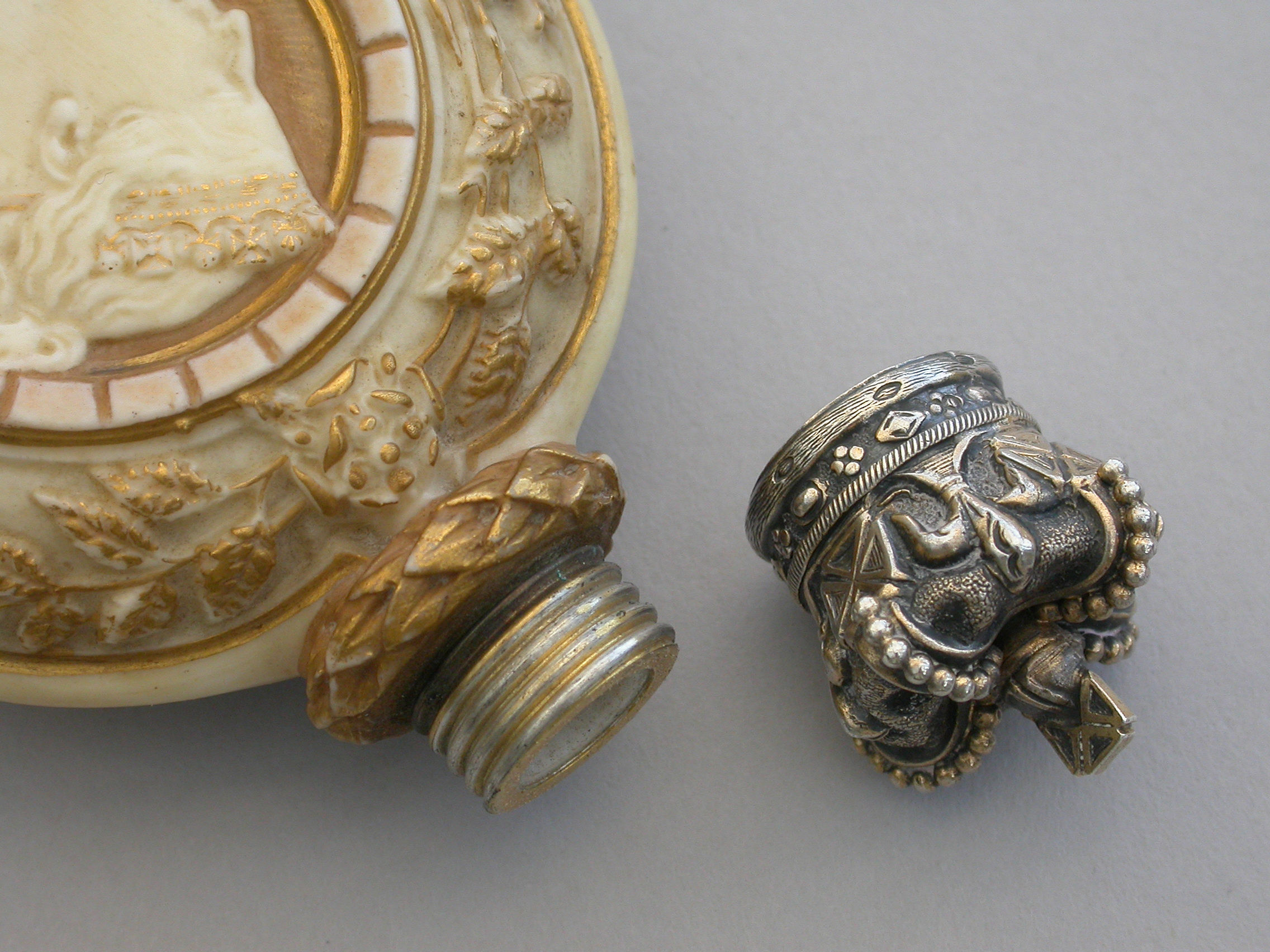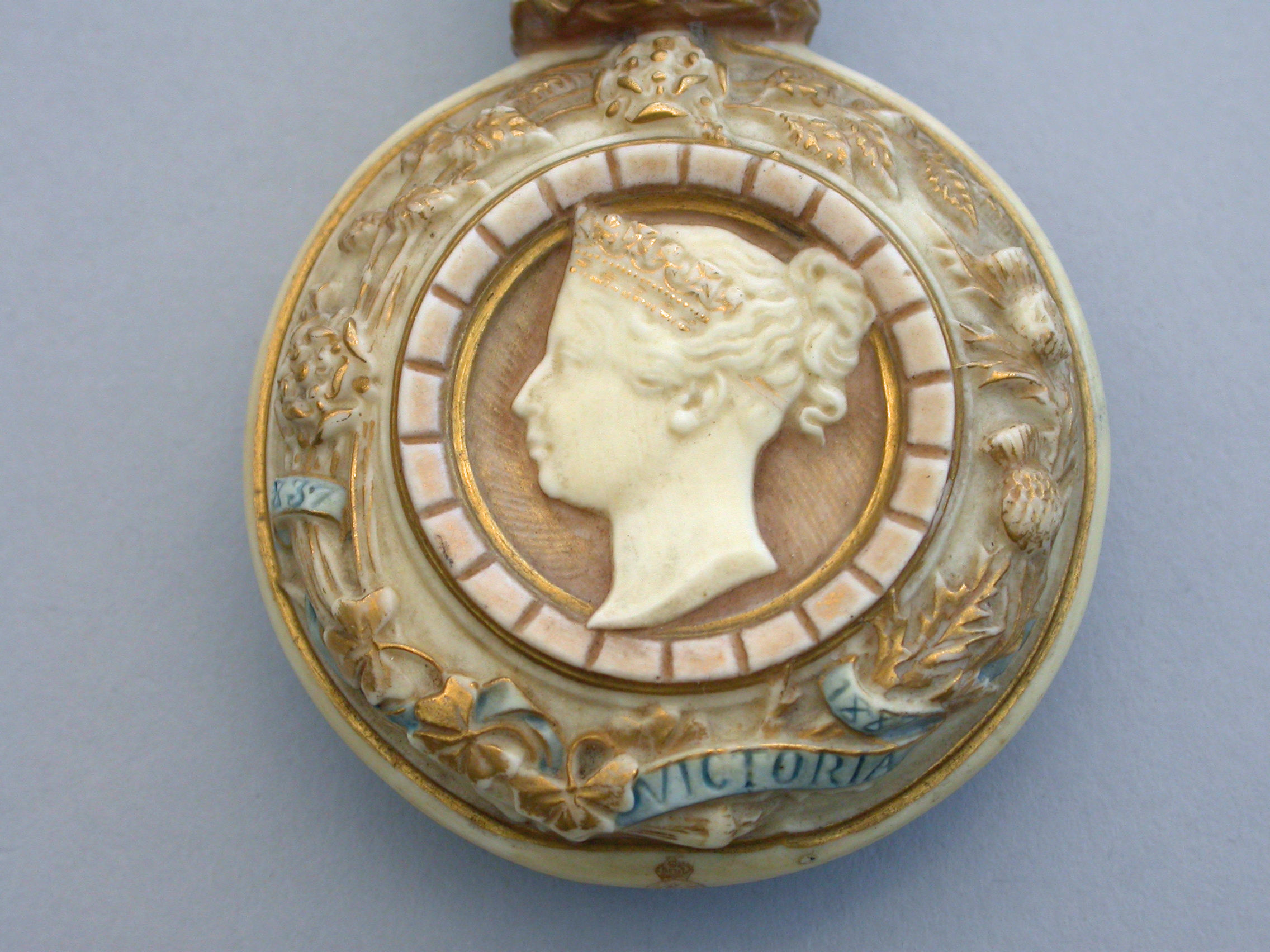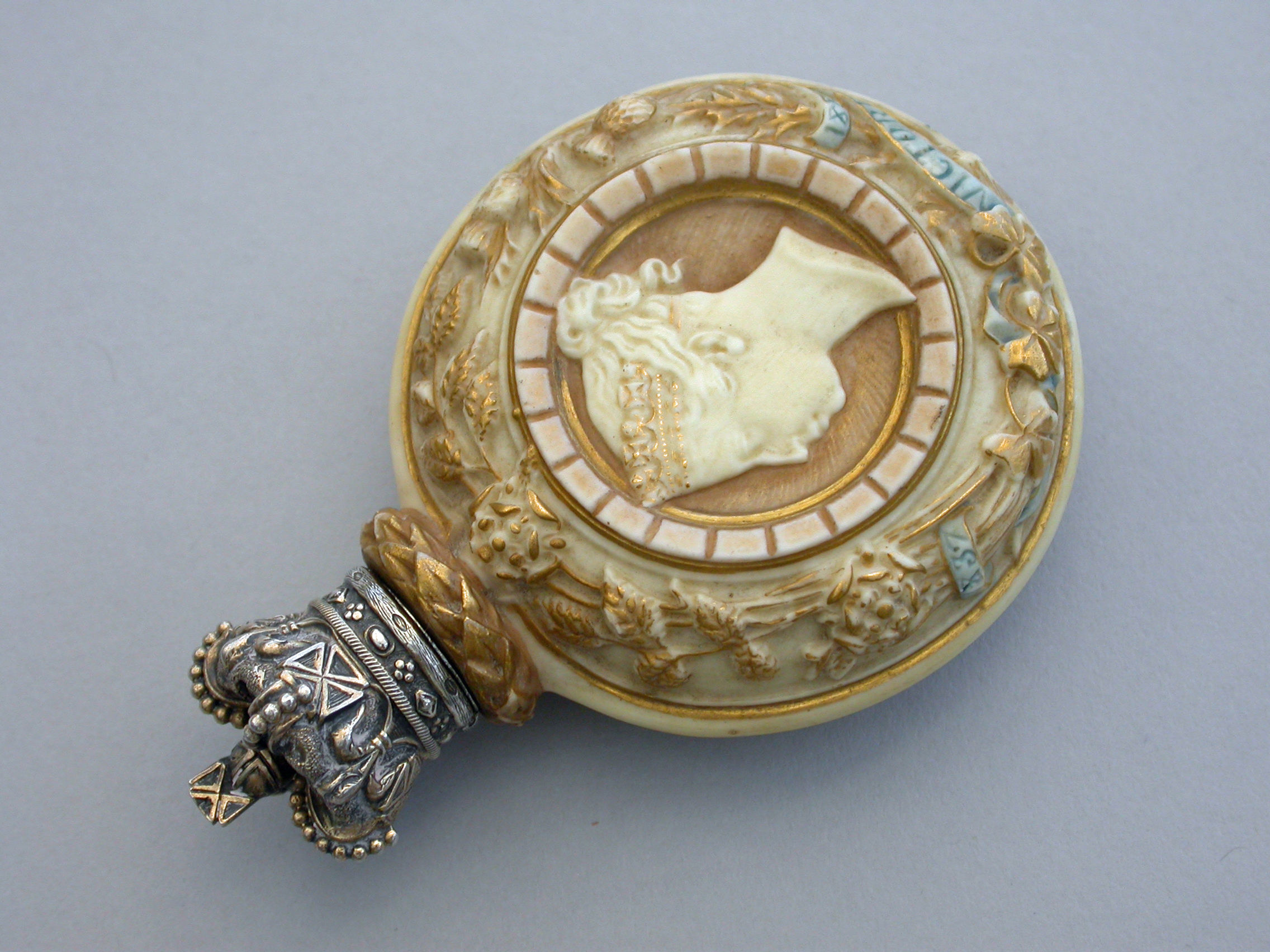 A rare silver gilt mounted Royal Worcester Porcelain Scent Bottle of flask shape, made to commemorate the Golden Jubilee of Queen Victoria in 1887. Decorated in bisque colours highlighted in gilt and sky blue and depicting a bust of the young Victoria to one side, the flowers of the union to the reverse, oak leaf and acorn borders with banners of the three Commonwealth Countries - India, Canada and Australia. The unmarked silver gilt screw-on lid formed as a Royal Crown.