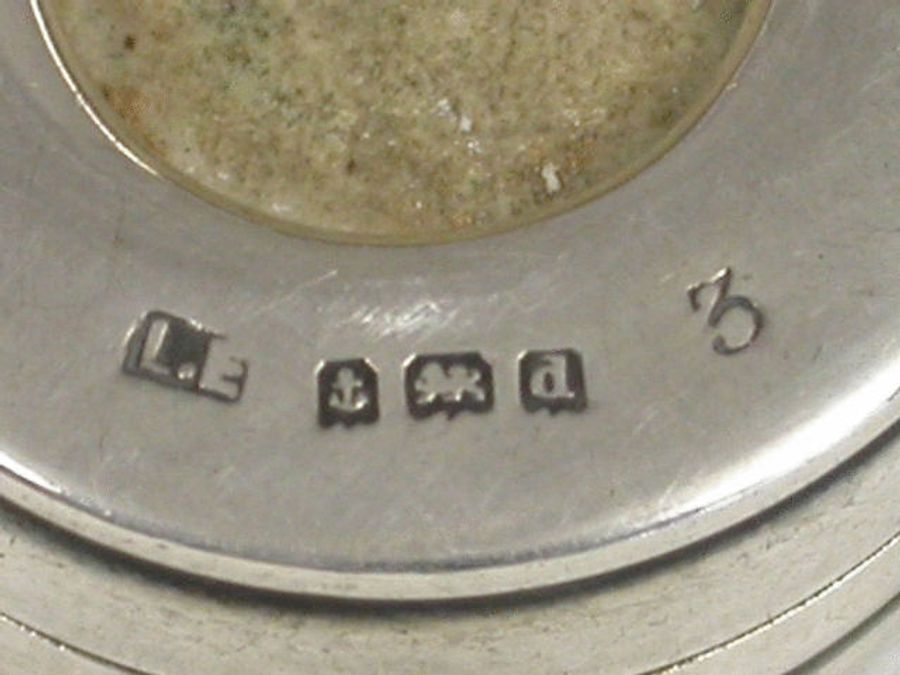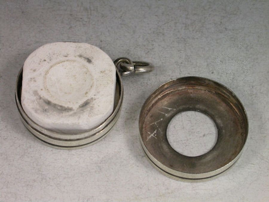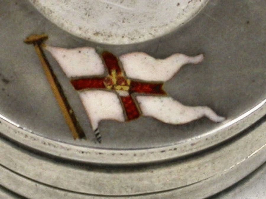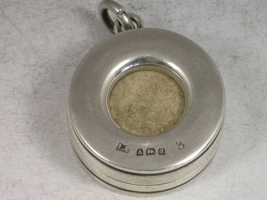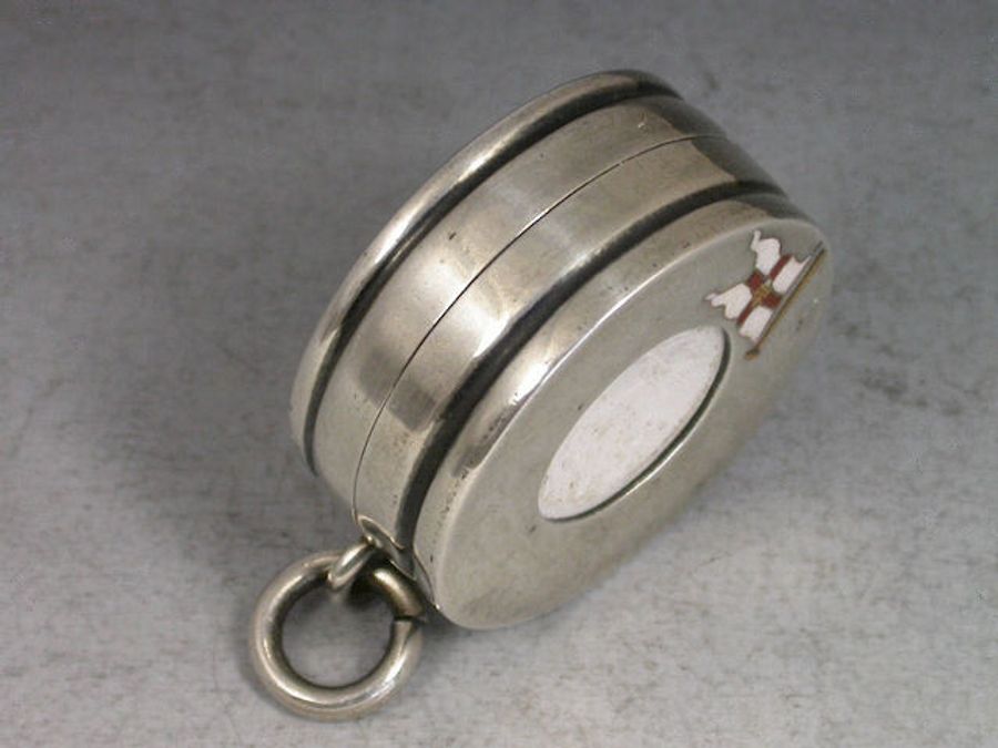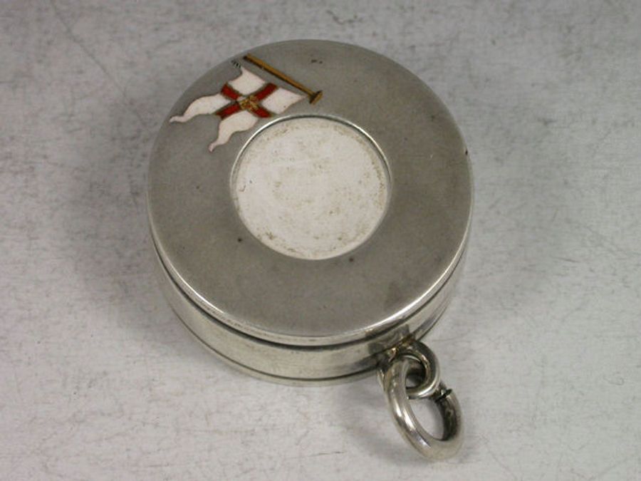 A rare Edwardian silver Billiards Cue Chalker, of circular drum shape with pull-off cover and attached suspension ring, decorated with enamelled Broad Pennant of the Commodore of the Royal Yacht Squadron.