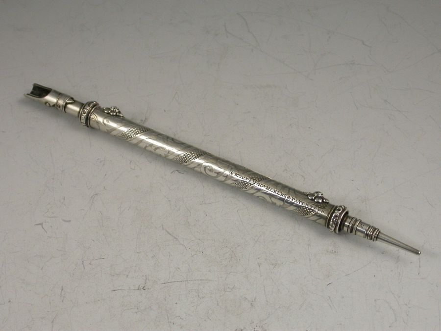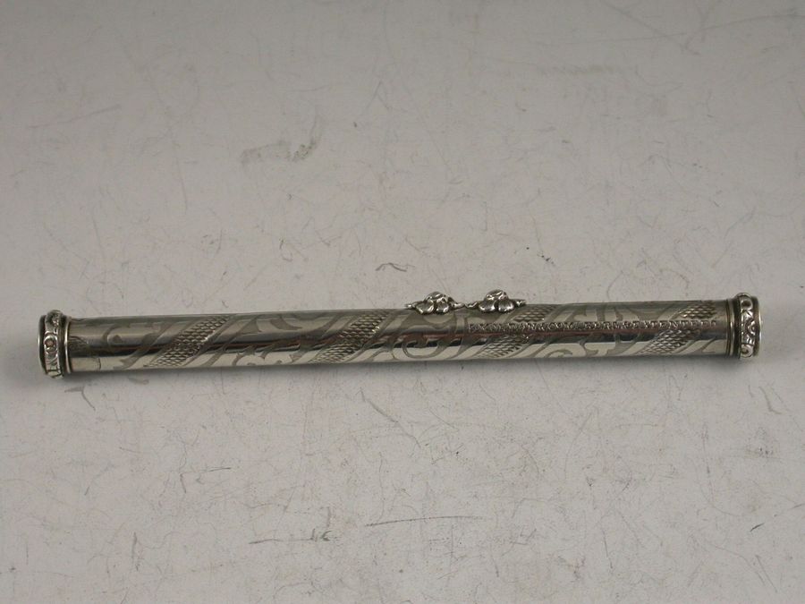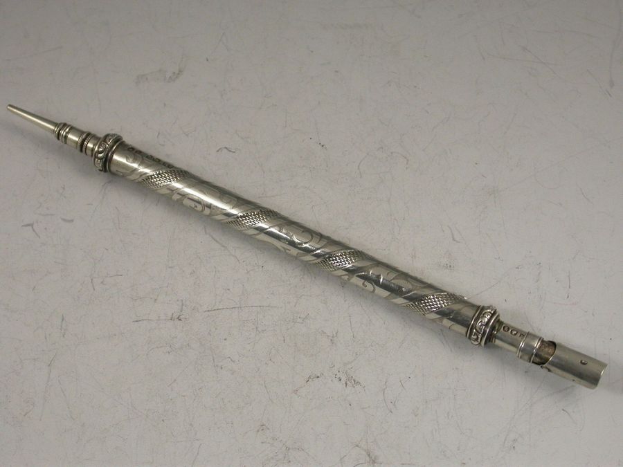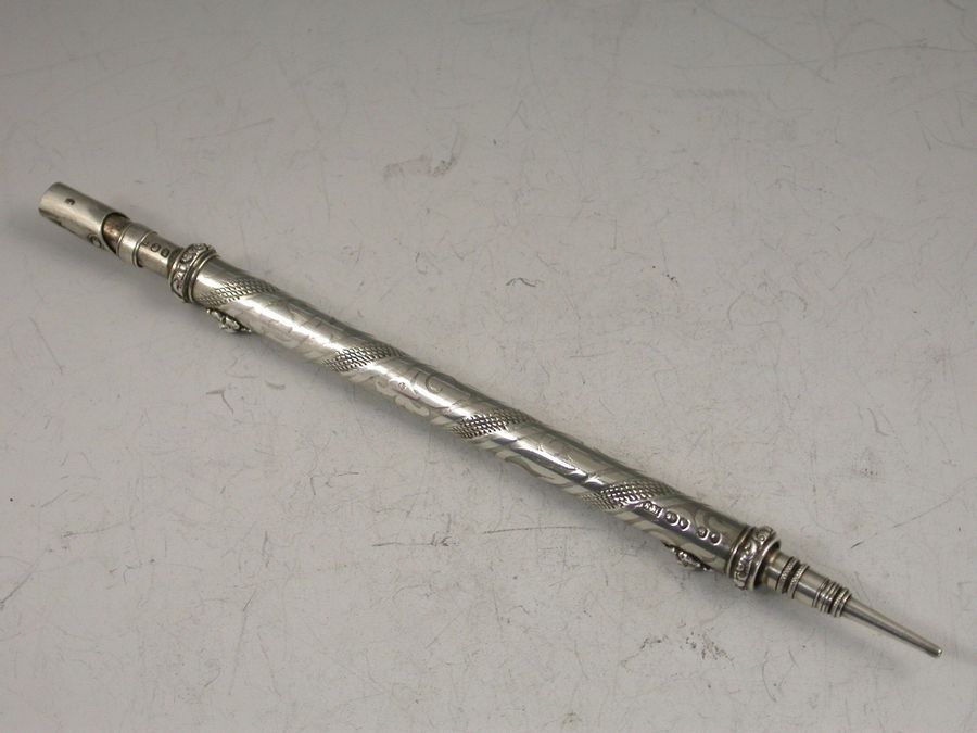 A fine early Victorian silver combined Pen and Pencil with sliding mechanisms, the pen with Bramah type nib holder, the cylindrical body with bright cut engraved decoration.