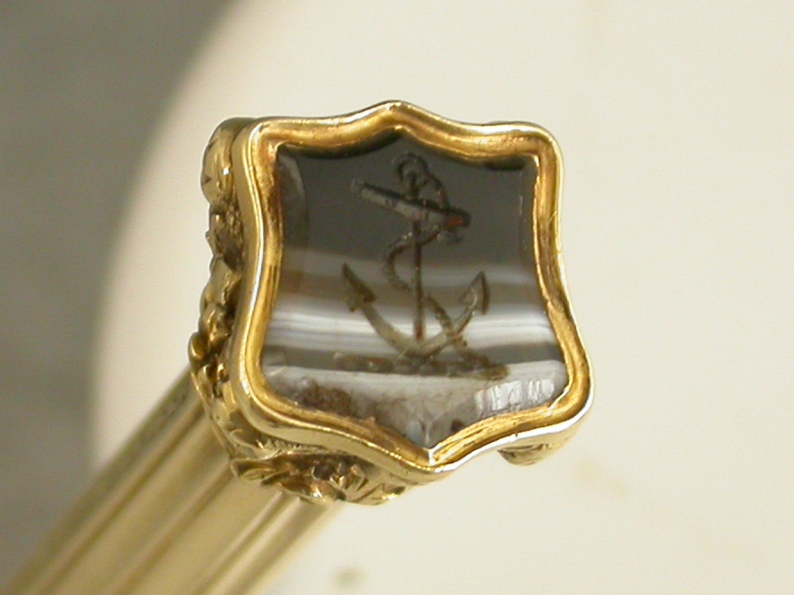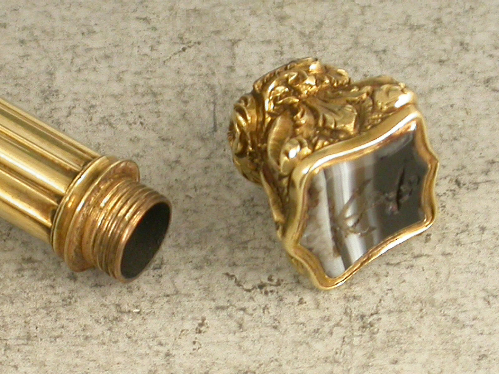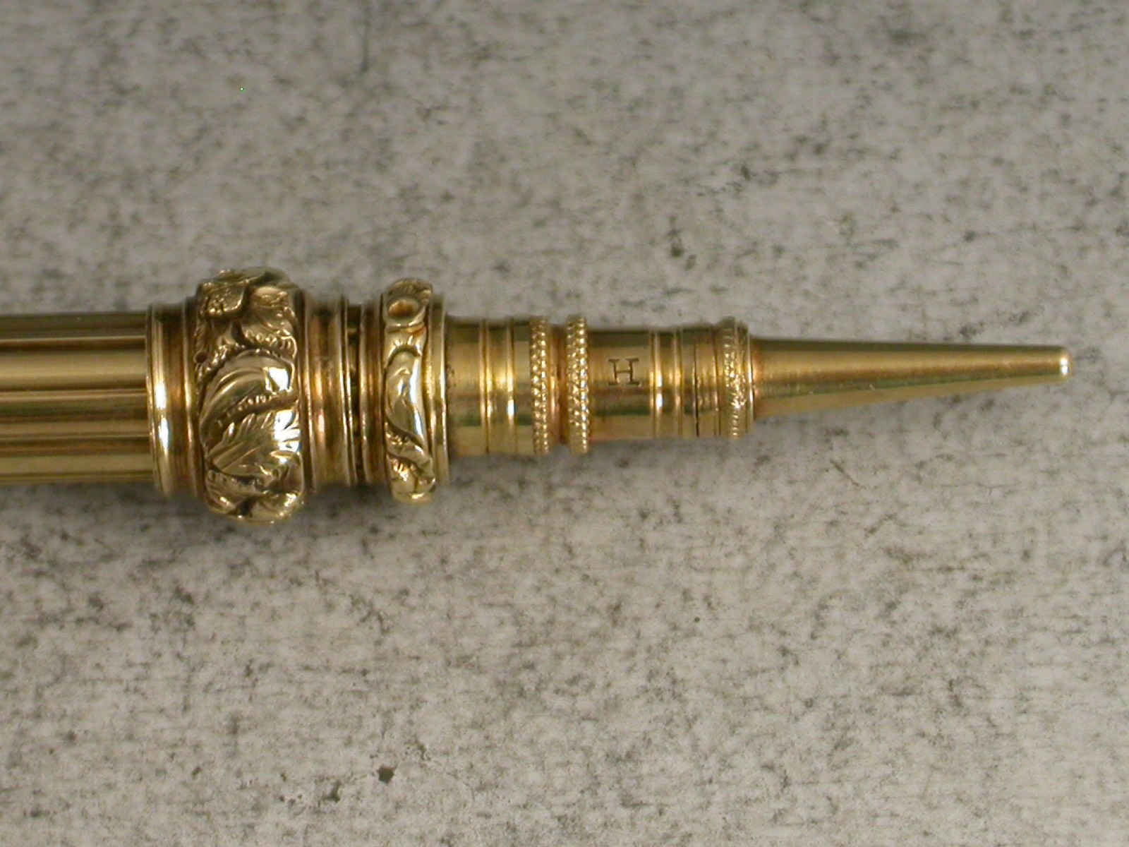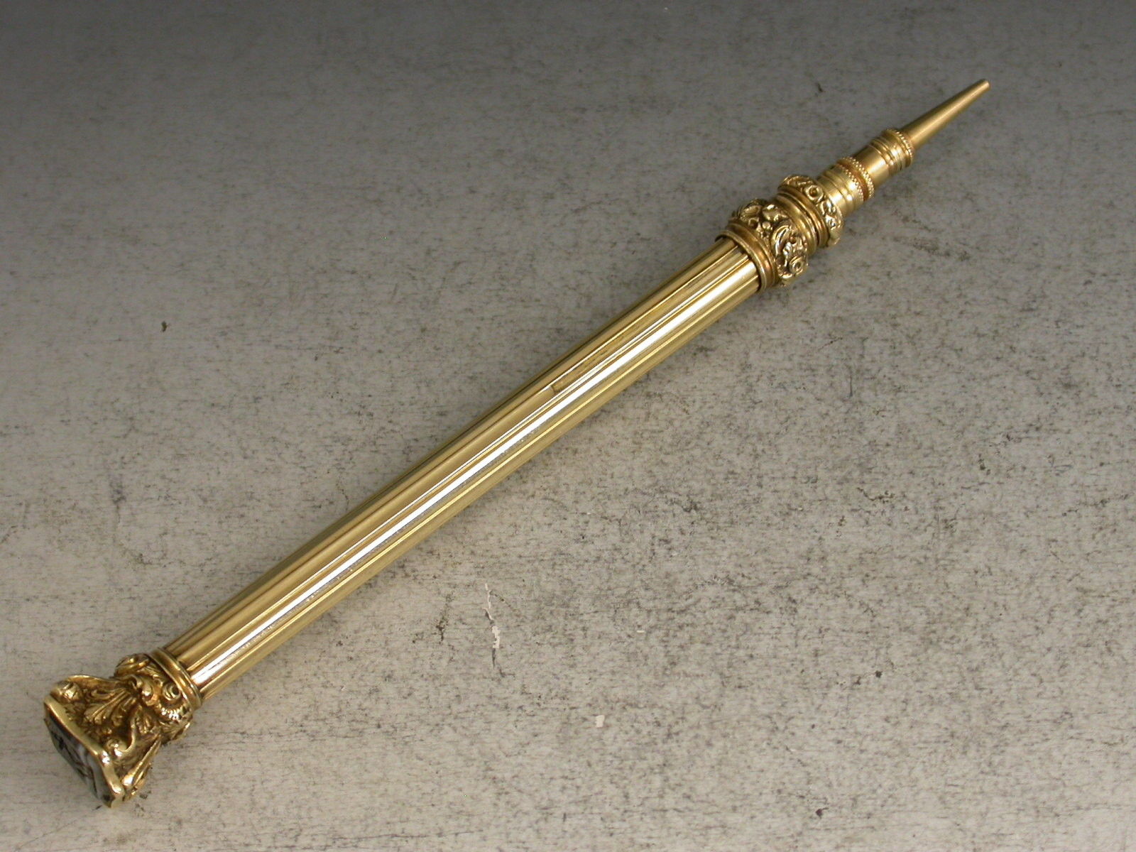 A fine quality William IV / early Victorian gold sliding Propelling Pencil with reeded barrel, the screw off end cap set with an agate seal stone engraved with a fouled anchor. Stamped S.Mordan & Co, Makers & Patentees.