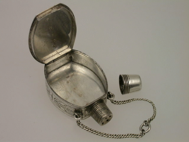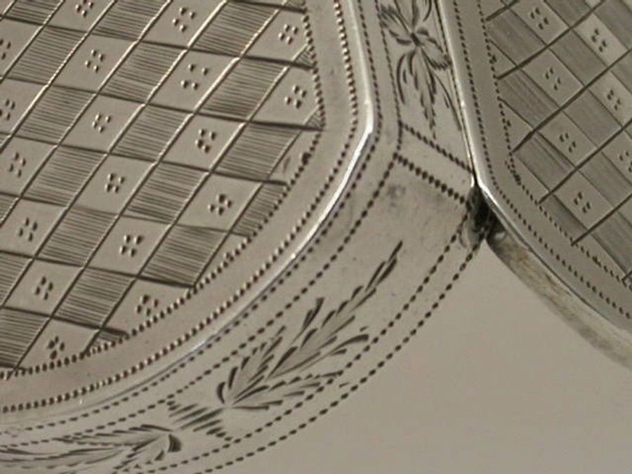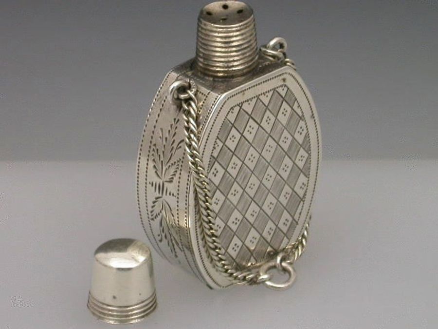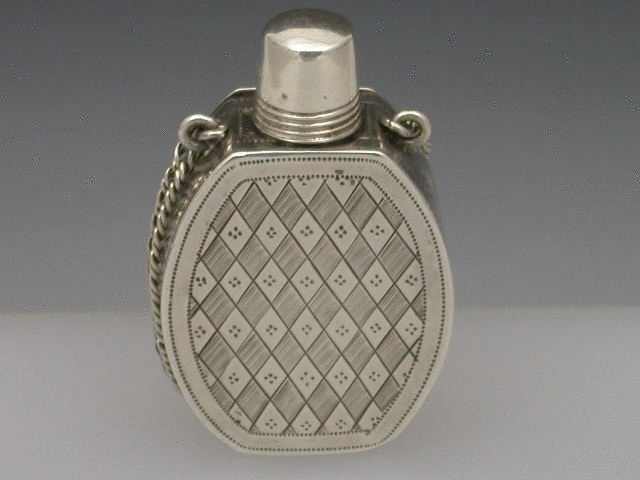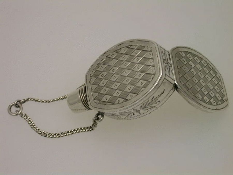 An extremely fine and rare George III silver Vinaigrette of ""Scent Bottle"" form, the screw off lid revealing the pierced top, flush hinge to shaped oval body, beautifully bright-cut engraved with foliate and chequorboard patterns. Attached suspension chain.