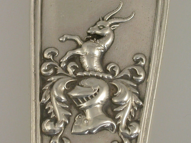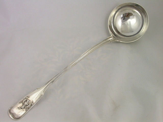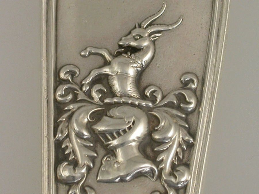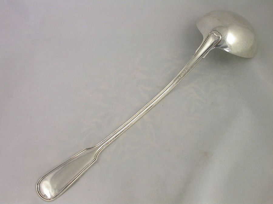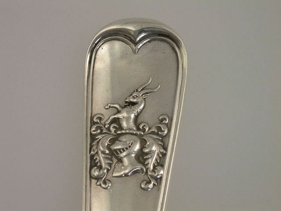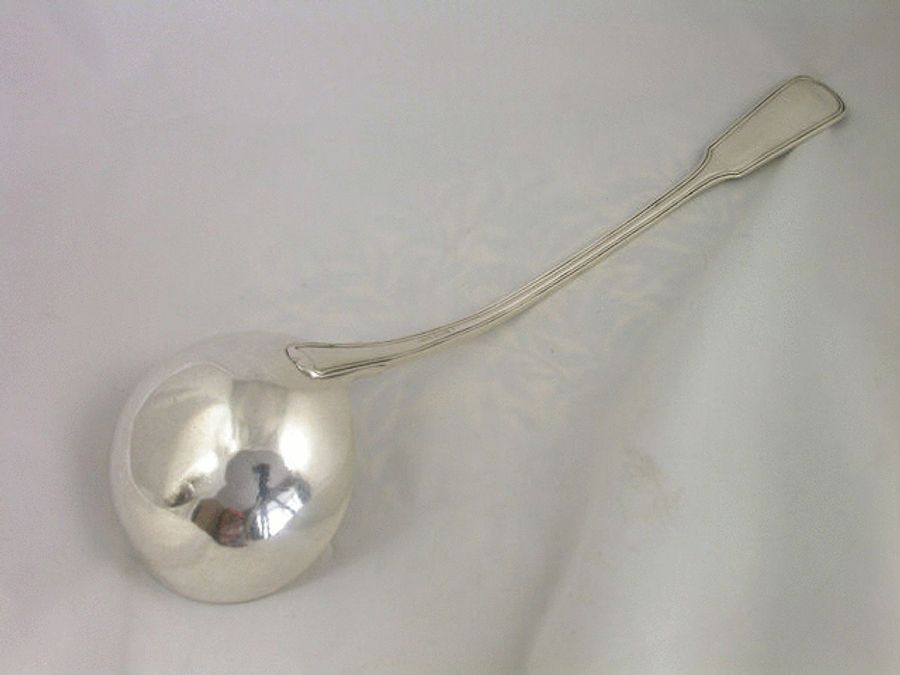 A magnificent large and heavy gauge William IV Scottish silver Soup Ladle, of fiddle and thread variant pattern with a die-struck crest to the handle depicting a demi-goat saliant sa., gorged with a wreath of laurel ppr, above a helm and mantling, probably for Bartholomew of Glasgow.