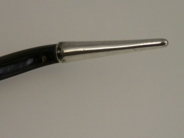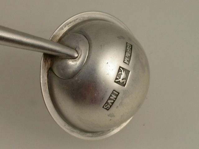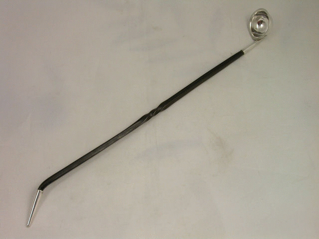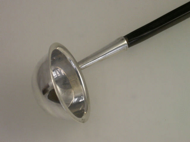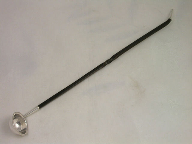 A rare Victorian Scottish Provincial silver Condiment Ladle with small circular bowl and twisted whalebone handle with silver end cap at an angle.