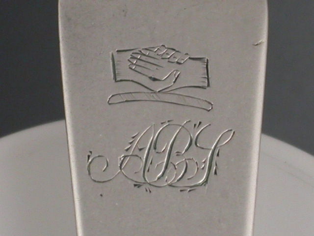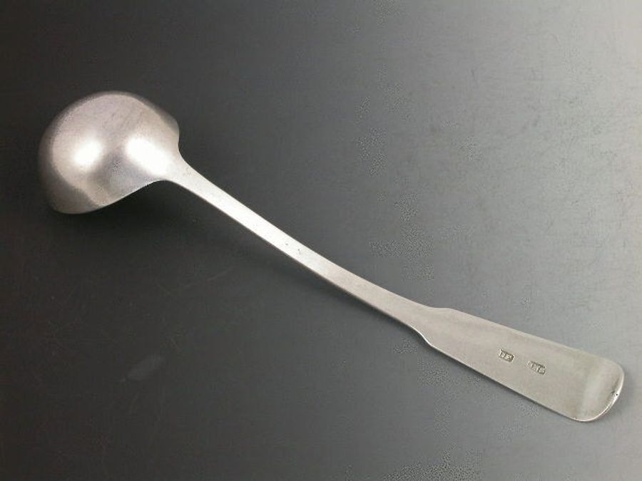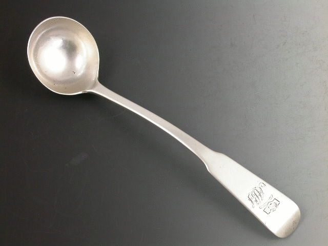 A rare early 19th century Scottish Provincial silver Toddy Ladle of plain fiddle pattern, the handle engraved with a crest depicting clasped hands and the initials ABJ.
