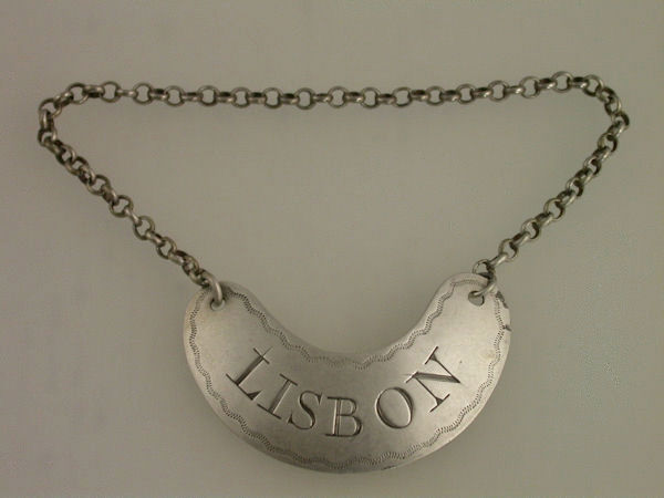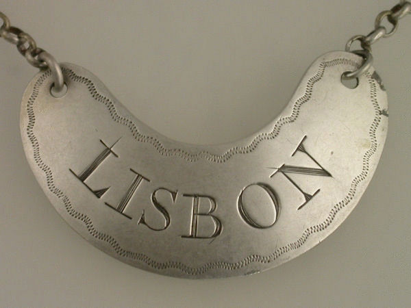 A rare George III Scottish Provincial silver Wine Label of rounded crescent form with scratch engraved wavy border, incised for LISBON.