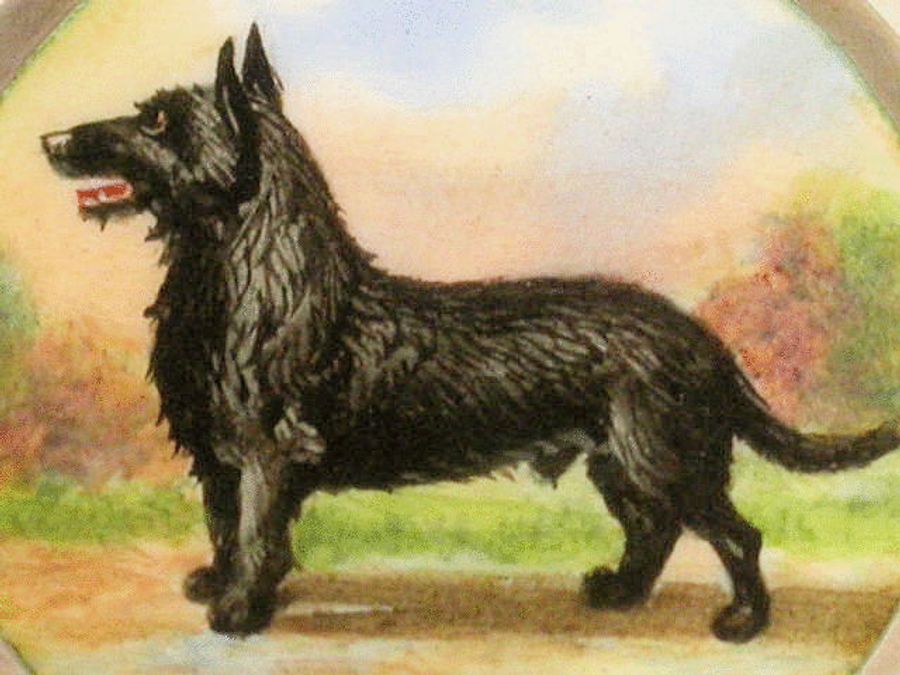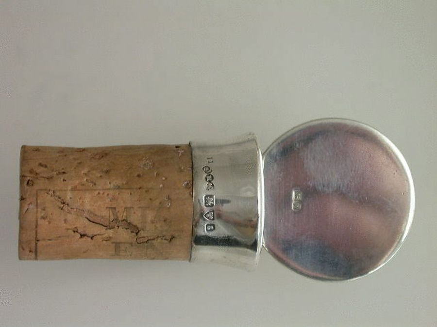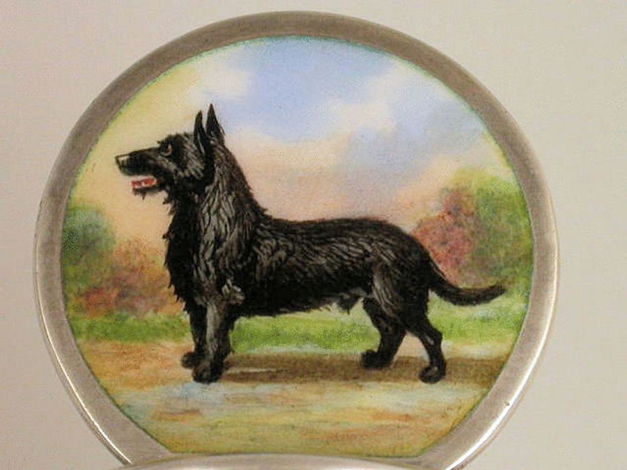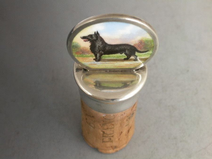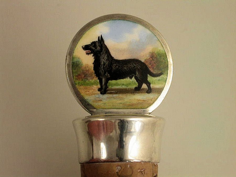 A rare Edwardian silver mounted cork Bottle Stopper, the disc shaped handle with finely enamelled portrait of a Scottish Terrier in landscape scene.