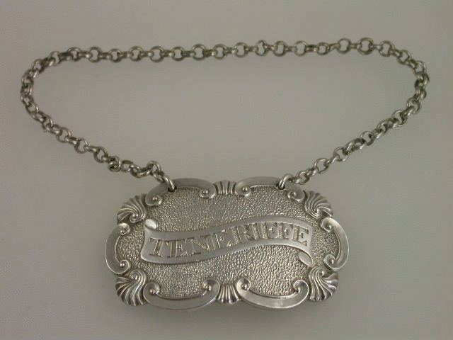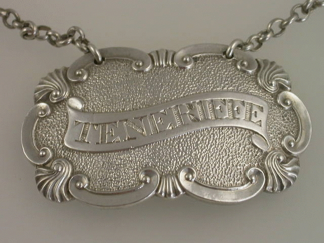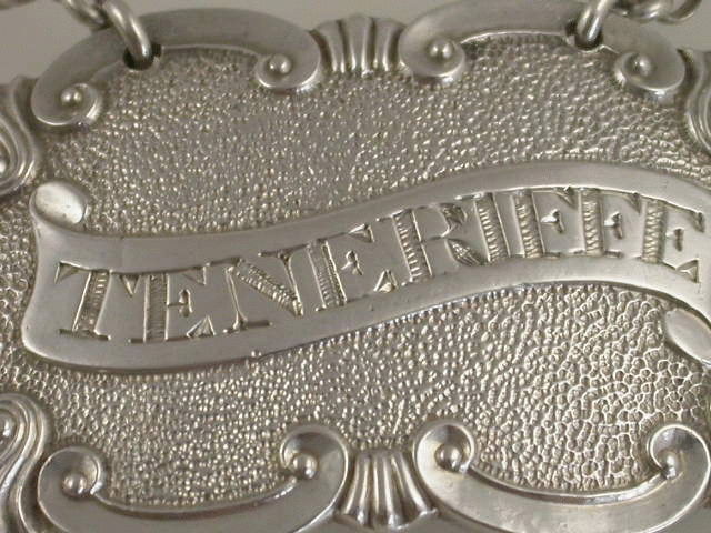 A very good quality George III heavy cast silver Wine Label of shaped oval form with shell and scroll border, incised for Teneriffe on a scroll shaped name plate, on matted ground.