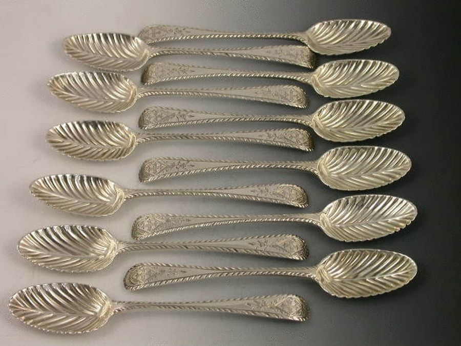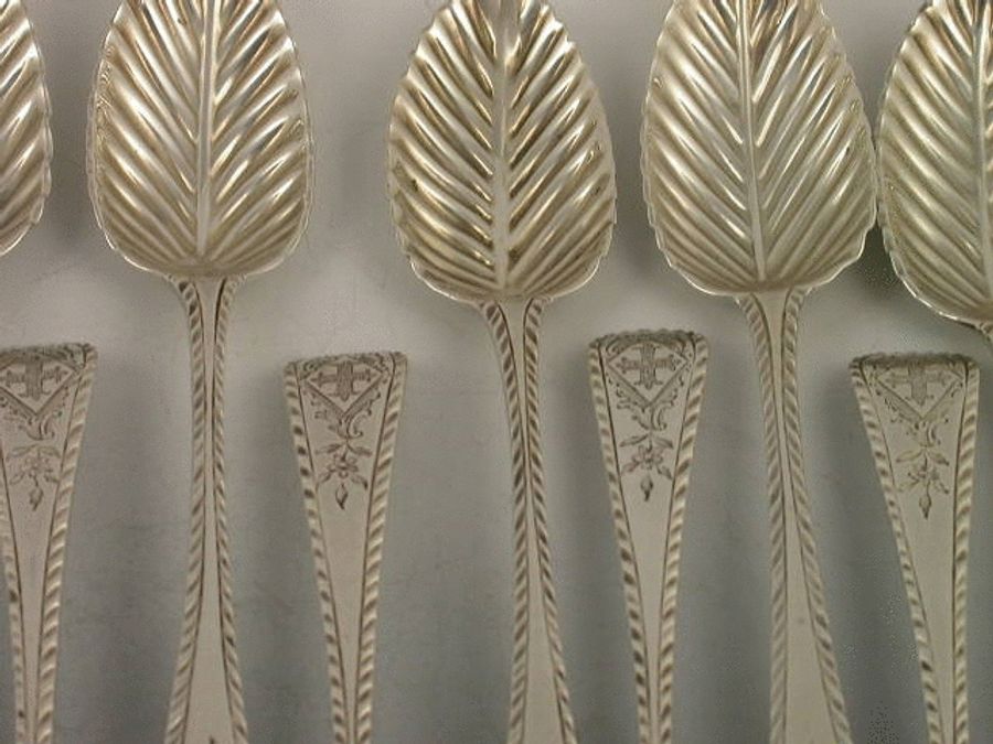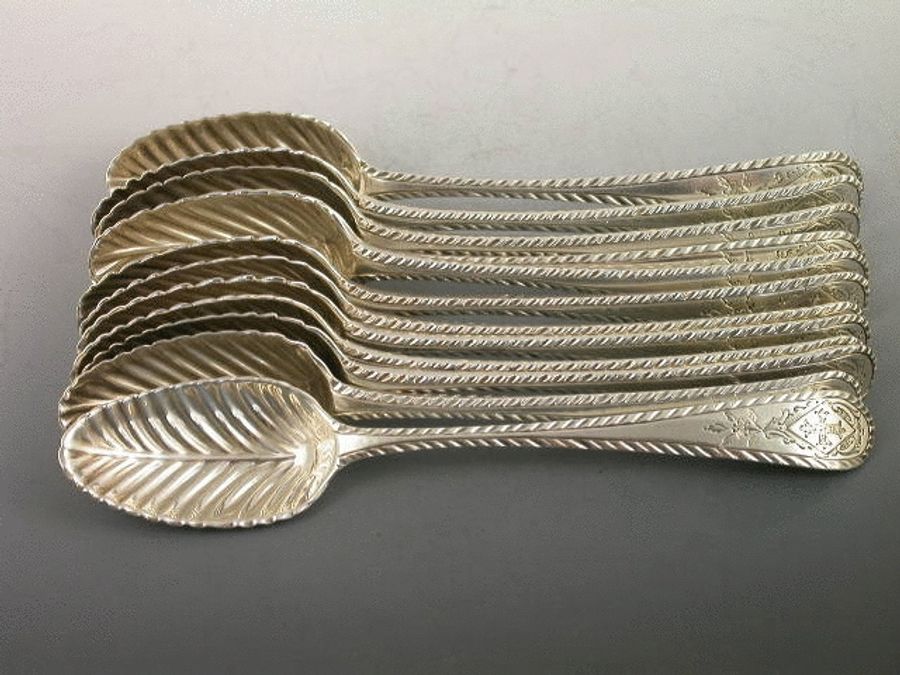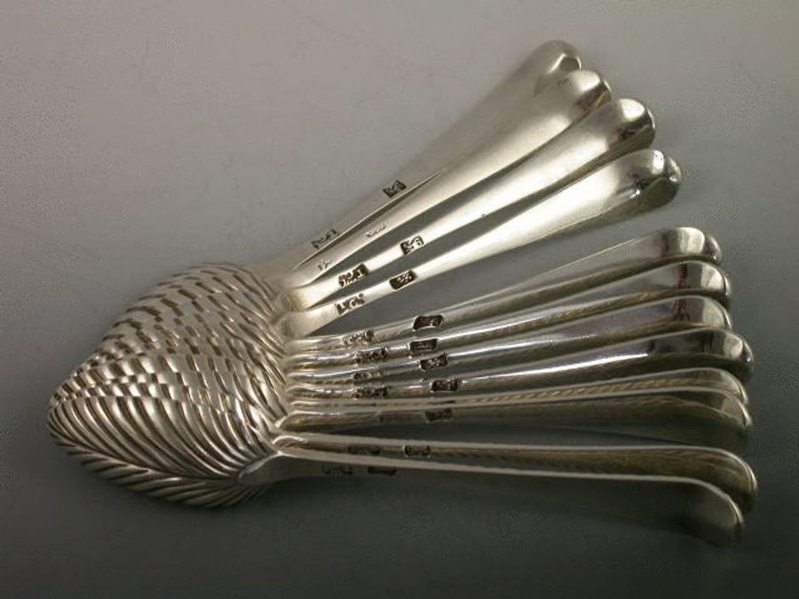 A superb set of twelve 18th century Georgian silver Teaspoons with fluted bowls and bright-cut engraved feather edged Old English pattern handles, the handles also engraved with an heraldic cross moline within a diamond shaped shield surrounded by scrolls and a flower head.