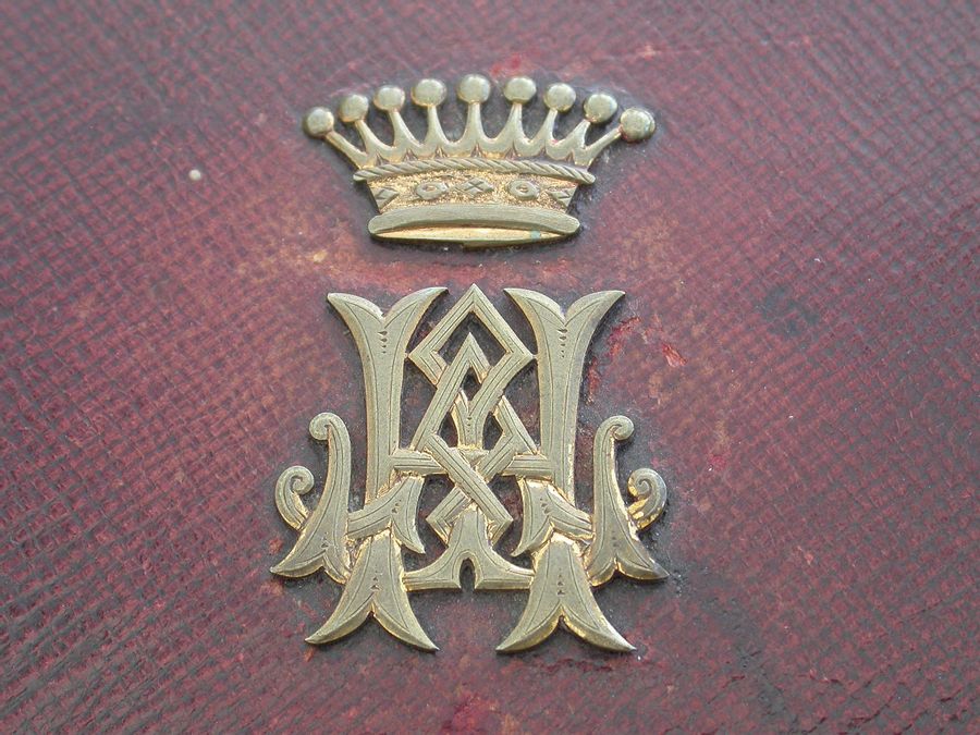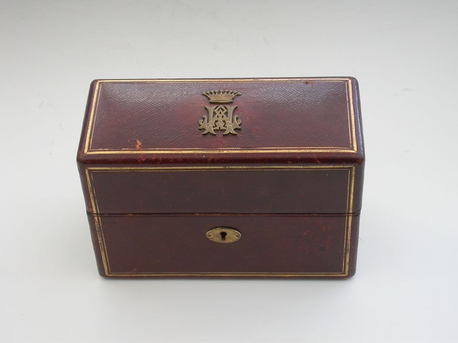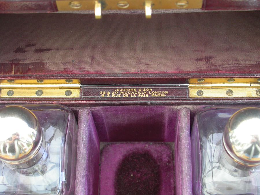 The leather case with retailers mark for Leuchars & Son, Picaddily, London and Rue De La Paix, Paris
