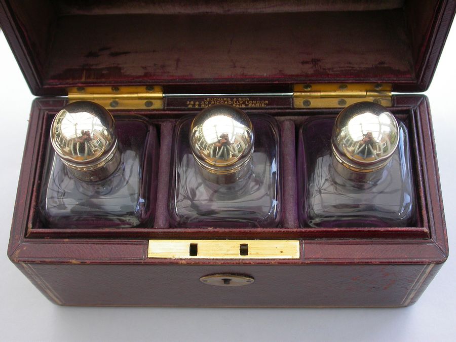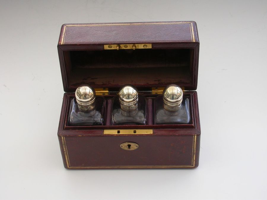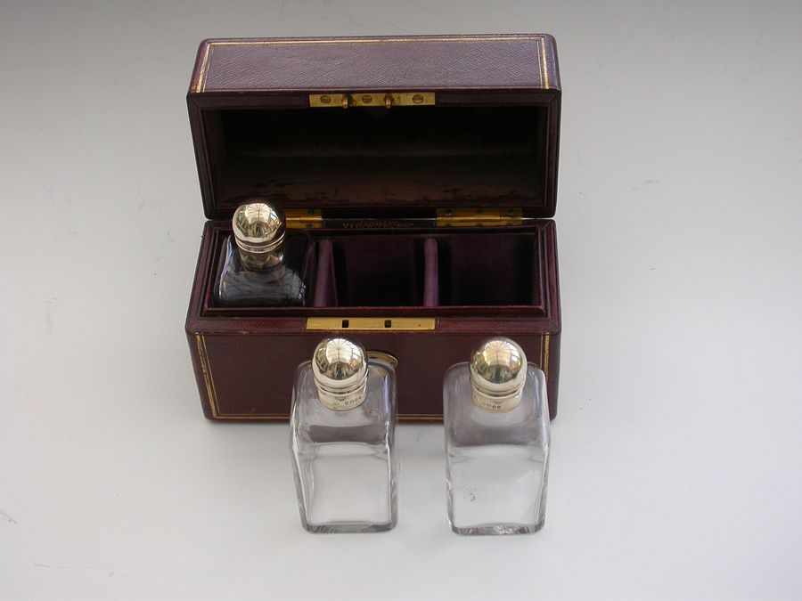 A fine quality set of three Victorian silver mounted glass Scent Bottles contained in a fitted gilded red Morocco leather Travelling Case with brass fitments and applied coronet and monogram.
